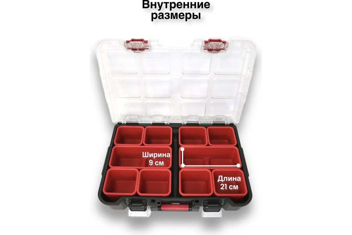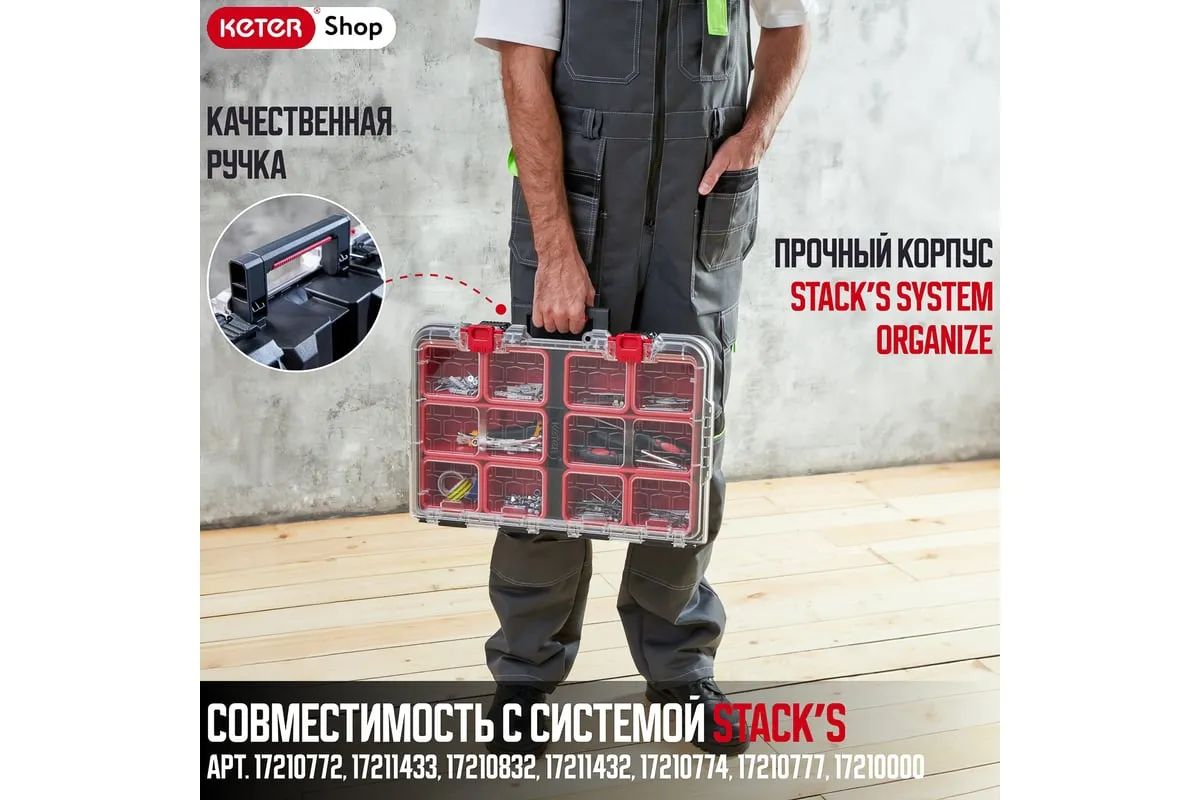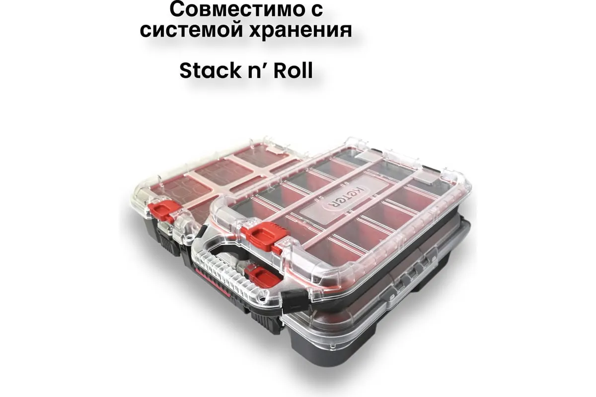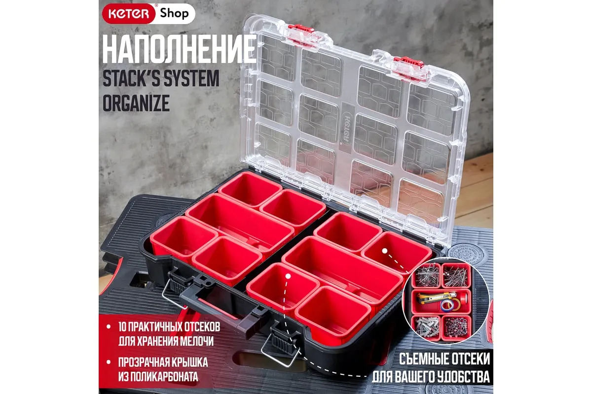 Небольшой органайзер оснащен прозрачной крышкой и съёмными лотками. Особенности Является частью системы Stack System.