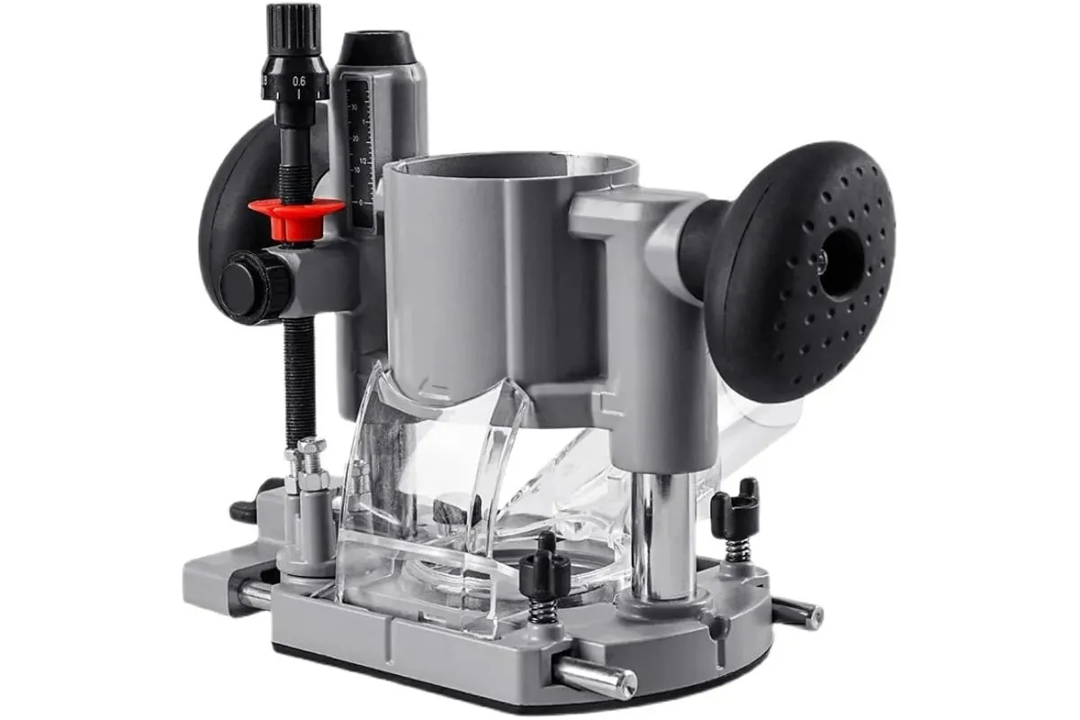Основание погружное для фрезера позволяет выполнять фрезеровку, врезаясь в любом месте изделия, т.е. в местах, расположенных не у кромки. Улучшает контроль за инструментом за счет двух рукояток.