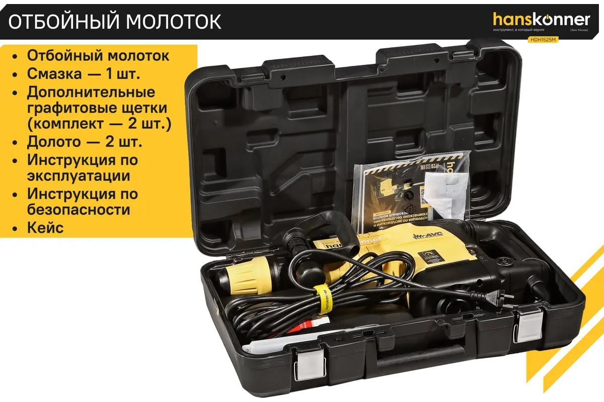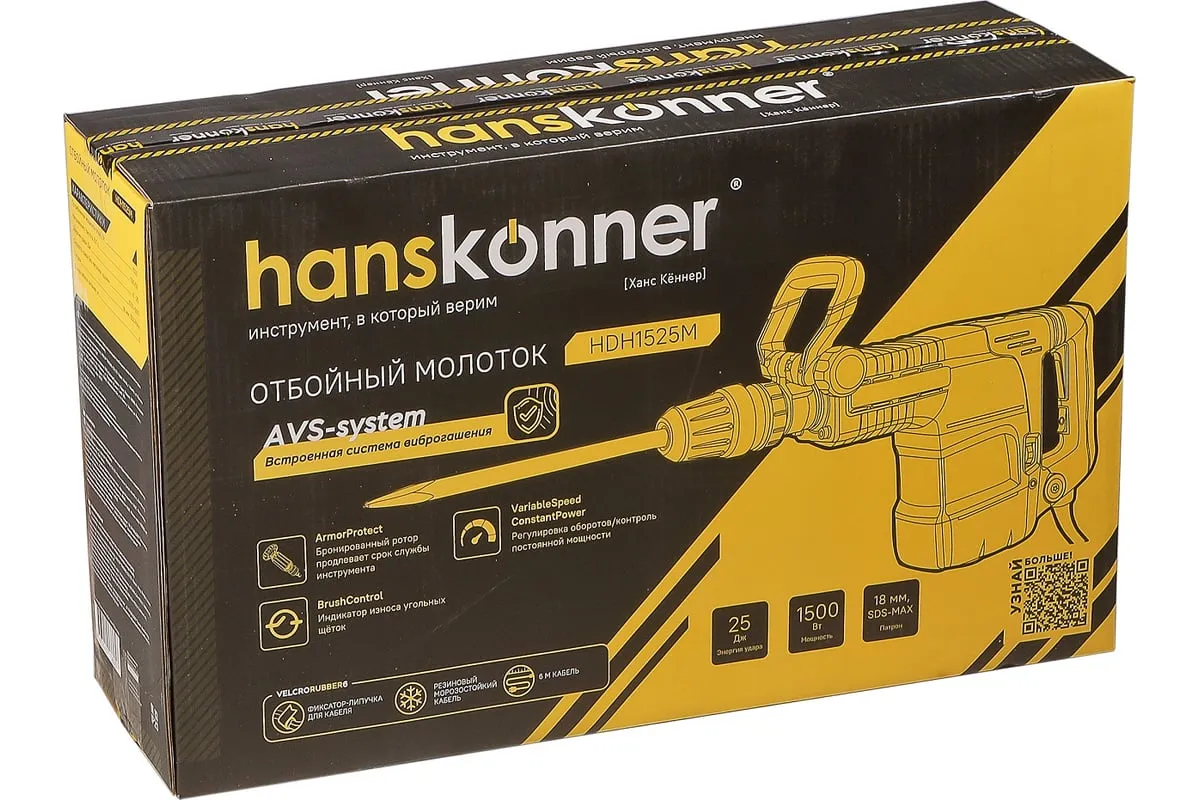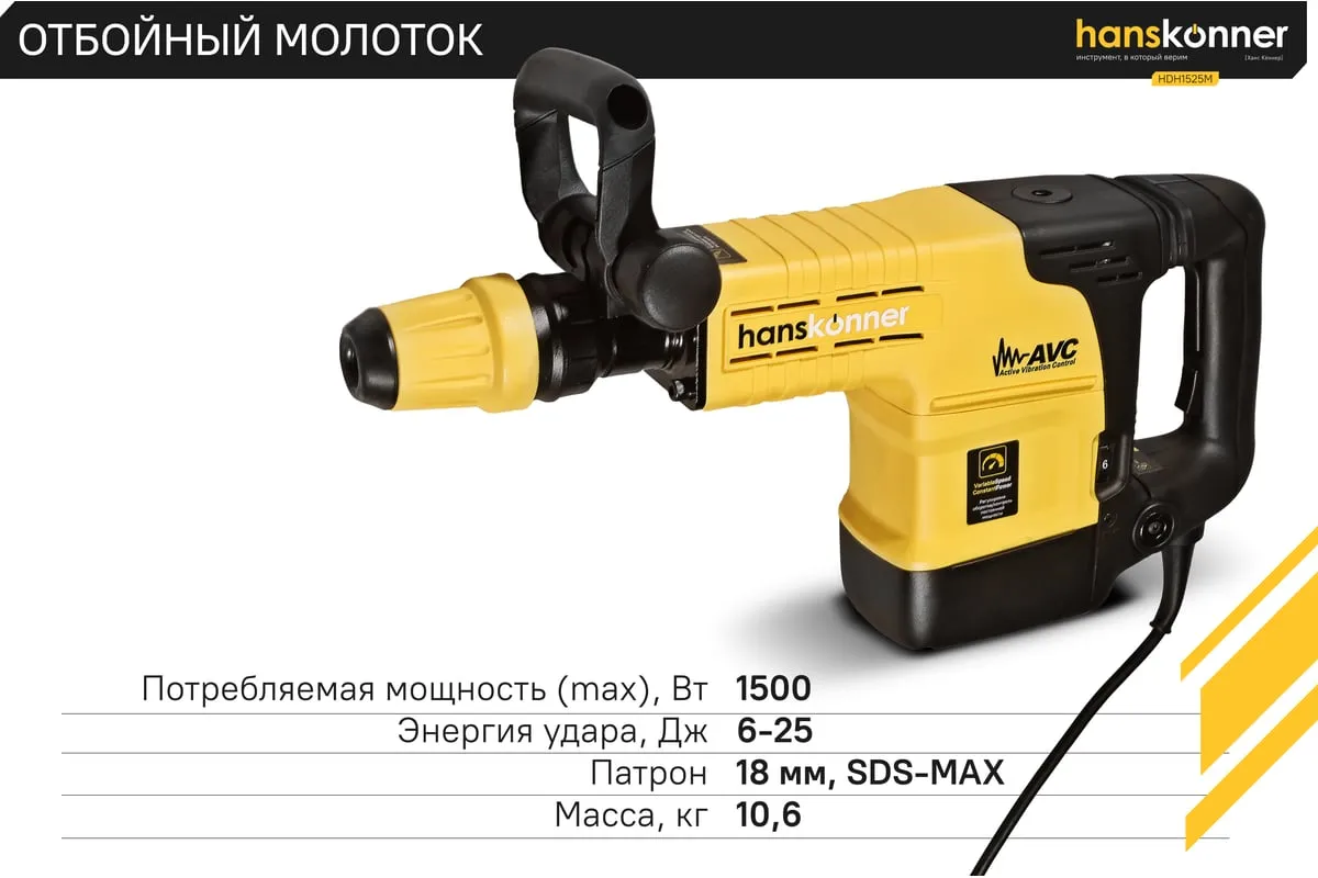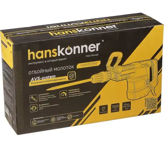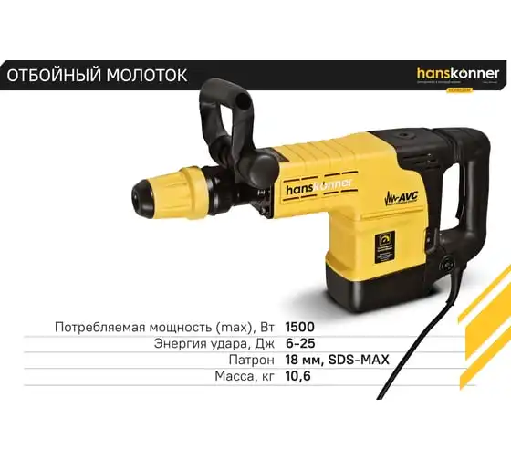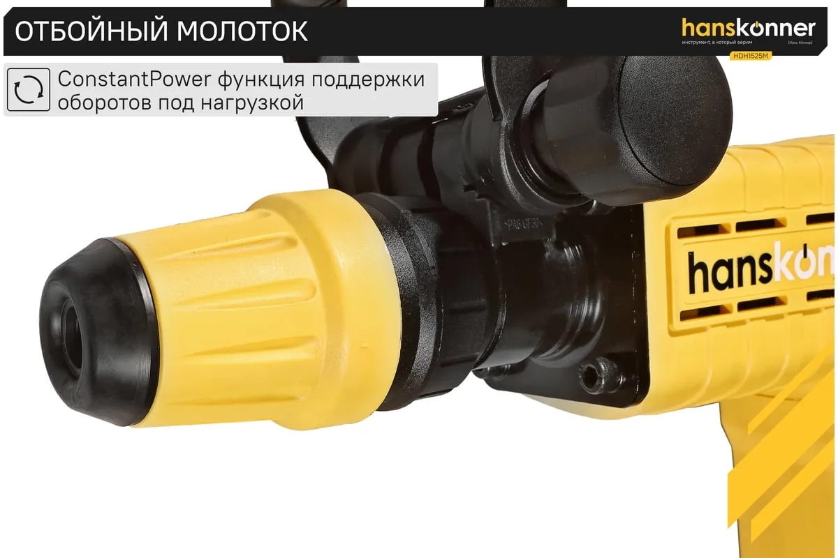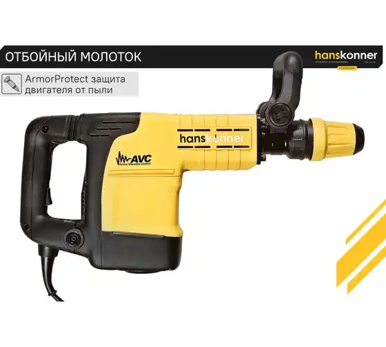 Отбойный молоток Hanskonner HDH1525M — мощный и практичный электроинструмент для разрушения конструкций из бетона, железобетона, кирпича и камня, дробления асфальтовых, бетонных и плиточных покрытий. Оптимальной настройке к проведению конкретной задачи содействует электронная регулировка оборотов, а контроль постоянства мощности способствует продуктивному выполнению работ. Модель отличается встроенной системой виброгашения «AVS-system», которая поддерживает удобство и безопасность при использовании молотка.