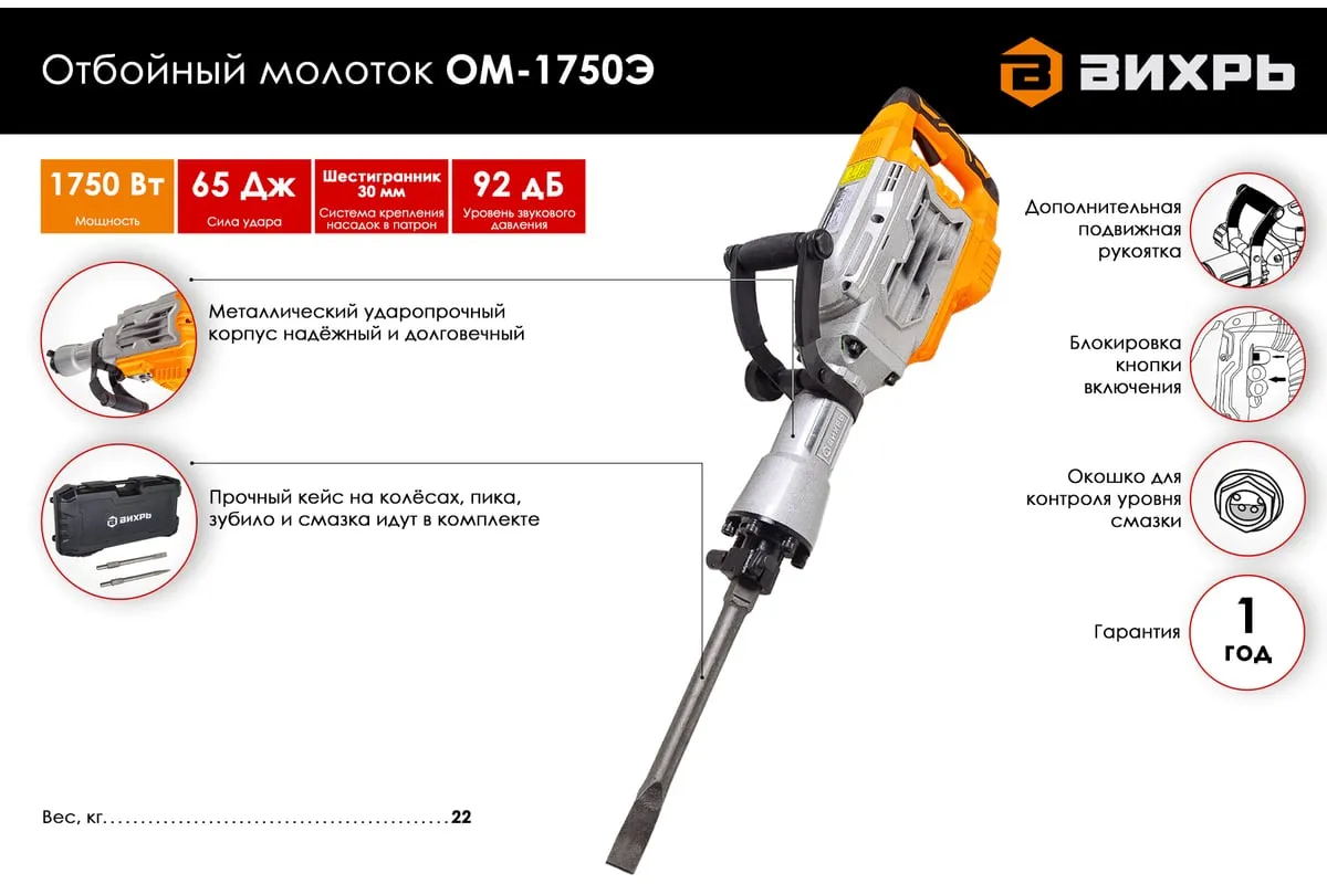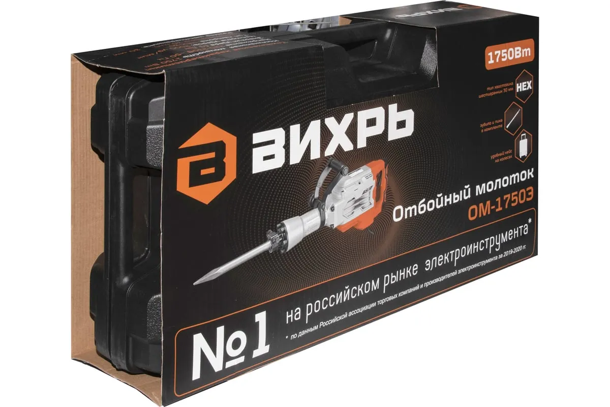 Отбойный молоток Вихрь ОМ-1750Э мощностью 1750 Вт используется для осуществления демонтажных работ. Для подключения электроинструмента требуется напряжение однофазной сети. Система крепления оснастки «шестигранник 30 мм» позволяет быстро и легко заменить пику или долото.