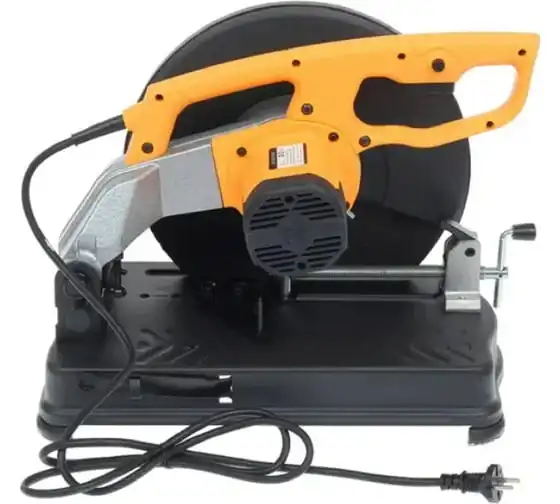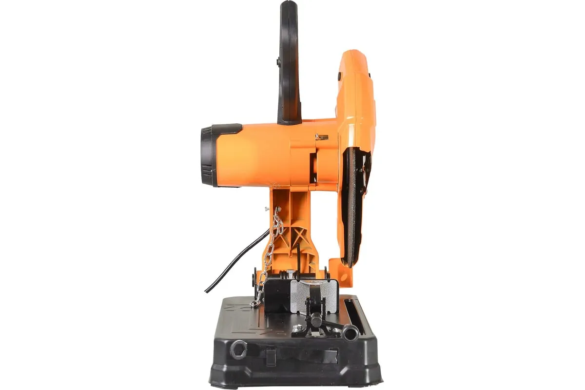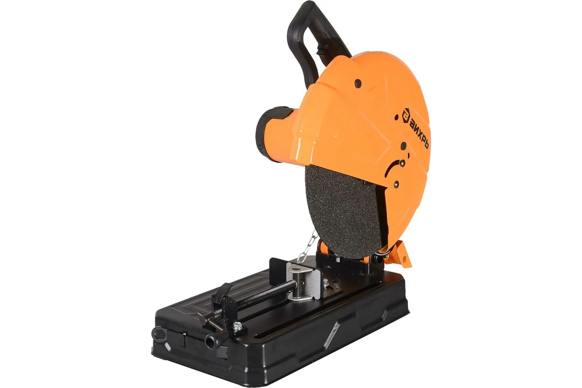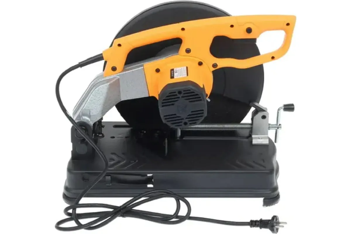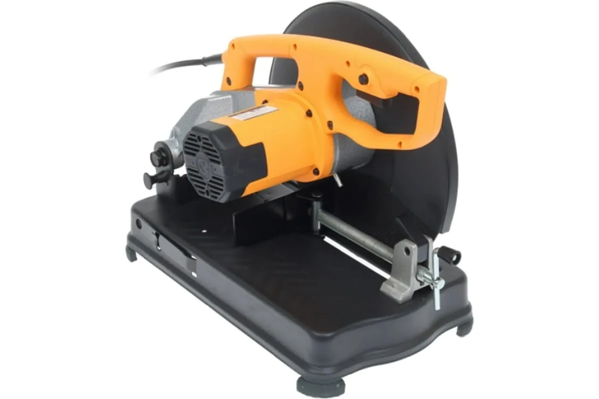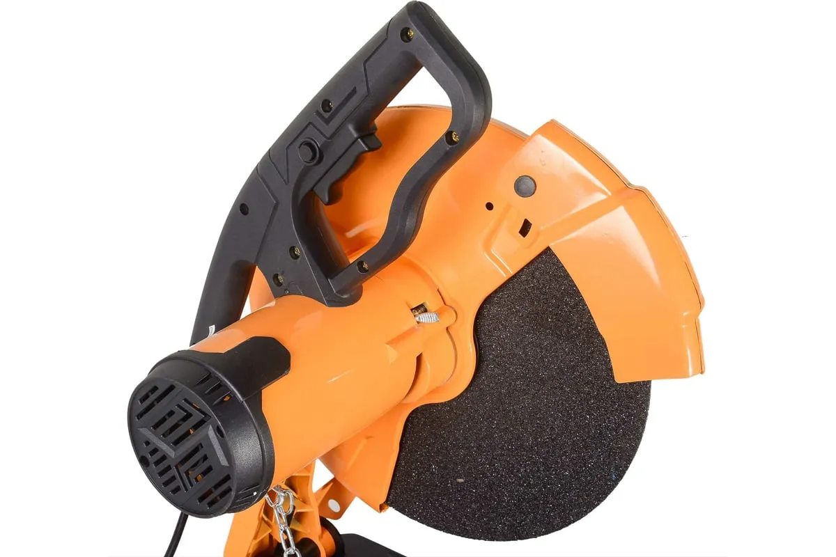 Кнопка запуска расположена на рукоятке. Для удобства выполнения серийных отрезных работ предусмотрена ее фиксация. Зажим в виде тисков позволяет производить резку под разным углом. Стопор, расположенный на корпусе инструмента, блокирует поворот диска для безопасной замены режущего элемента. Вентиляционные отверстия на корпусе препятствуют перегреву двигателя. Прочный металлический кожух надежно закрывает диск, защищая от стружки и искр.