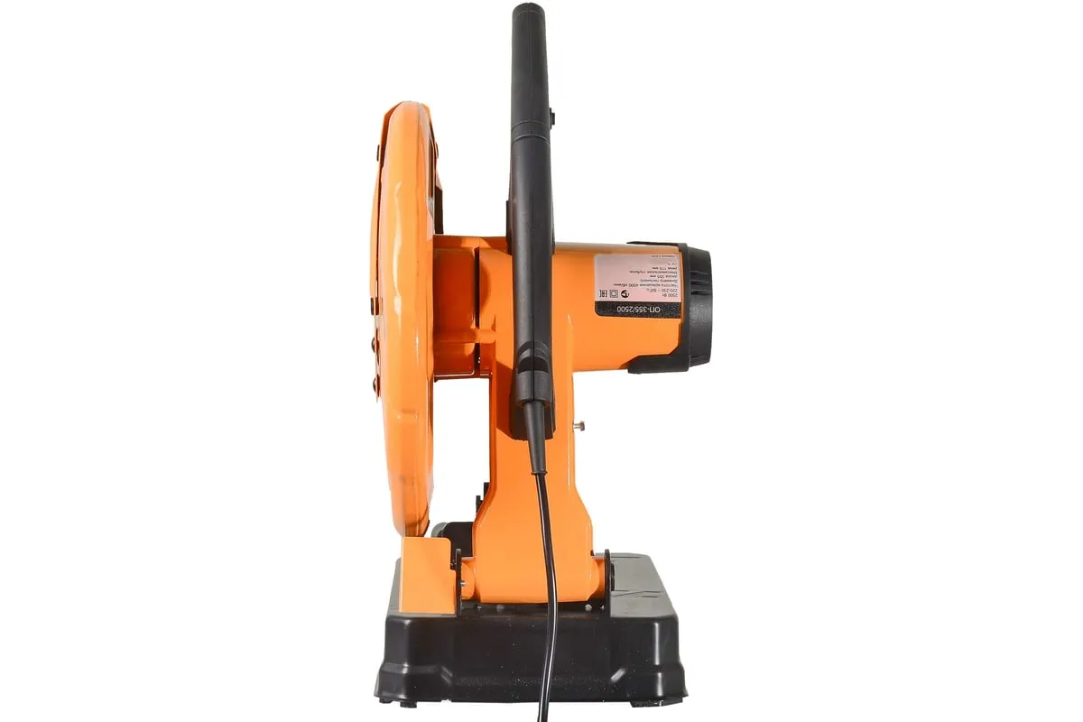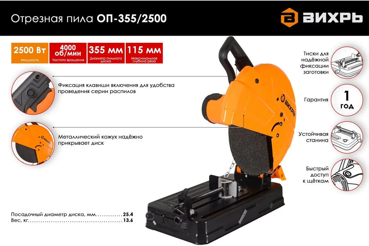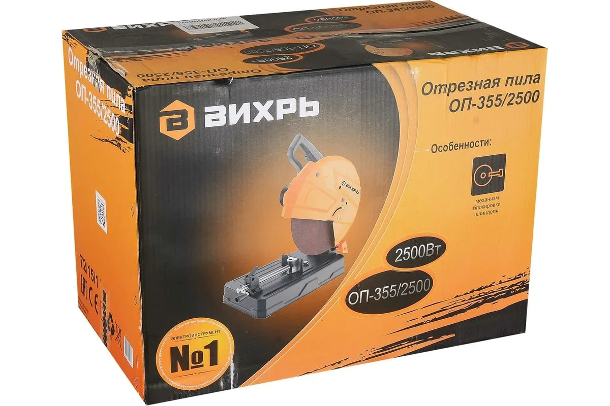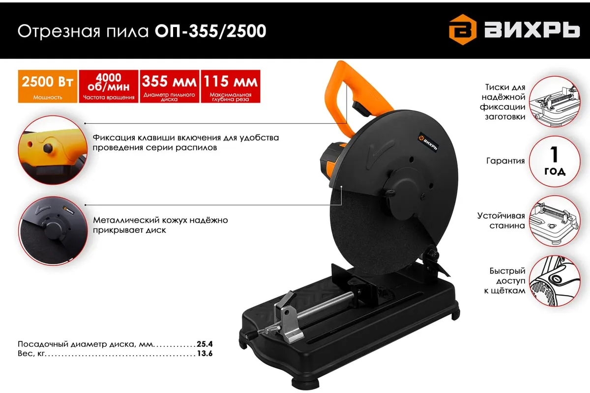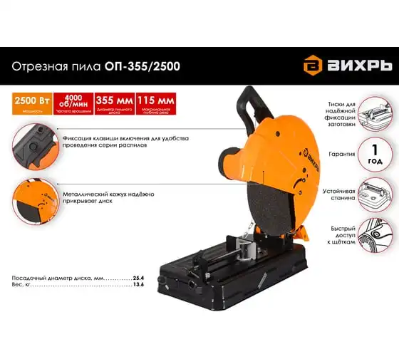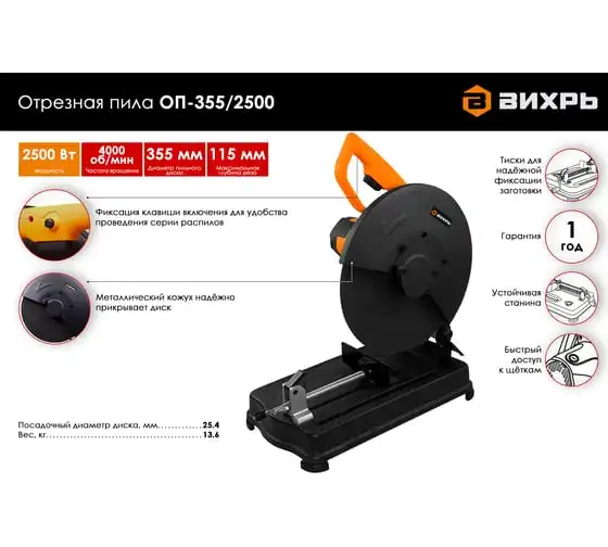 Отрезная пила Вихрь ОП-355/2500 с мощным щеточным двигателем 2500 Вт рассчитана на высокие нагрузки. Применяется для резки изделий из черных металлов: труб, прутьев, уголков, металлопрофиля. Пильный диск имеет диаметр 355 мм, что позволяет разрезать крупные заготовки на глубину до 115 мм. Максимальная скорость вращения диска на холостом ходу составляет 4000 об/мин. Это обеспечивает высокую производительность и чистый срез.