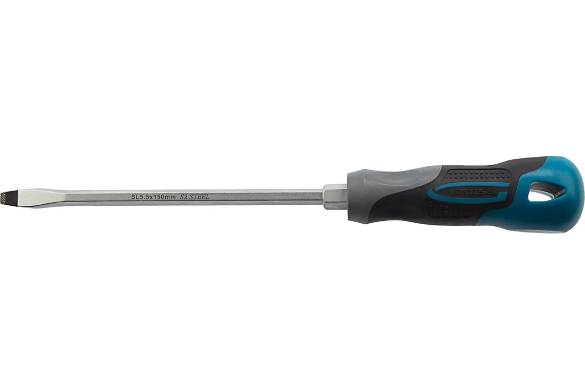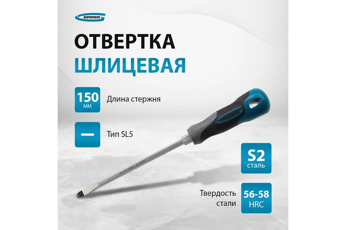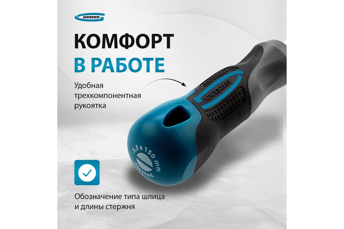 Отвертка GROSS SL5.5x150 мм 12112 предназначена для работы с резьбовыми соединениями, имеющими плоский шлиц. Максимальный крутящий момент затяжки достигает 5.5 Нм.