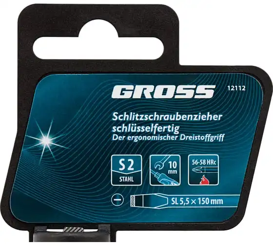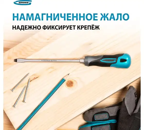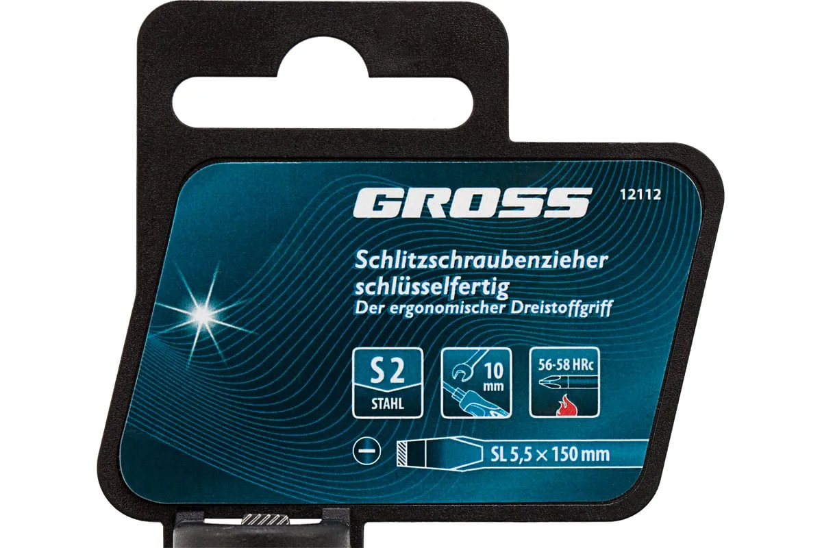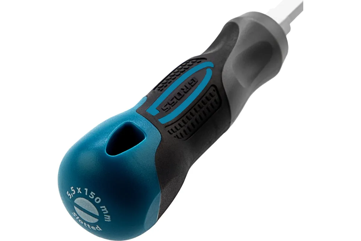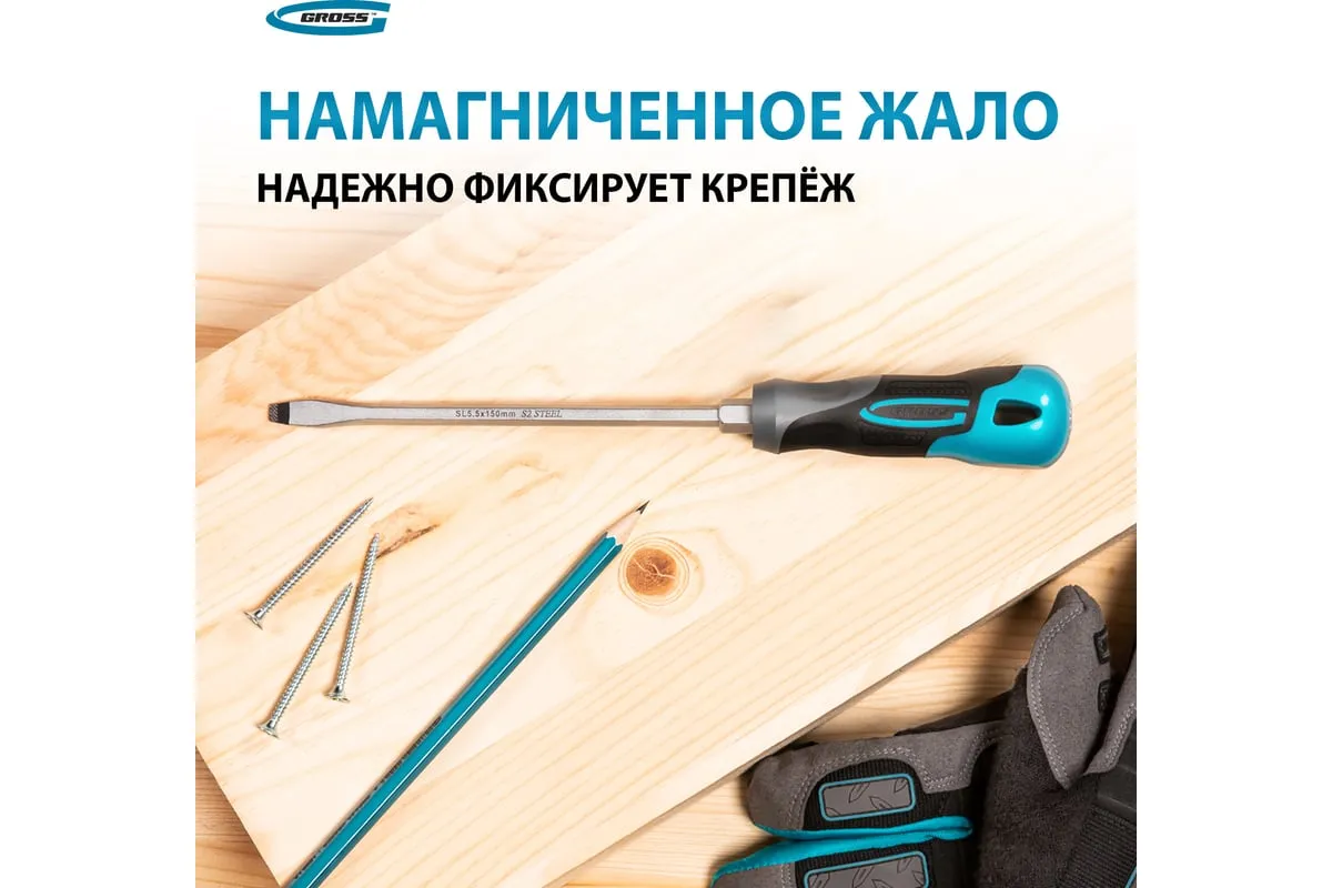 Отвертка GROSS SL5.5x150 мм 12112 предназначена для работы с резьбовыми соединениями, имеющими плоский шлиц. Максимальный крутящий момент затяжки достигает 5.5 Нм.