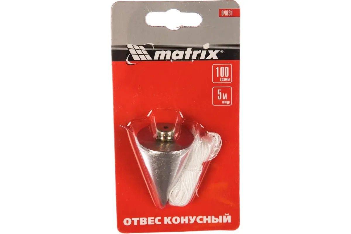 Конусный отвес Matrix 84831 массой 100 г, в комплекте со шнуром 5 м, используется для определения ровности или наличия отклонений у вертикальной плоскости. Корпус в форме конуса способствует отличной центровке.