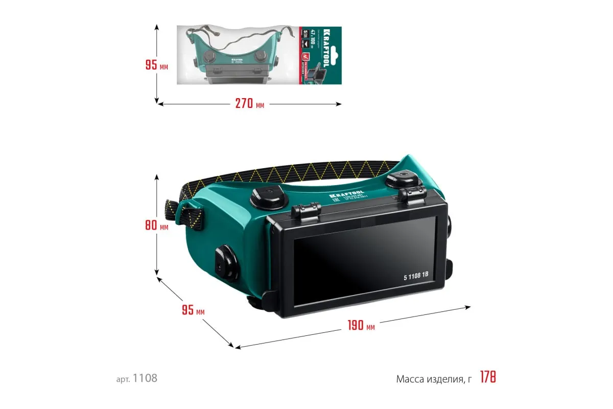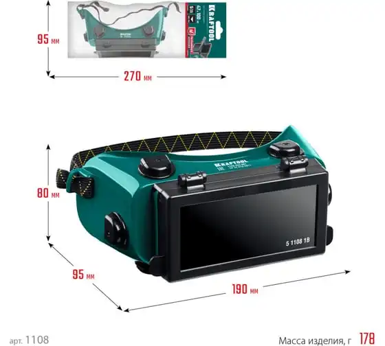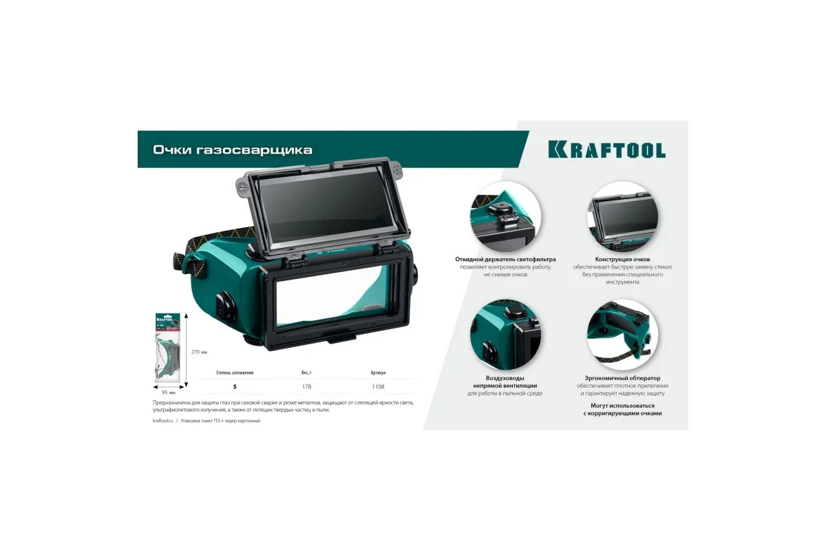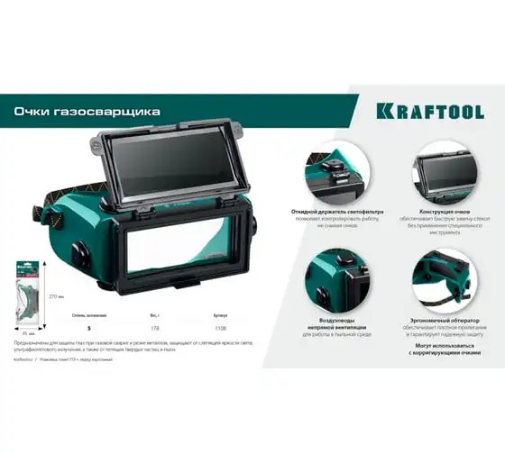 Панорамные очки газосварщика KRAFTOOL с откидным блоком 1108 Предназначены для защиты глаз при газовой сварке и резке металлов, защищают от слепящей яркости света, ультрафиолетового излучения, а также от летящих твердых частиц и пыли.