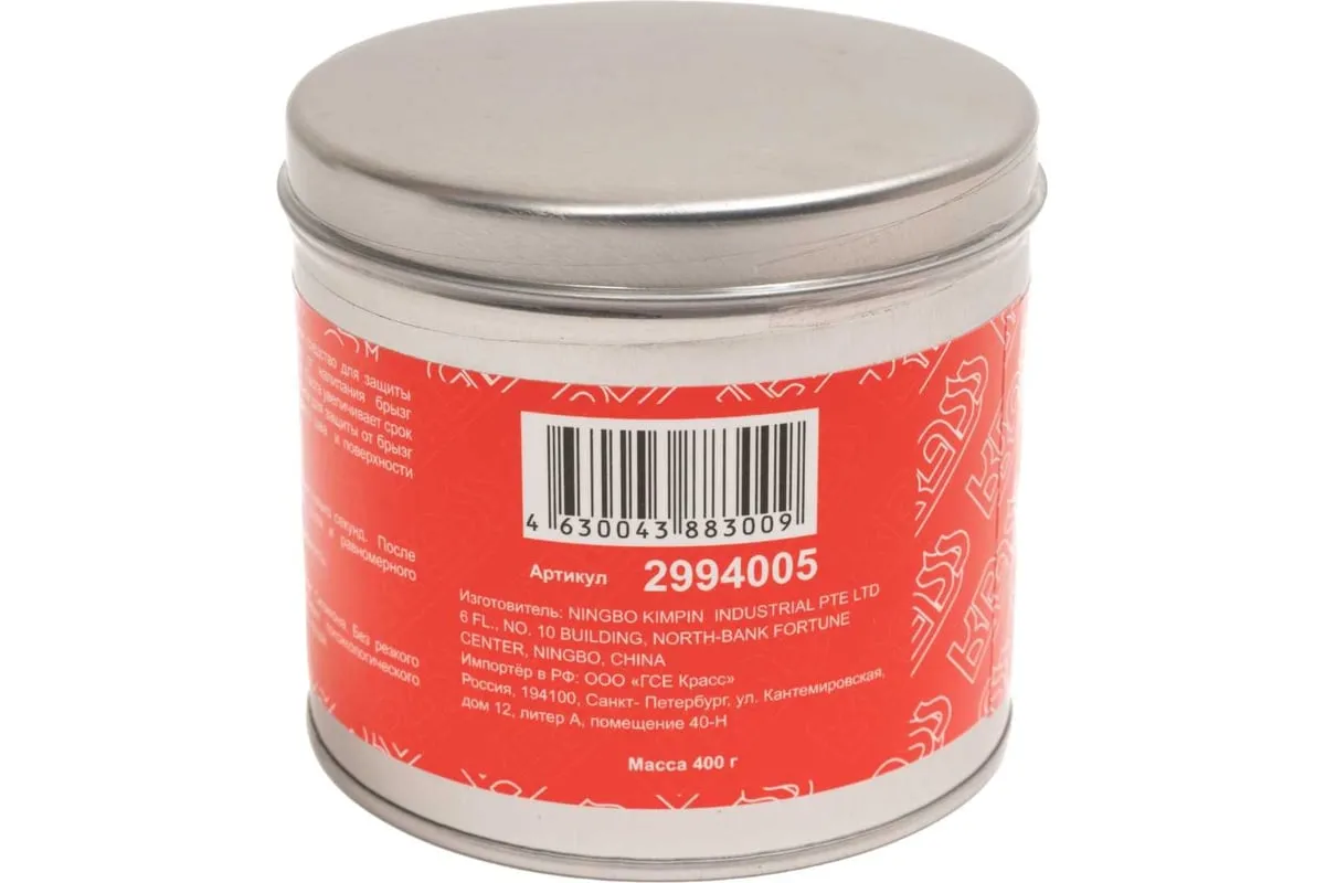 Паста антипригарная защитная J-5 400 г KRASS 2994005 —профессиональное средство для защиты расходных частей сварочных горелок (наконечников и сопел) от налипания брызг расплавленного металла и шлака при сварке в среде защитных газов. Паста увеличивает срок службы горелки. Так же пасту можно наносить на свариваемые детали для защиты от брызг расплавленного металла и уменьшения времени на очистку сварного шва и поверхности изделия.