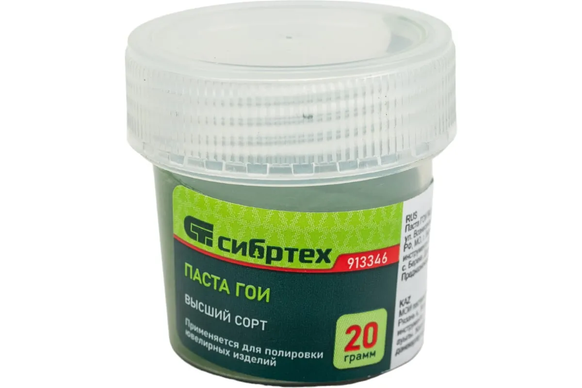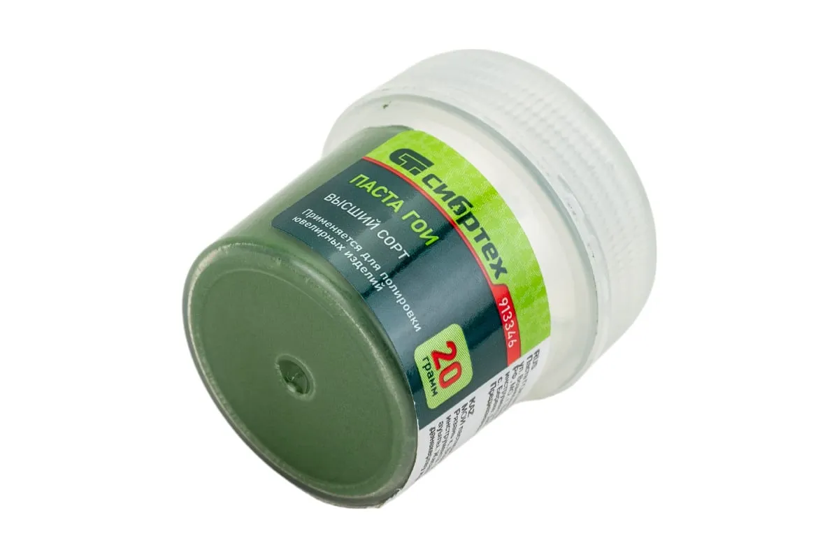 Паста ГОИ №3 Сибртех 913346, 20 гр. в банке, используется как для ручной полировки тканью, так и для машинной с помощью дрели или шлифмашины со специальной насадкой. Универсальная паста подходит для работы с ювелирными изделиями, металлом, пластиком и стеклом. Благодаря ей можно защитить поверхности от механических повреждений, исправить косметические дефекты и придать им зеркальный блеск.
