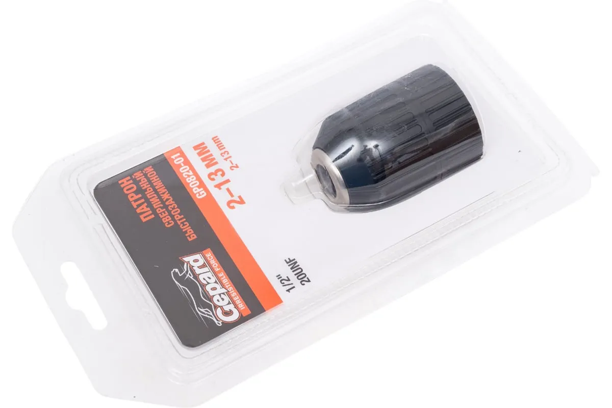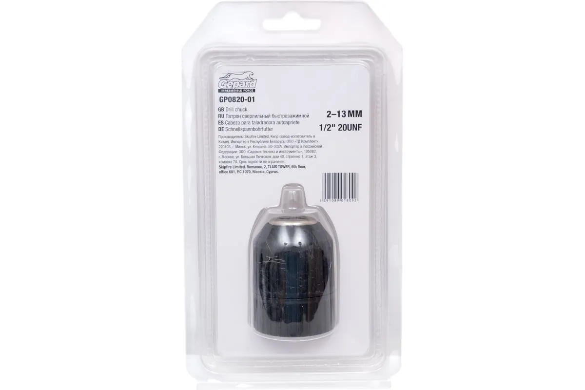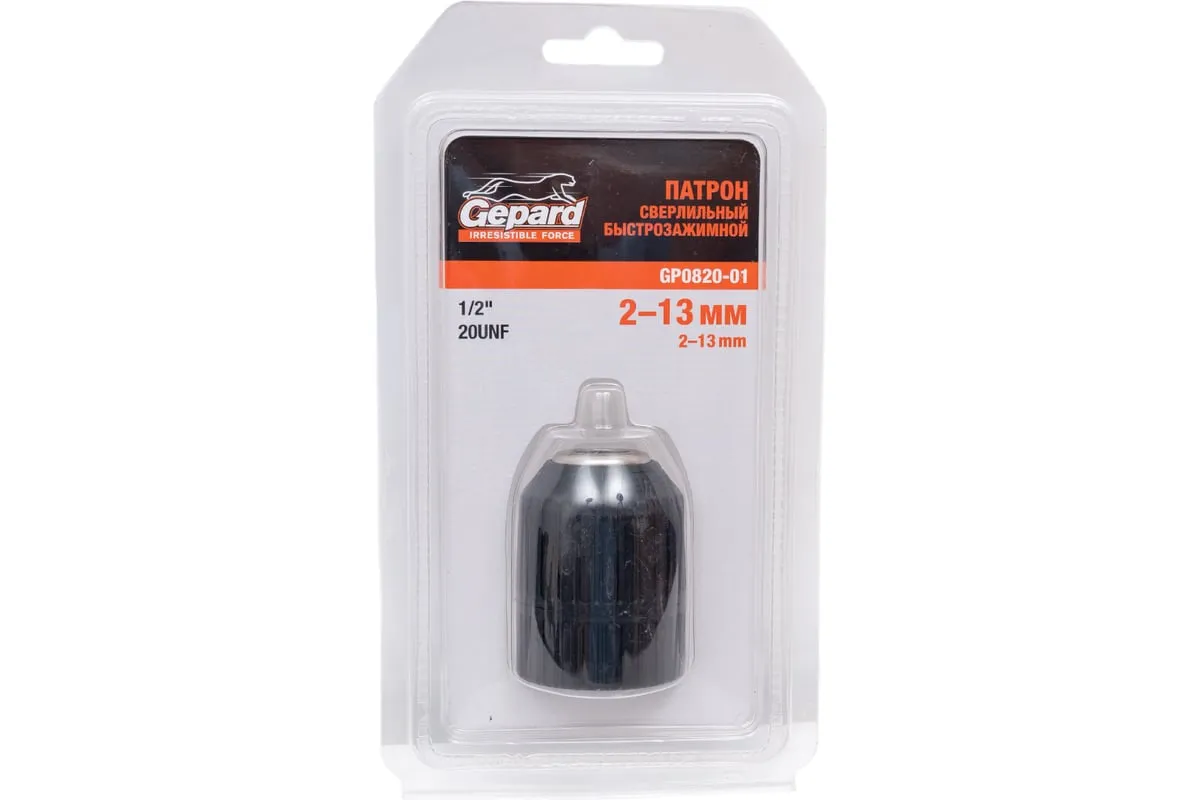 Патрон быстрозажимной 13 мм, 1/2" Gepard GP0820-01 имеет большой запас прочности, надежен и долговечен в использовании. Патрон предназначен для установки на дрели, в том числе ударные, посредством посадочной резьбы 1/2" и имеет фиксатор для облегчения демонтажа патрона. Диаметр цилиндрического основания зажимаемого сверла может быть равен от 1.5 до 13 мм.
