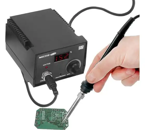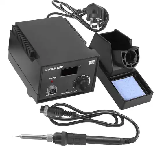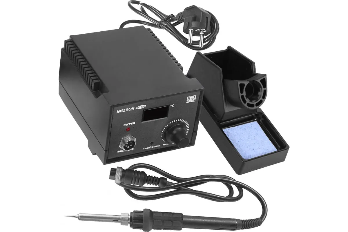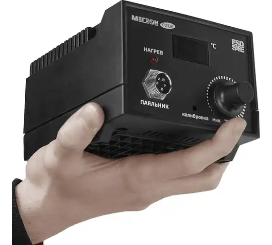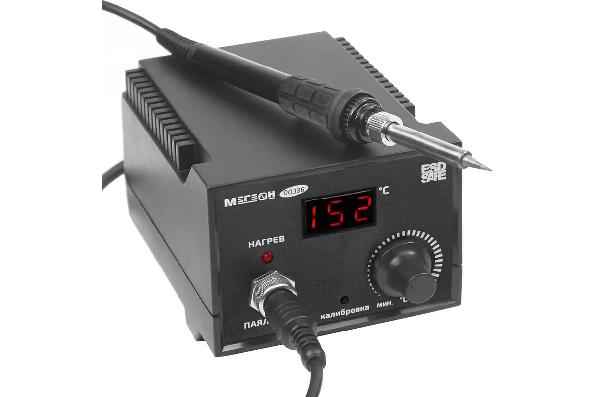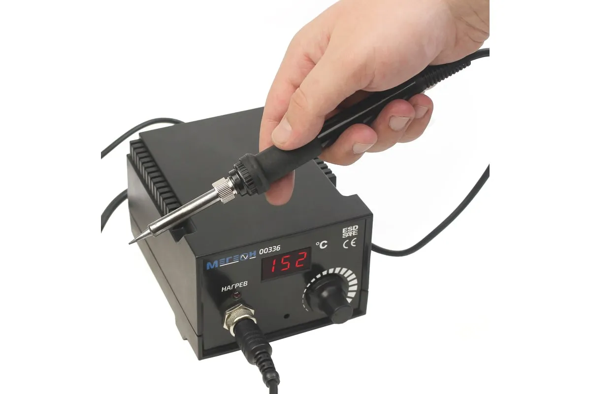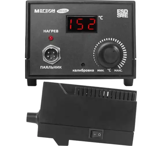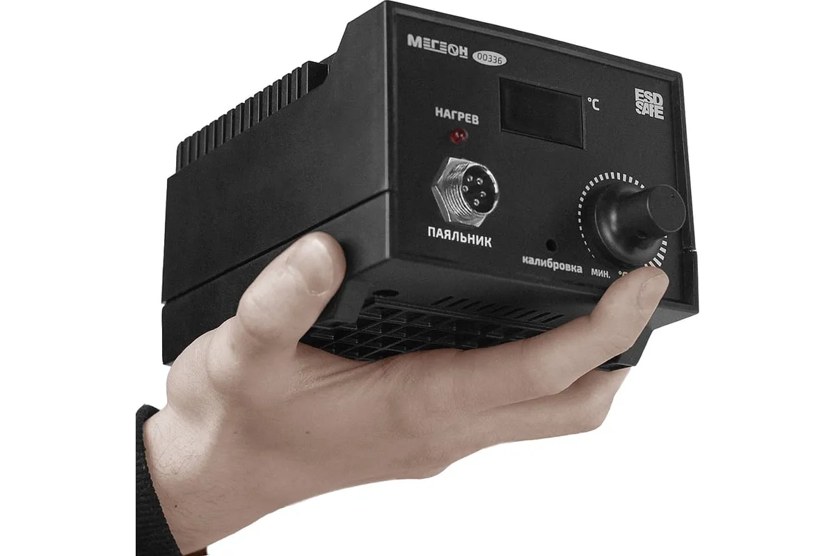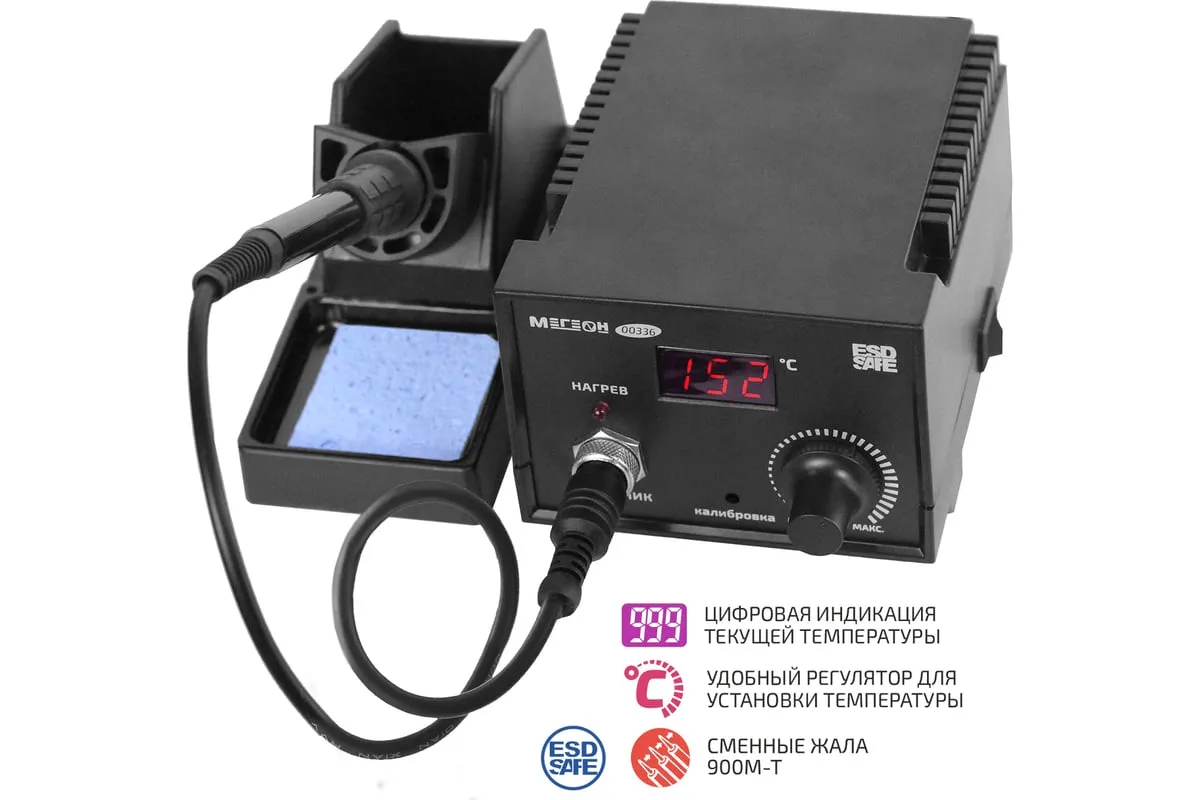 Паяльная станция МЕГЕОН 00336 к0000019535 – это удобный паяльник с ярким светодиодным дисплеем и аналоговым регулятором установки температуры. Немаловажным преимуществом при работе с паяльником является маленький вес, мягкий провод и компактные размеры блока управления. На рукоятке предусмотрена резиновая наклдака противоскольжения. Жало паяльника имеет распространённый типоразмер 900М-Т. Благодаря этому имеется большое количество сменных наконечников разной формы и размеров (в комплект не входят) для осуществления специфической пайки. В дополнение к написанному можно добавить ещё одно преимущество и это автоматическое поддержание установленной температуры паяльника. Для исключения повреждения радиокомпонентов статическим электричеством станция имеет фунцию антистатической защиты. Прибор по достоинству оценят профессионалы и любители.