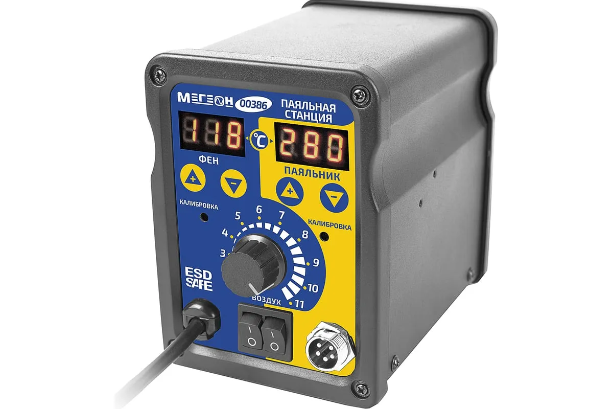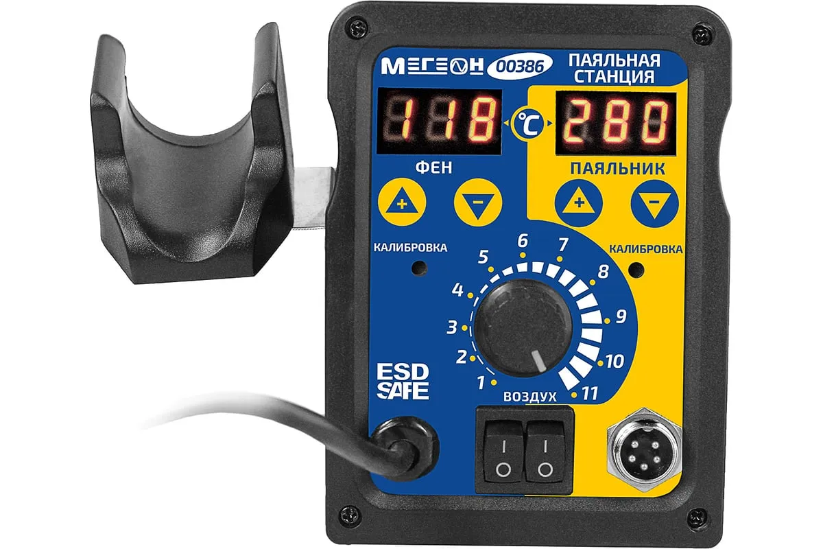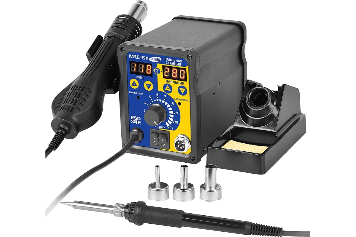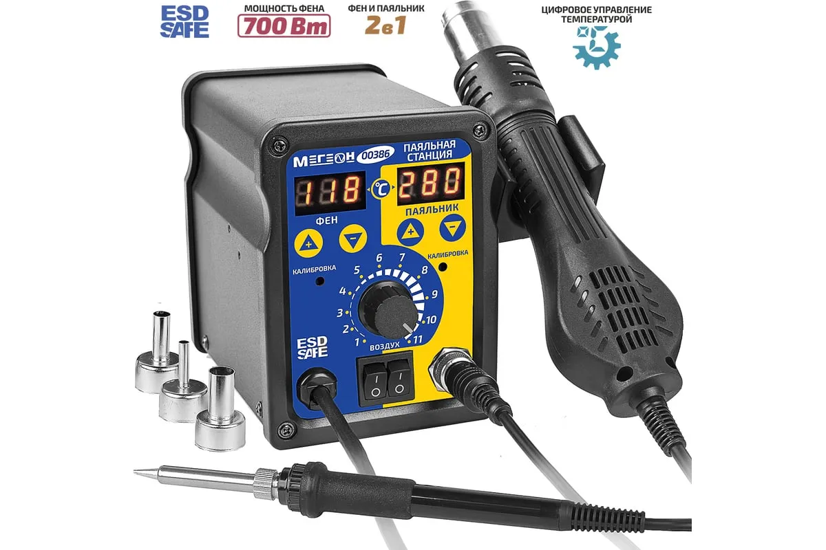 Паяльная станция МЕГЕОН 2 в 1 00386 к0000036392 - надежная и очень удобная паяльная станция 2 в 1, состоящая из термофена с центробежным нагнетателем и паяльника. Имеет компактные размеры блока управления и небольшой вес.