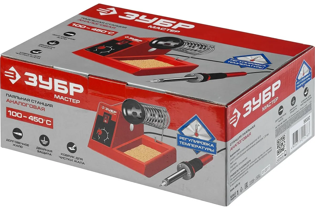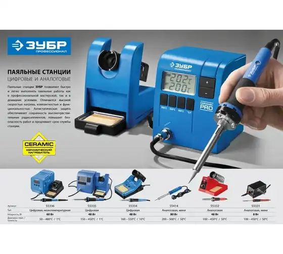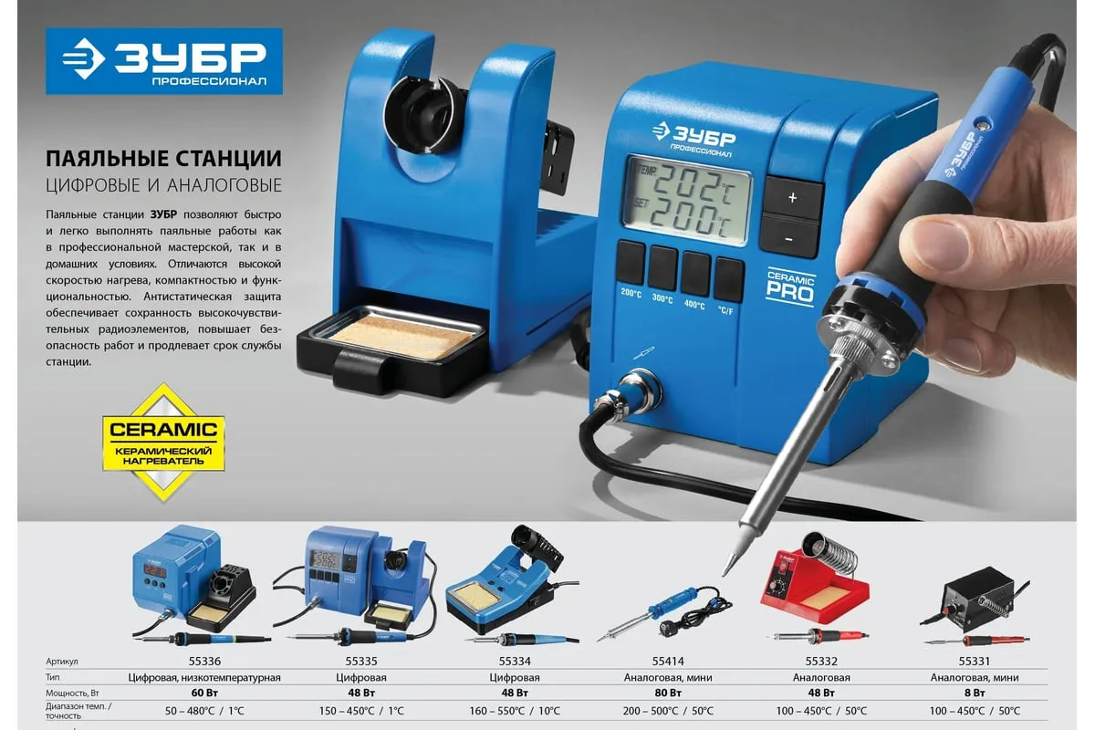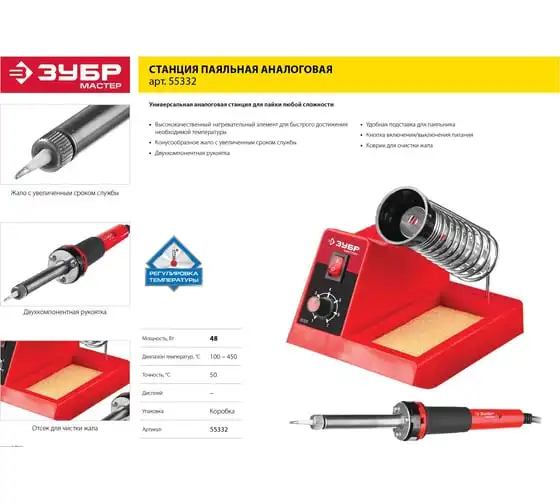 Паяльная станция ЗУБР 48Вт, 100-450°C, ПС-50А 55332 позволяет быстро и легко выполнять паяльные работы как в профессиональной мастерской, так и в домашних условиях. Отличается высокой скоростью нагрева, компактностью и функциональностью. Антистатическая защита обеспечивает сохранность высокочувствительных радиоэлементов, повышает безопасность работ и продлевает срок службы станции. Паяльная станция применяется для паяльных работ, требующих бережной пайки при определенной температуре. Станция особенно удобна при пайке электронных плат и других мелких деталей, поскольку поддерживает заданную температуру и не нуждается в отключении от электросети во время работы.