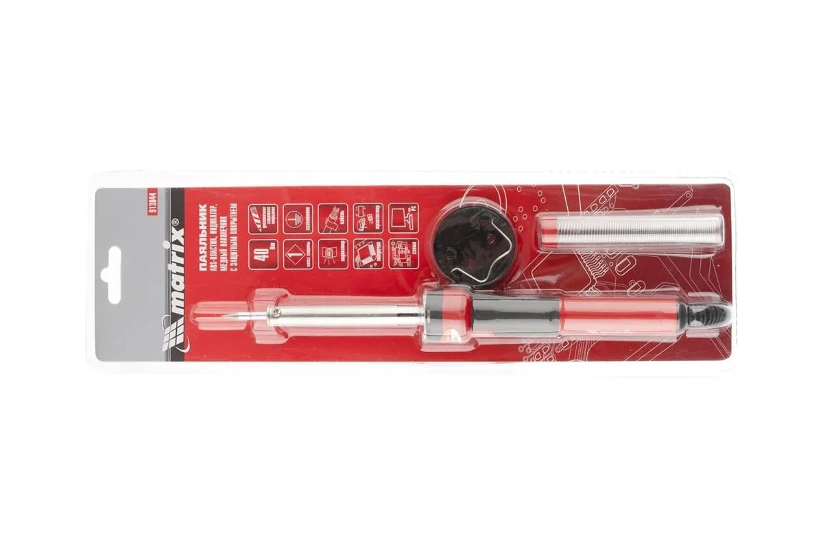 Паяльник 220В, 40W MATRIX 913044 - ручное электротехническое приспособление непрерывного нагрева, которое предназначено для проведения небольших паяльных работ в бытовых условиях. Изделие относится к первому классу защиты, соответствует всем требованиям по безопасности.