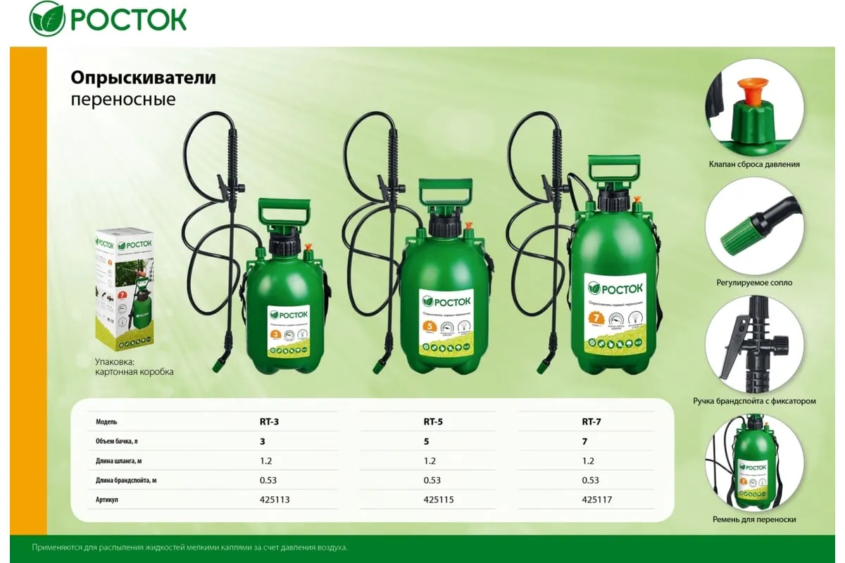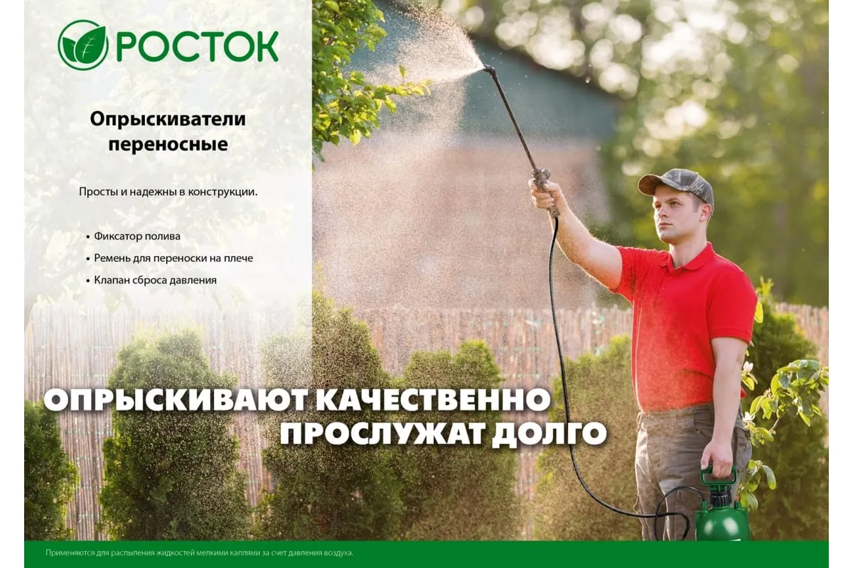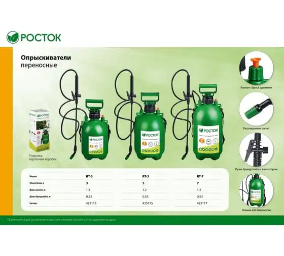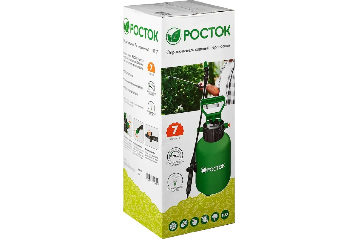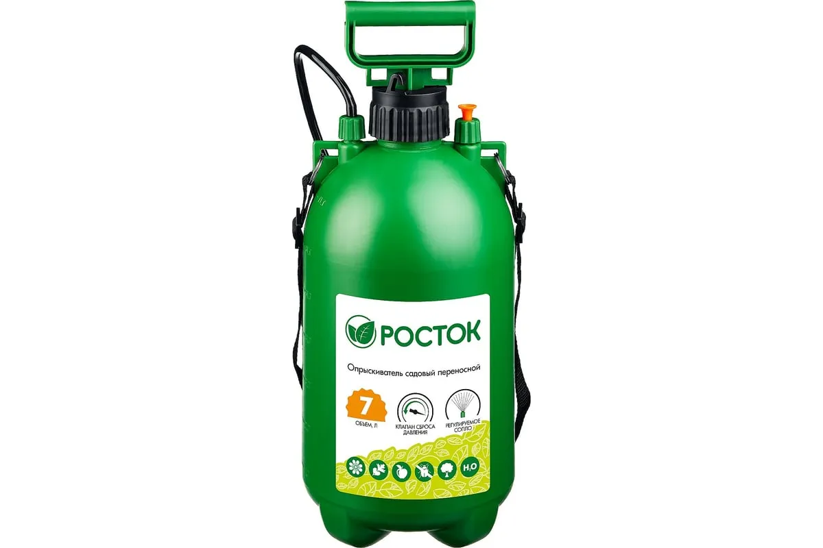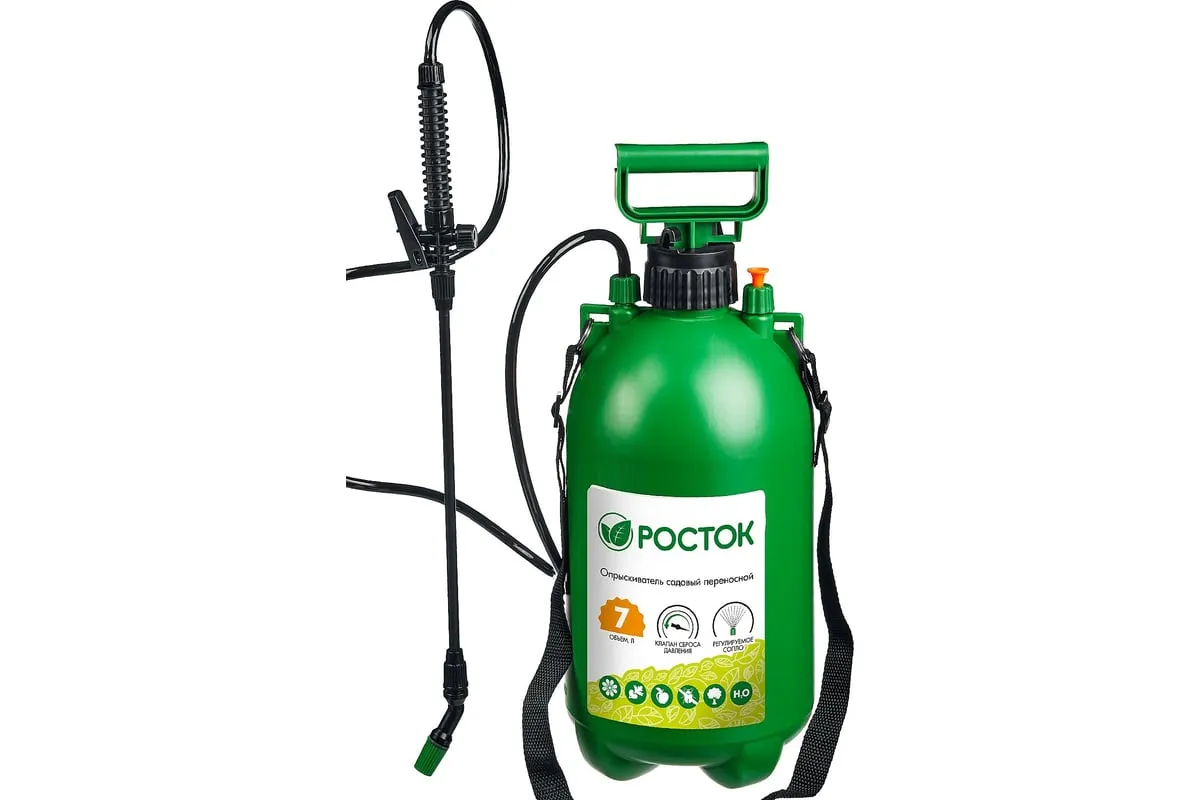Переносной опрыскиватель РОСТОК RT-7 7 л, с фибергласовым удлинителем 425117 используется для работ по защите садовых или домашних растений. Имеется клапан сброса давления и регулируемое сопло. Данный опрыскиватель на 8 литров можно использовать для дезинфекции помещений.
