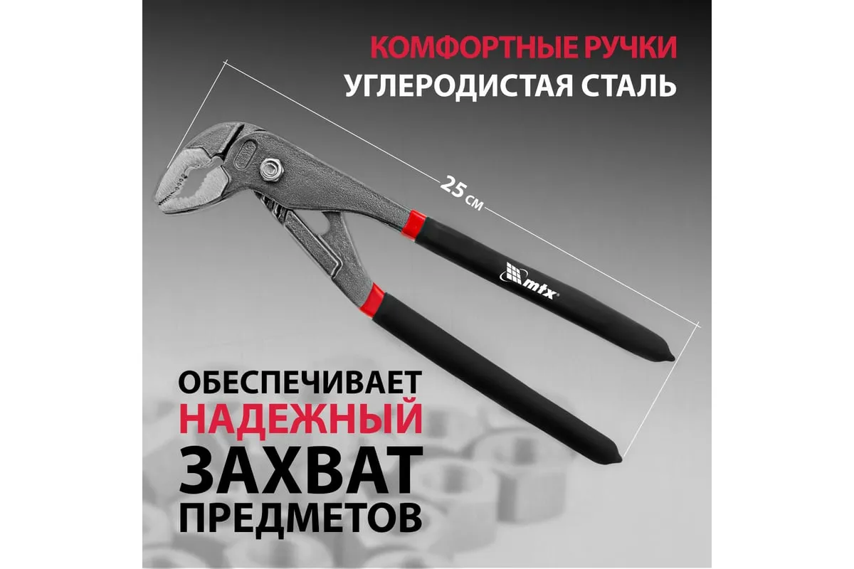 Переставные клещи 250 мм MATRIX 15708 - это надежный ручной инструмент, применяемый для захвата различных предметов. Может использоваться в качестве трубного или разводного ключа. Рабочая часть изготовлена из углеродистой стали. Благодаря наличию острой насечки на губках облегчается захват предметов, не имеющих рабочих профилей. Двухцветные обливные рукоятки обеспечивают надежный захват в руках.