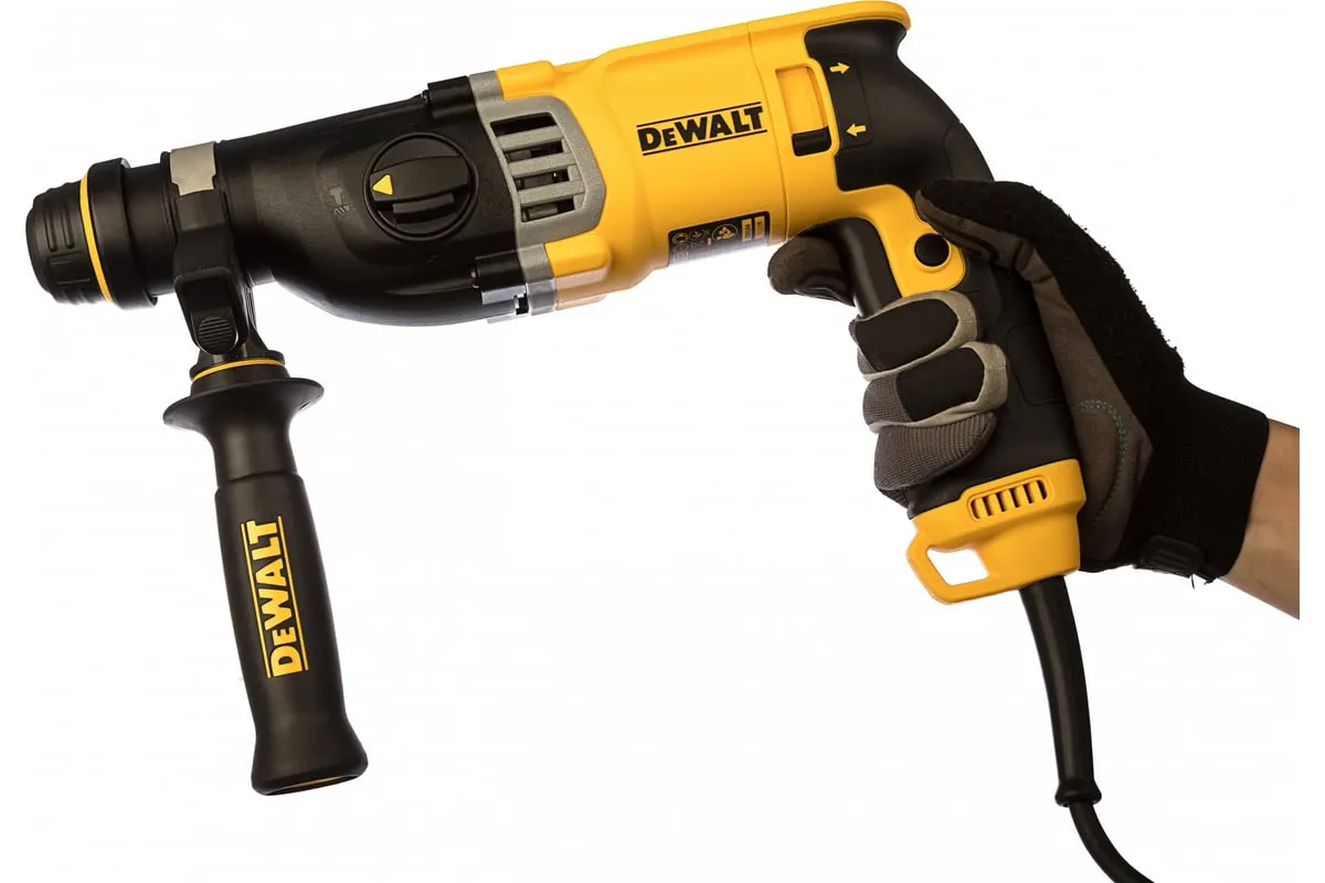 Перфоратор DeWalt D 25143 K имеет три режима работы: сверление, сверление с ударом, долбление. Переключение между ними осуществляется с помощью тумблера сбоку на корпусе. Предохранительная муфта защищает оператора и сам инструмент при блокировании оснастки в материале. Модель поставляется в чемодане, в котором её удобно хранить и транспортировать.