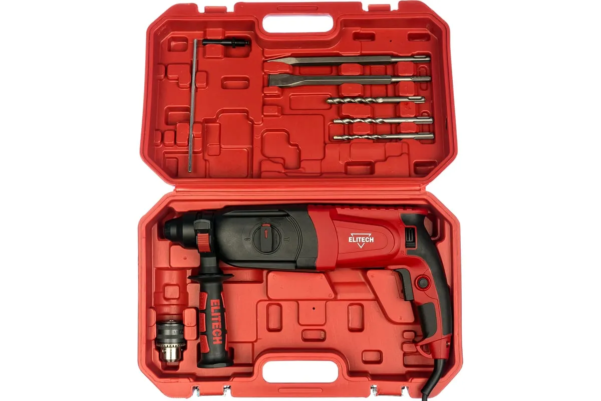 Перфоратор Elitech П 1032РЭМ - профессиональный инструмент с тремя режимами работы: сверление, сверление с ударом и долбление. Также имеется режим поворота долота. Он работает с такими материалами, как бетон, кирпич, камень, плитка. Благодаря патрону SDS-plus замена оснастки осуществляется быстро и легко. Дополнительная регулируемая рукоятка упрощает работу в труднодоступных местах. Модель оснащена функцией реверса - для легкого выкручивания сверла из материала. Поворотный щеткодержатель увеличивает рабочий ресурс угольных щеток и обеспечивает равную мощность в обоих направлениях сверления. Чемодан решает вопрос хранения и транспортировки.