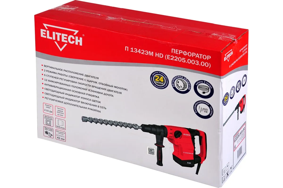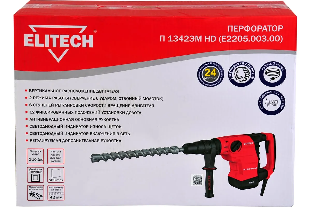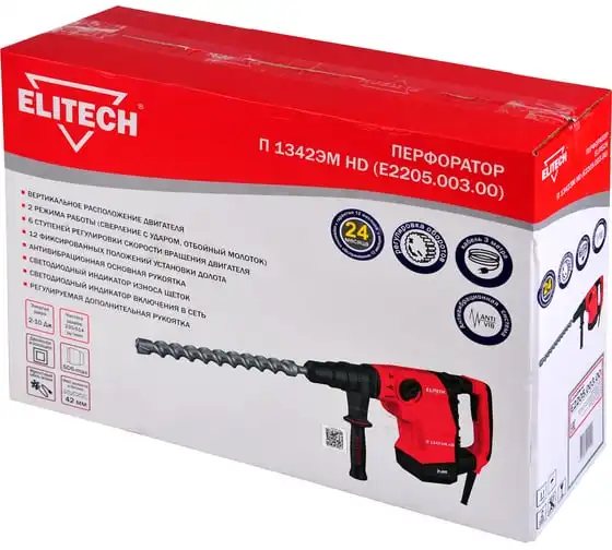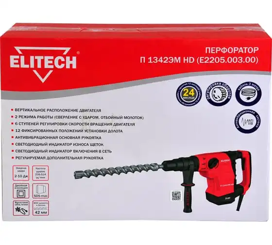 Количество режимов 2 (сверление с ударом, отбойный молоток). Регулировка положения зубила (12 положений). Регулировка оборотов двигателя. Энергия удара 2-10Дж. Предназначен для работы с буром, диаметром до 42мм и коронкой, диаметром до 90мм. Вертикальное расположение двигателя. Антивибрационная система. Индикатор износа щеток двигателя. Индикатор включения в сеть.