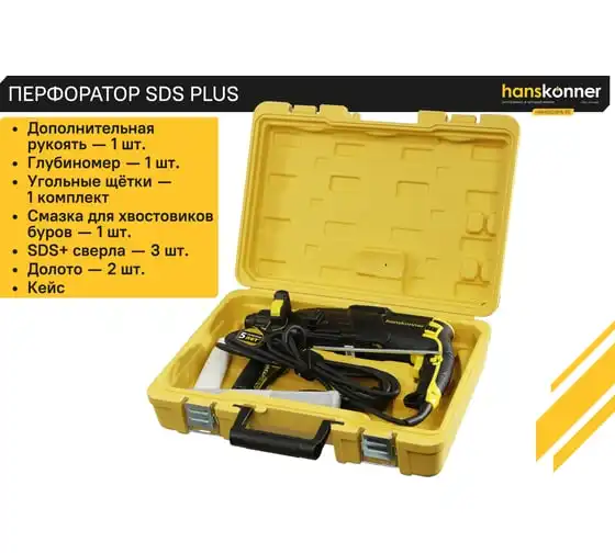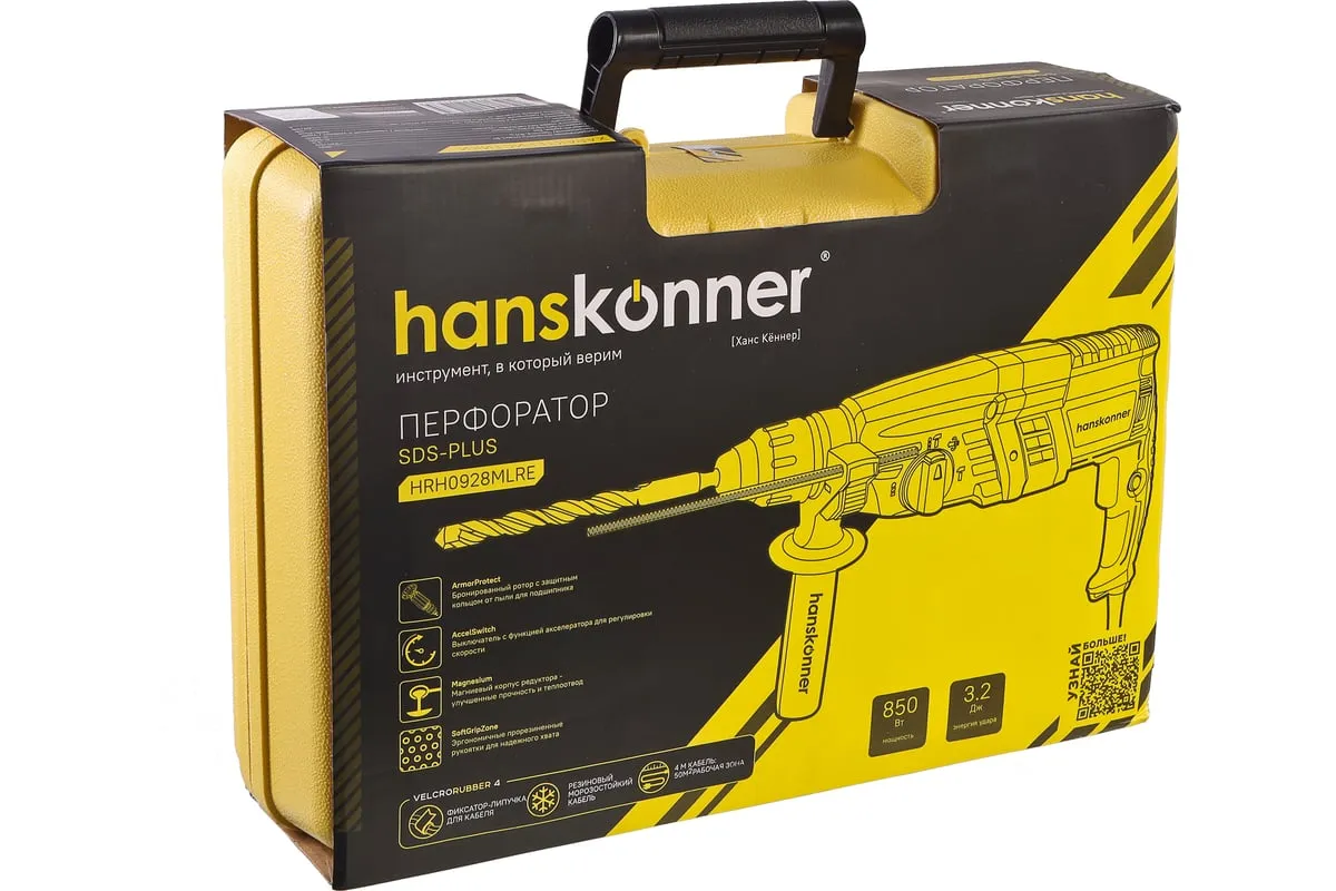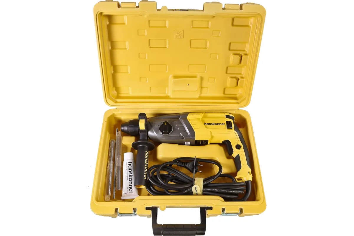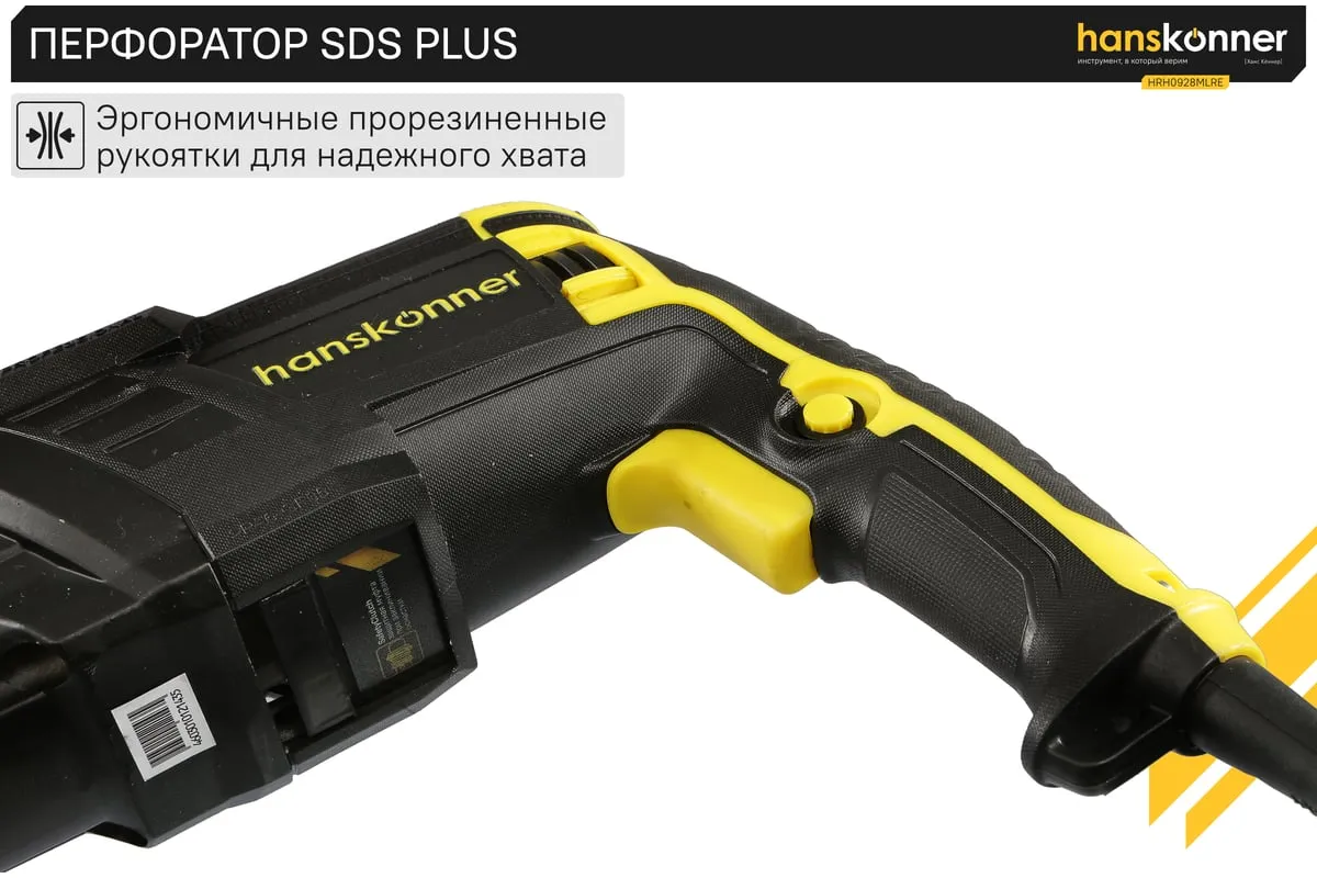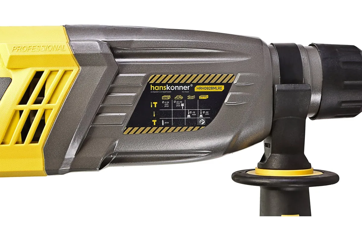 Перфоратор Hanskonner HRH0928MLRE – инструмент, сочетающий мощность и компактность, основные задачи которого: снятие старых настенных покрытий, сверления отверстий в дереве, пластике, металле, кирпиче, композите или бетоне. Выполняя конкретную задачу следует выбрать один из трех режимов: «сверление», «сверление с ударом», «удар». Комфортному применению перфоратора содействует выключатель с кнопкой блокировки, для удобства при проведении продолжительных работ, и функцией акселератора в целях регулировки скорости. Корпус редуктора, данной модели, сделан из магниевого сплава, что обеспечивает большую прочность и качественный теплоотвод. Также, долговечность инструмента подкрепляется бронированием ротора и пылезащитным кольцом подшипника.В интересах надежного и быстрого крепления оснастки, модель оснащена быстрозажимным патроном SDS+. Ловкости в обращении с перфоратором благоприятствуют прорезиненные эргономичные рукояти. А ограничитель глубины поможет исполнить отверстия заданной глубины. Безопасному ходу эксплуатации способствует встроенная предохранительная муфта SafetyClutch, активная при заедании или защемлении оснастки, что предотвращает внезапный резкий поворот инструмента в руках оператора.Морозостойкий резиновый сетевой кабель длинной 4 м, позволяет охватит рабочую зону площадью 50 м2.