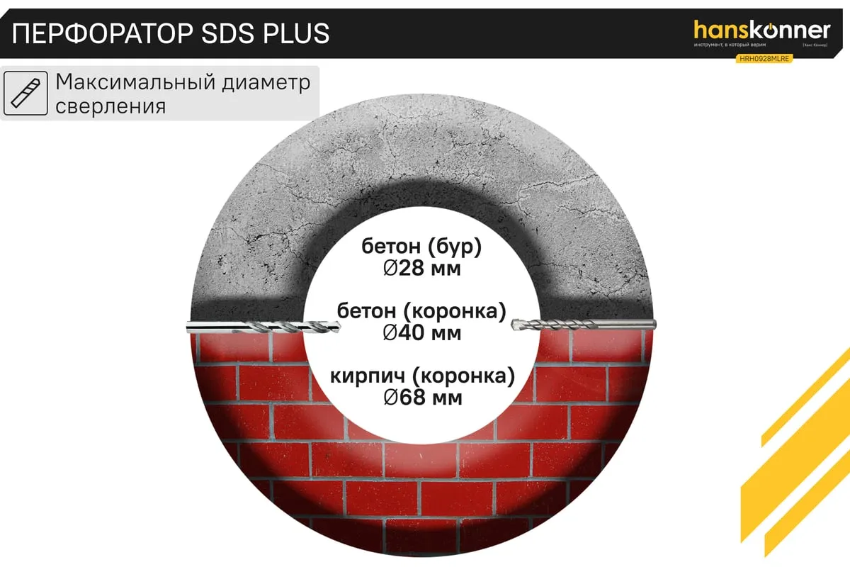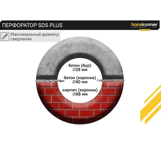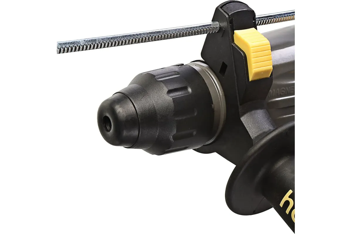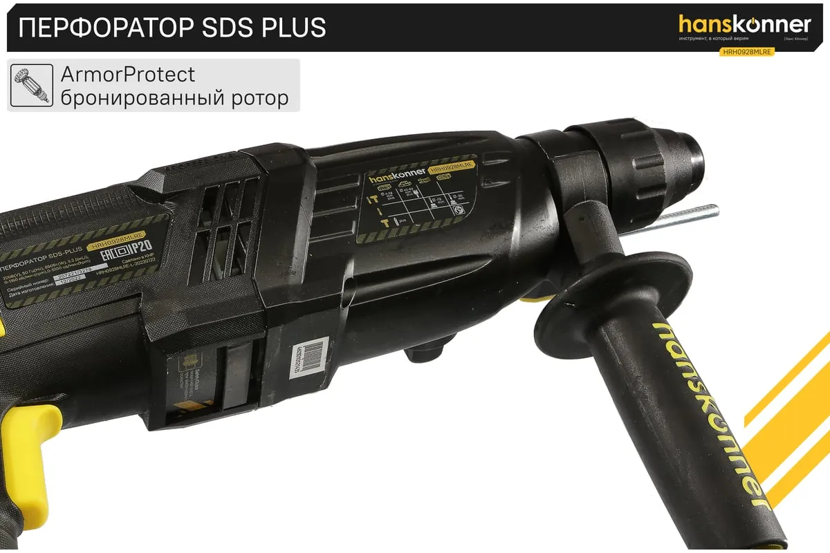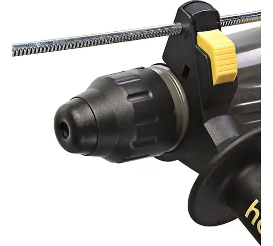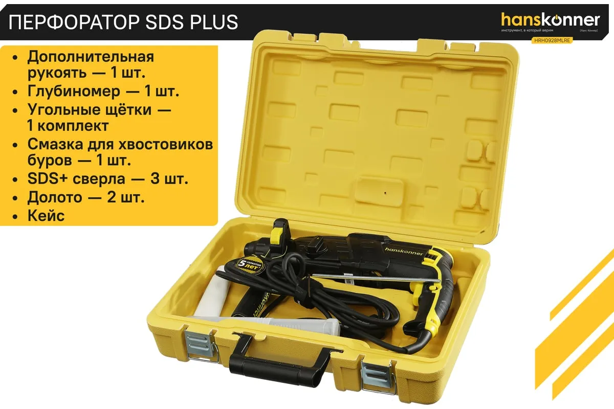 Перфоратор Hanskonner HRH0928MLRE – инструмент, сочетающий мощность и компактность, основные задачи которого: снятие старых настенных покрытий, сверления отверстий в дереве, пластике, металле, кирпиче, композите или бетоне. Выполняя конкретную задачу следует выбрать один из трех режимов: «сверление», «сверление с ударом», «удар». Комфортному применению перфоратора содействует выключатель с кнопкой блокировки, для удобства при проведении продолжительных работ, и функцией акселератора в целях регулировки скорости. Корпус редуктора, данной модели, сделан из магниевого сплава, что обеспечивает большую прочность и качественный теплоотвод. Также, долговечность инструмента подкрепляется бронированием ротора и пылезащитным кольцом подшипника.В интересах надежного и быстрого крепления оснастки, модель оснащена быстрозажимным патроном SDS+. Ловкости в обращении с перфоратором благоприятствуют прорезиненные эргономичные рукояти. А ограничитель глубины поможет исполнить отверстия заданной глубины. Безопасному ходу эксплуатации способствует встроенная предохранительная муфта SafetyClutch, активная при заедании или защемлении оснастки, что предотвращает внезапный резкий поворот инструмента в руках оператора.Морозостойкий резиновый сетевой кабель длинной 4 м, позволяет охватит рабочую зону площадью 50 м2.