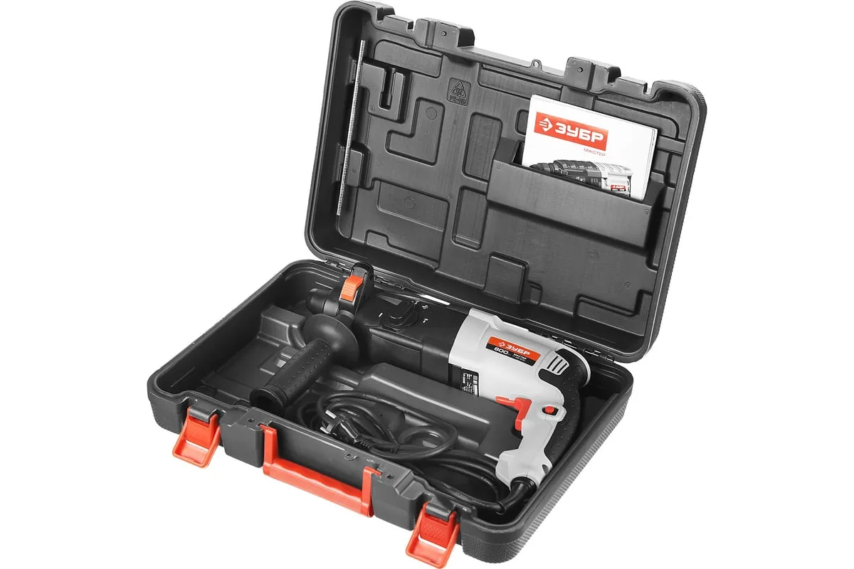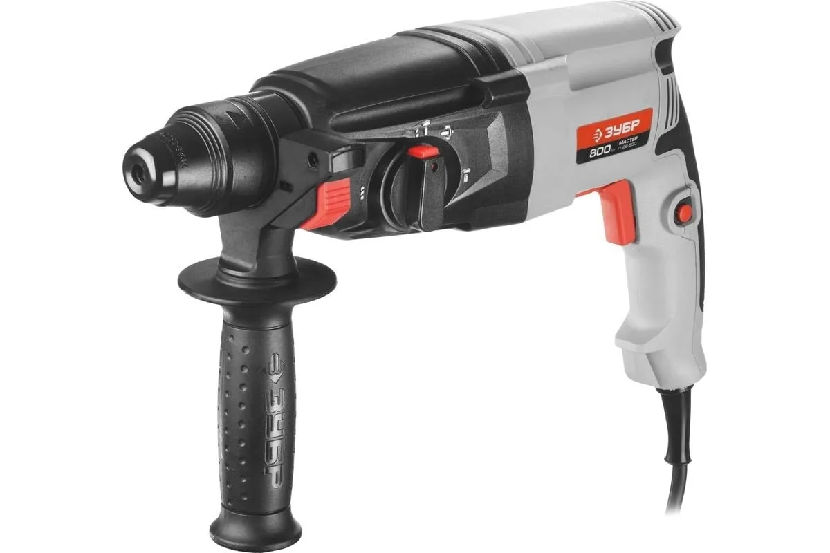 Перфоратор ЗУБР МАСТЕР П-26-800 имеет три режима работы: сверление, сверление с ударом и долбление. Также предусмотрен режим поворота долота - на определённый градус после каждого удара. Переключение между ними осуществляется с помощью тумблера сбоку на корпусе. Для удобства продолжительной по времени работы имеется фиксатор клавиши "Пуск", что исключает необходимость постоянно держать на ней палец.