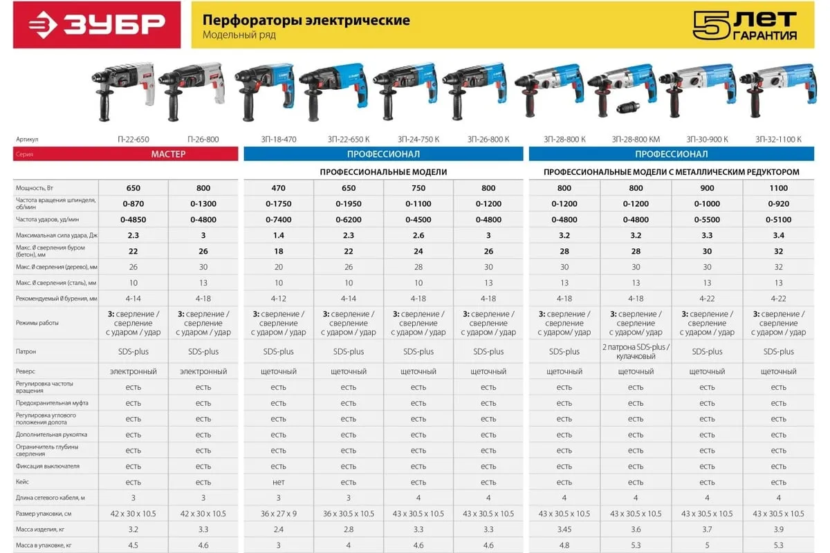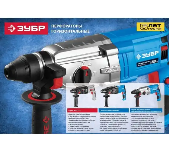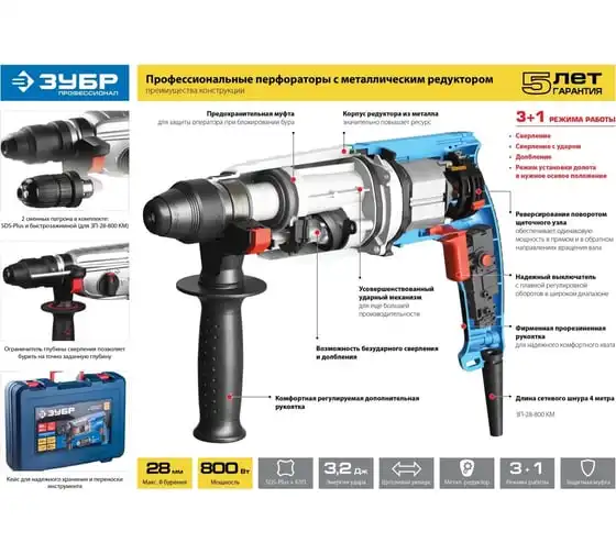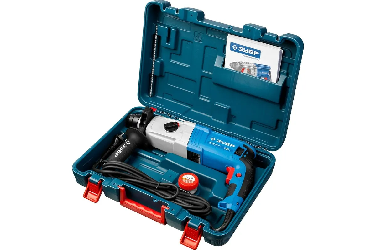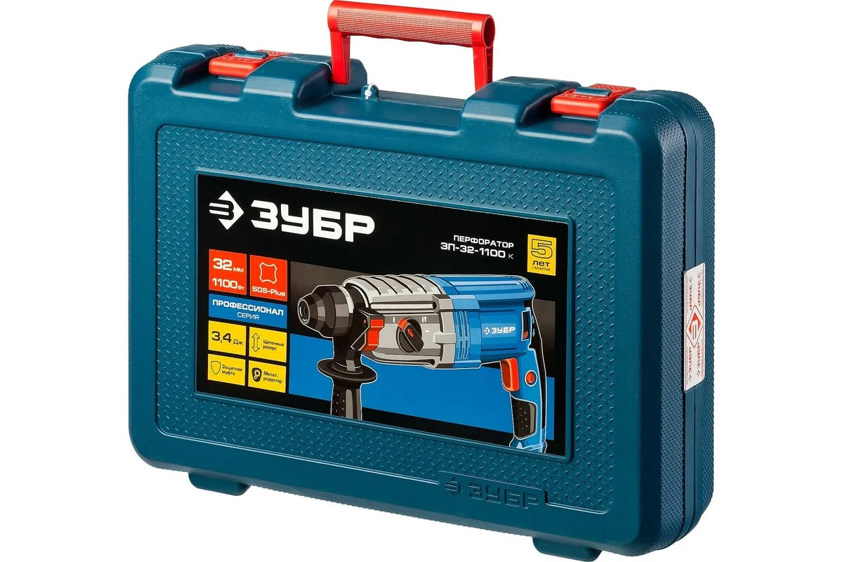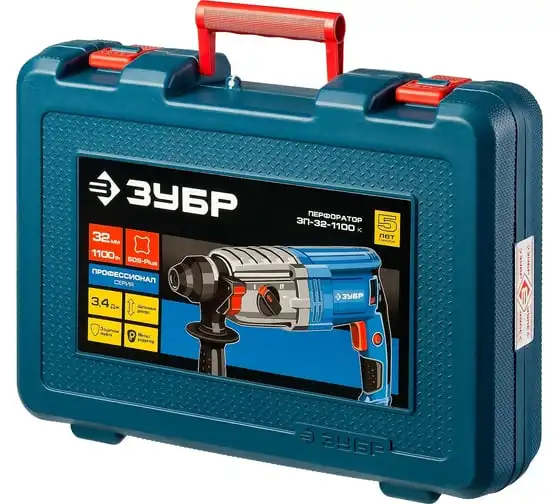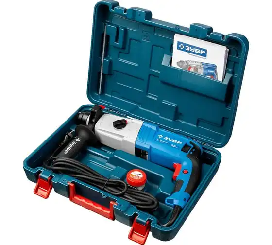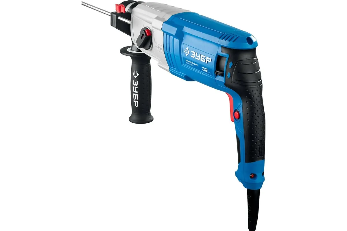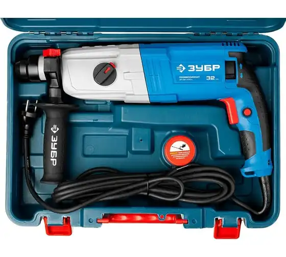 Перфоратор ЗУБР Профессионал, 1100 Вт ЗП-32-1100 К работает в трех режимах: сверление, сверление с ударом и долбление. Он оснащен функцией реверса для простого извлечения оснастки при заклинивании. Сетевой кабель длиной 4 м дает оператору возможность свободно перемещаться по рабочей площадке. Ограничитель глубины сверления обеспечивает точную работу.