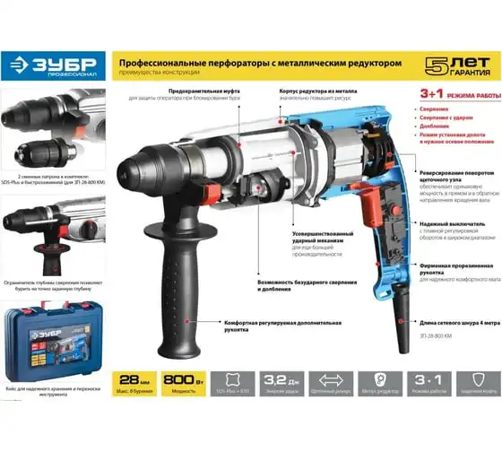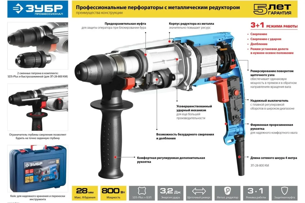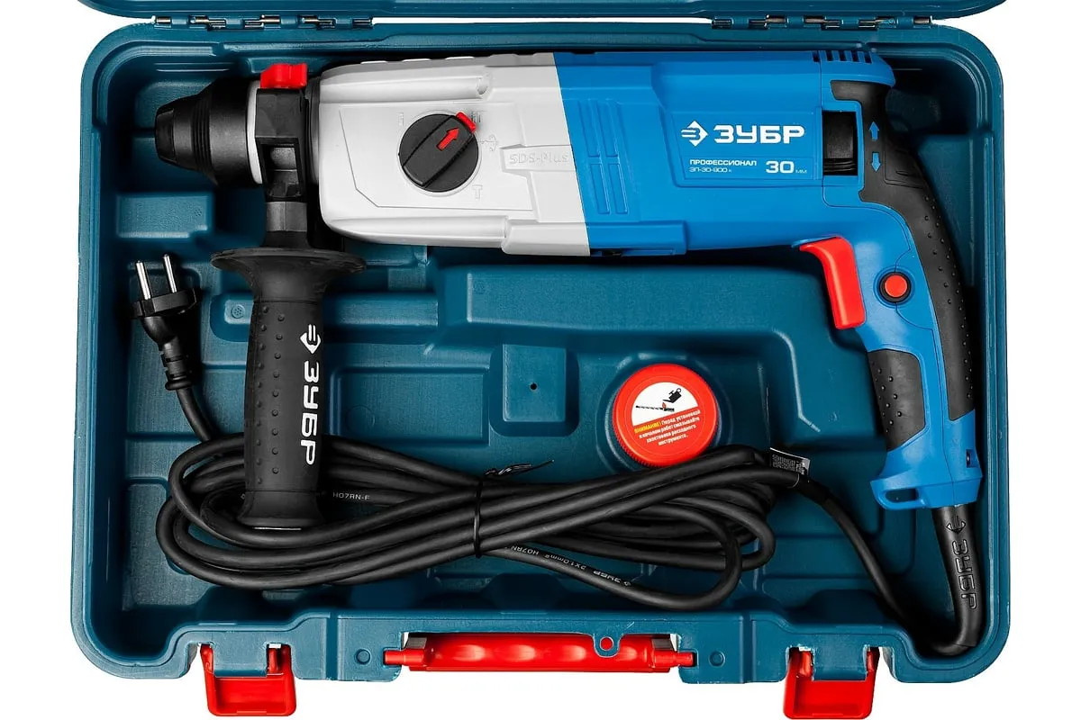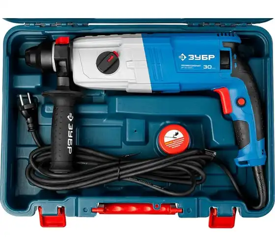 Перфоратор ЗУБР Профессионал 900 Вт ЗП-30-900 К оснащен глубиномером, что позволяет сверлить отверстия заданной глубины. Патрон SDS-Plus обеспечивает быструю и легкую замену оснастки. Функция реверса осуществлена посредством поворота угольных щеток, что способствует их меньшему износу. Благодаря плавной регулировке частоты вращения, можно подстроиться под конкретный тип материала. Сетевой кабель длиной 4 м дает оператору возможность свободно перемещаться по рабочей площадке.
