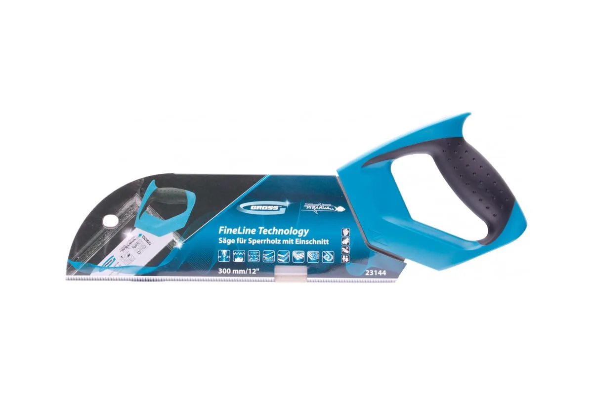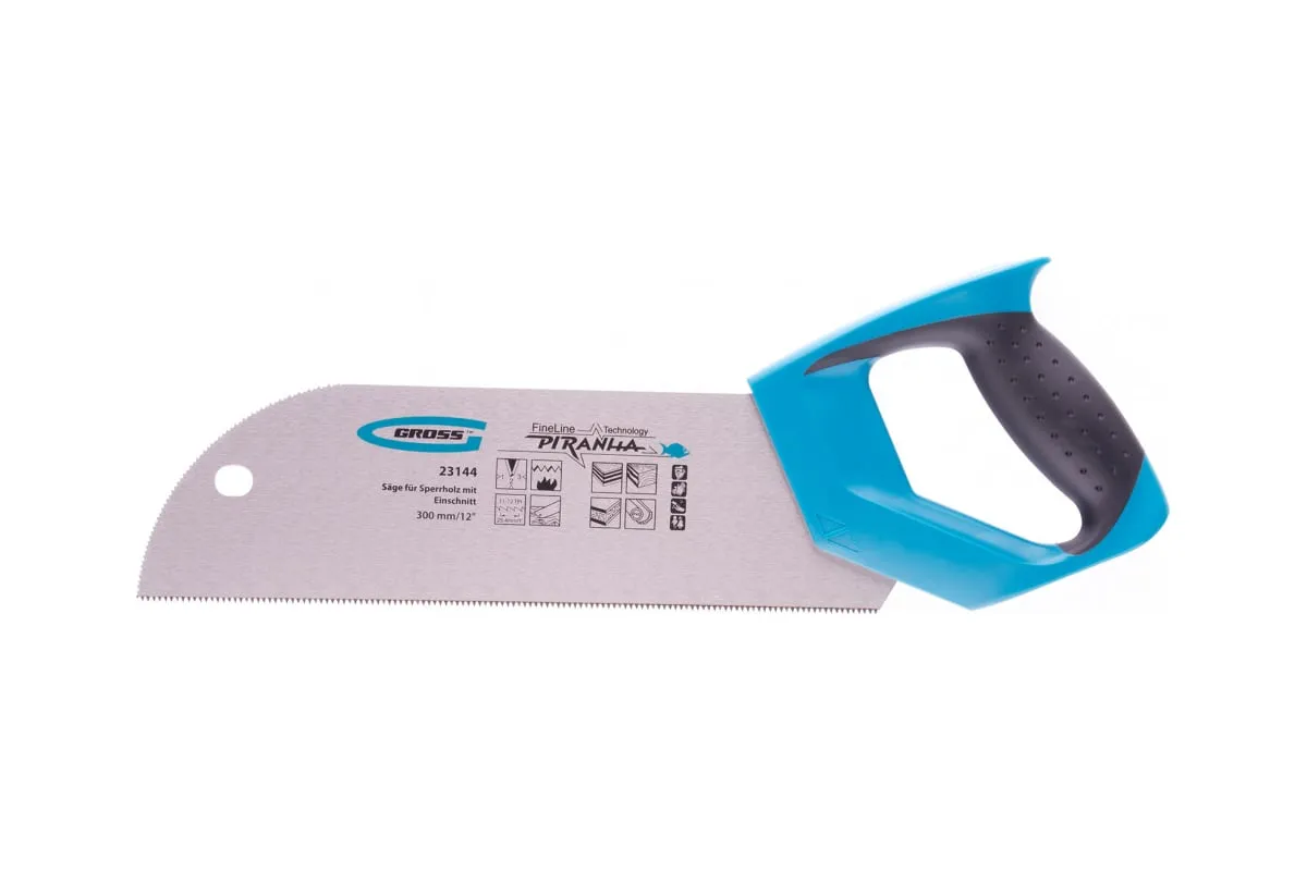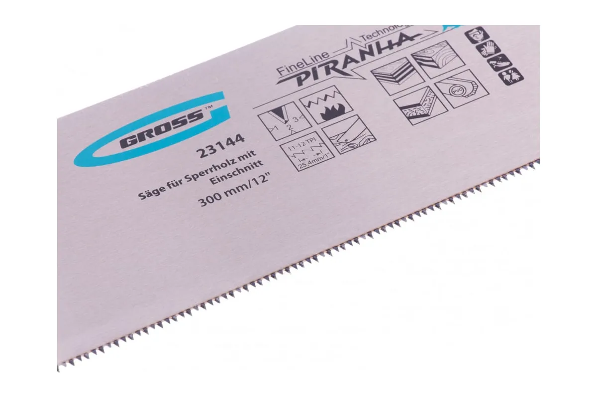 Пила для фанеры с запилом Gross PIRANHA 23144 с полотном размером 300 мм / 12", с калеными зубьями с шагом 11-12 TPI и 3D-заточкой, используется для распиловки древесины, фанеры, ДВП и ПВХ в продольном и поперечном направлении. Характеризуется высокой производительностью. Рабочая кромка с мелкими зубьями выполняет ровный гладкий рез. Запил в передней части полотна облегчает работу с заготовками. Пила будет полезна в столярной мастерской.
