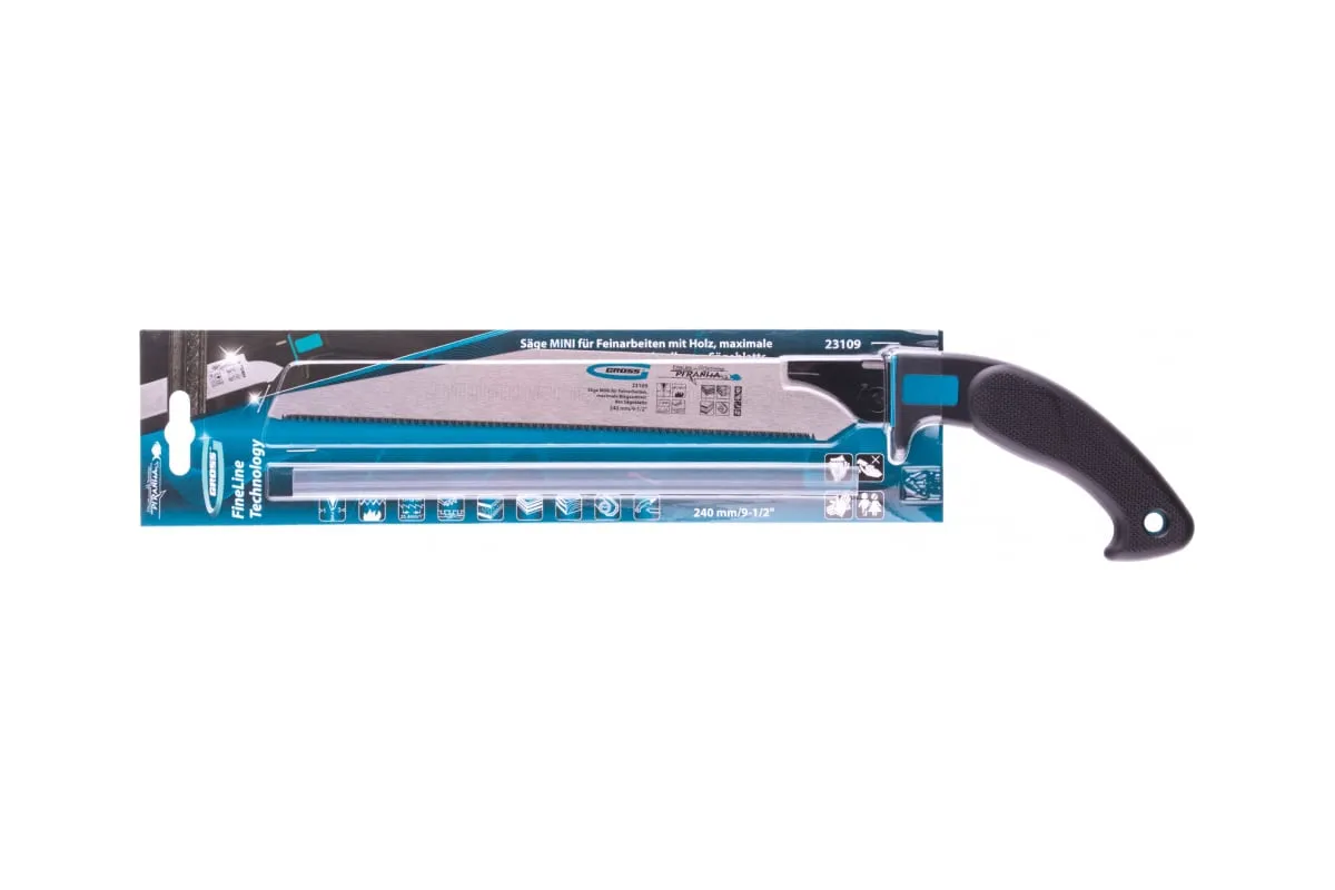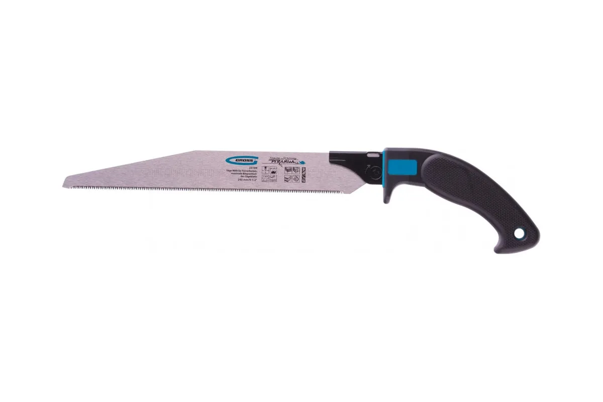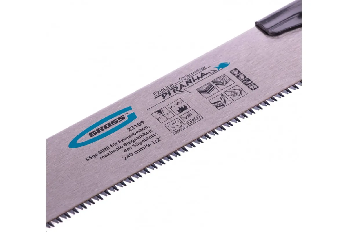 Пила Gross PIRANHA МИНИ 23109 со сменным полотном длиной 240 мм, с калеными зубьями 3D с шагом 17-18 TPI, используется для тонких работ по древесине, фанере, ДВП, ПВХ. Рабочая кромка с мелкими зубьями с шагом 17-18 TPI выполняет ровный и гладкий рез. Зубья вырезаются и одновременно затачиваются алмазным кругом, что обеспечивает высокую производительность инструмента. Полотно имеет обратный зуб, поэтому пилой можно пилить в направлении на себя. Инструмент применяется для проведения точных столярных работ дома или в мастерской.