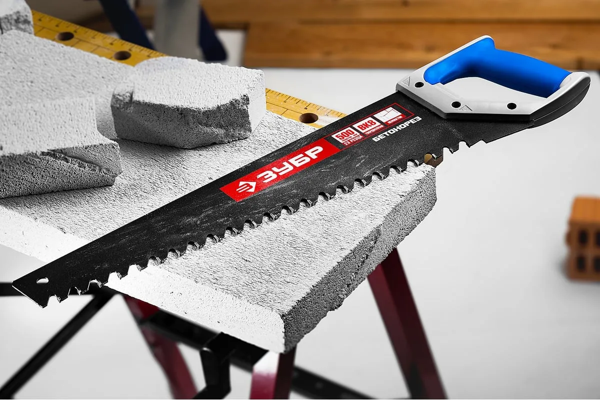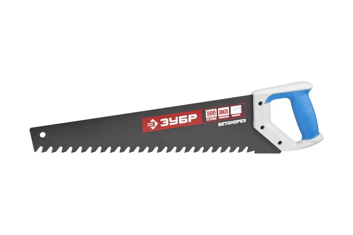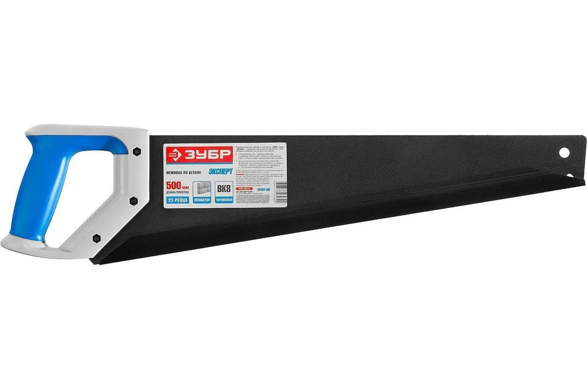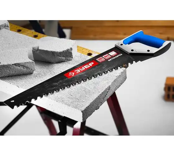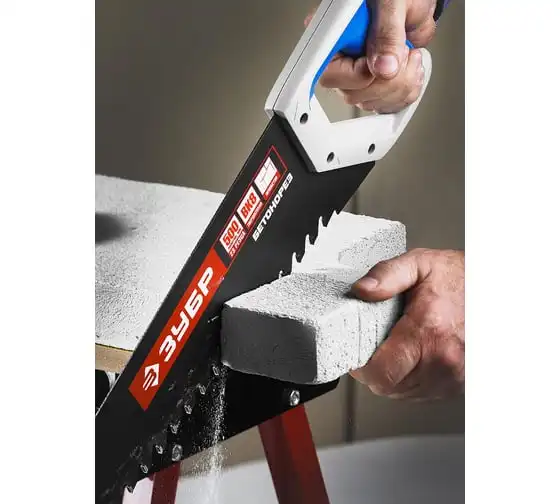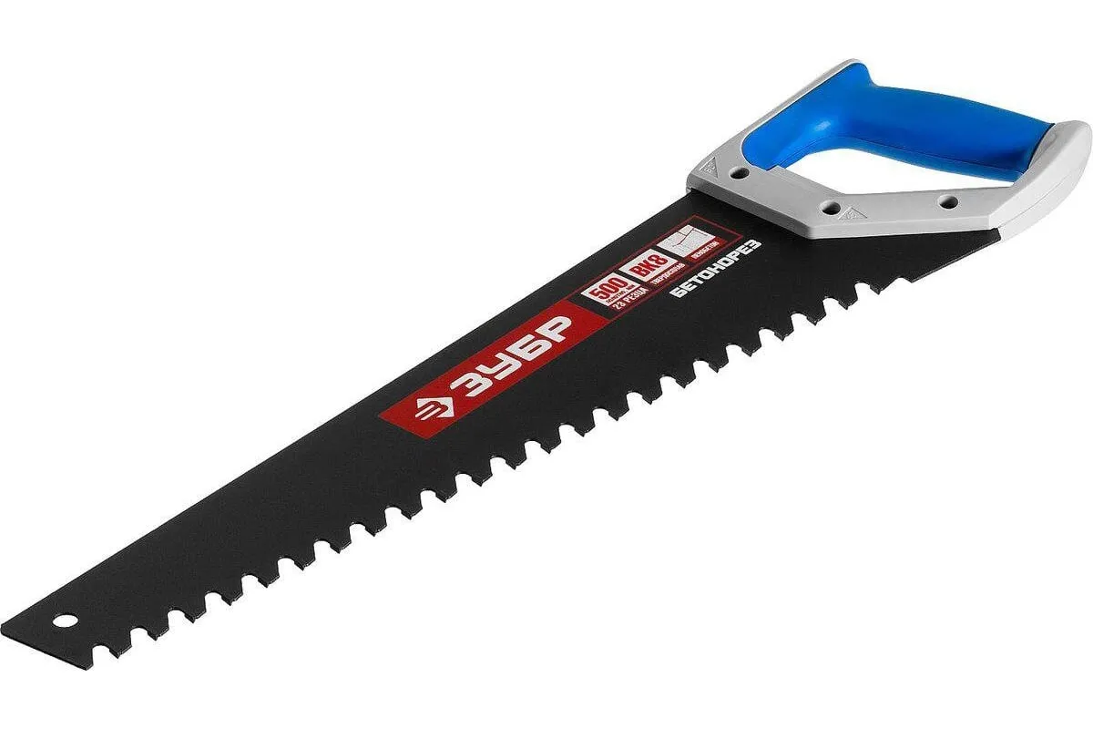 Пила по пенобетону Бетонорез Зубр ЭКСПЕРТ 15157-50 служит для проведения распилочных работ по пенобетону и ячеистым блокам. Полотно с тефлоновым покрытием не подвержено возникновению коррозии. Рукоятка выполнена из ударопрочной пластмассы и мягкого полимера, что обеспечивает комфортную работу и снижает утомляемость. Твердосплавные напайки на зубьях служат для увеличения скорости распила. Шаг зуба - 20 мм, длина полотна - 500 мм, количество зубьев - 22.