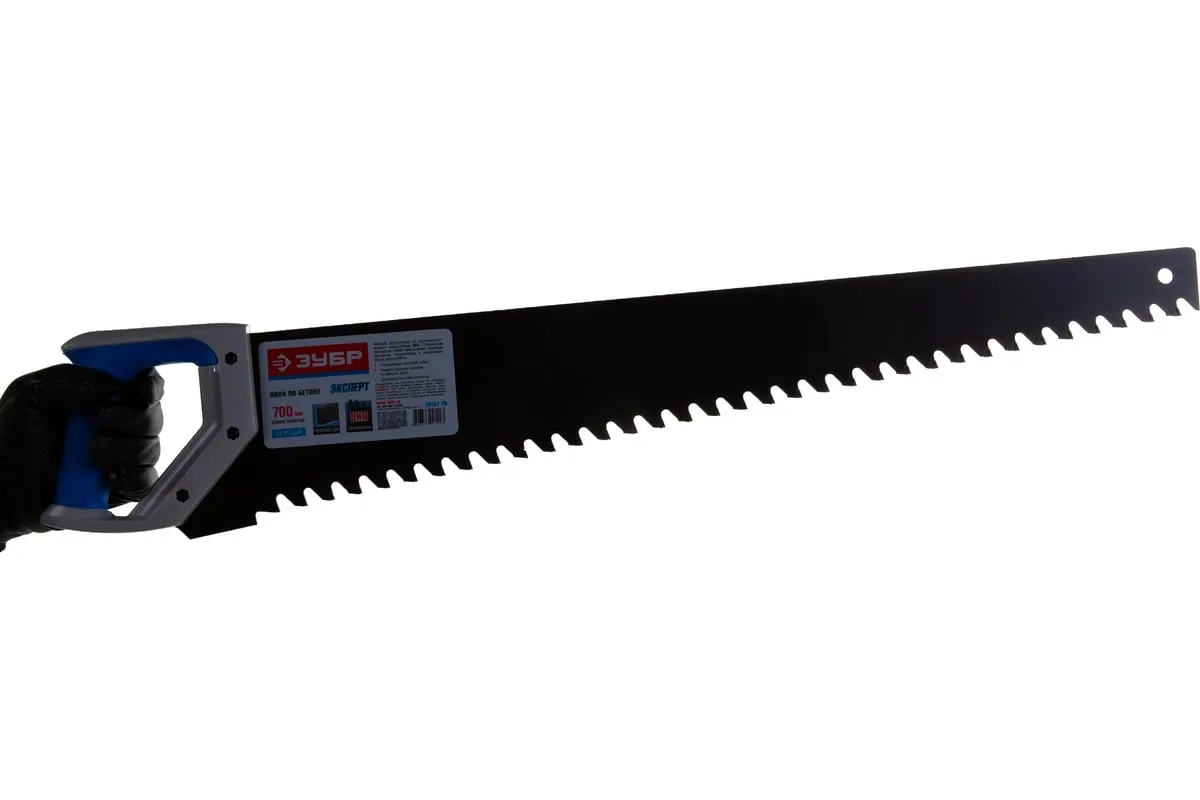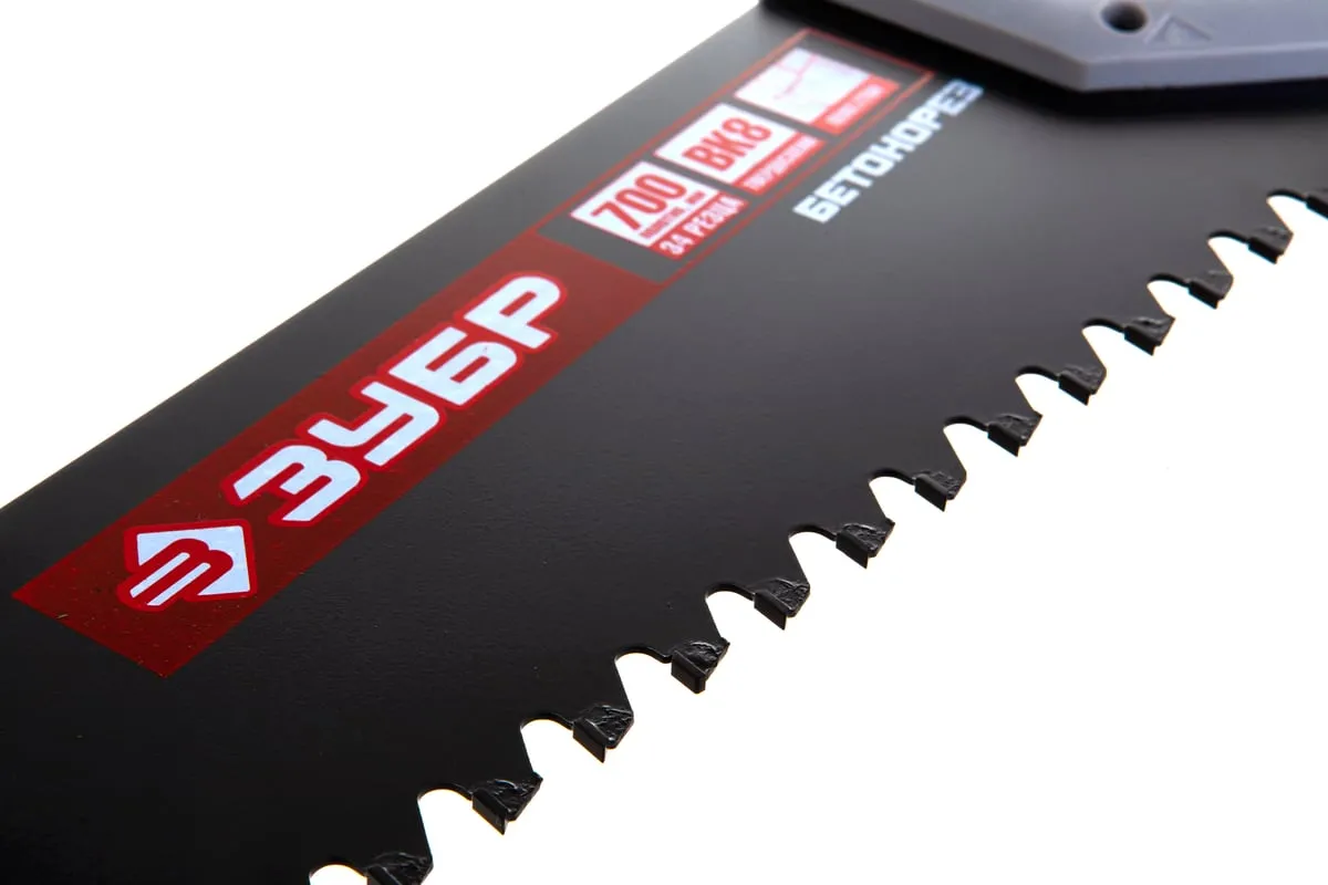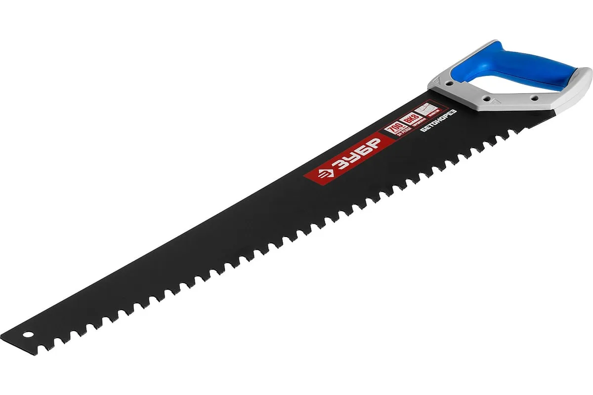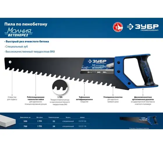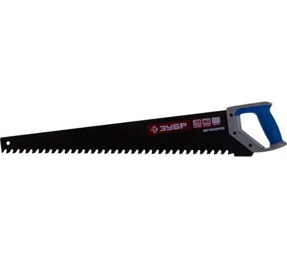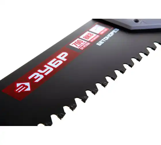 Пила по пенобетону Бетонорез Зубр ЭКСПЕРТ 15157-70 отличается прочным полотном и крупными зубьями. На каждом зубе имеется вставка из твердосплава ВК8, установка произведена по специальному методу пайки. Это гарантирует высокую скорость пиления. Пила используется для распиливания пеноблоков и ячеистого бетона. Двухкомпонентная рукоятка удобно лежит в ладони. Антифрикционное покрытие на лезвии увеличивает срок службы инструмента.