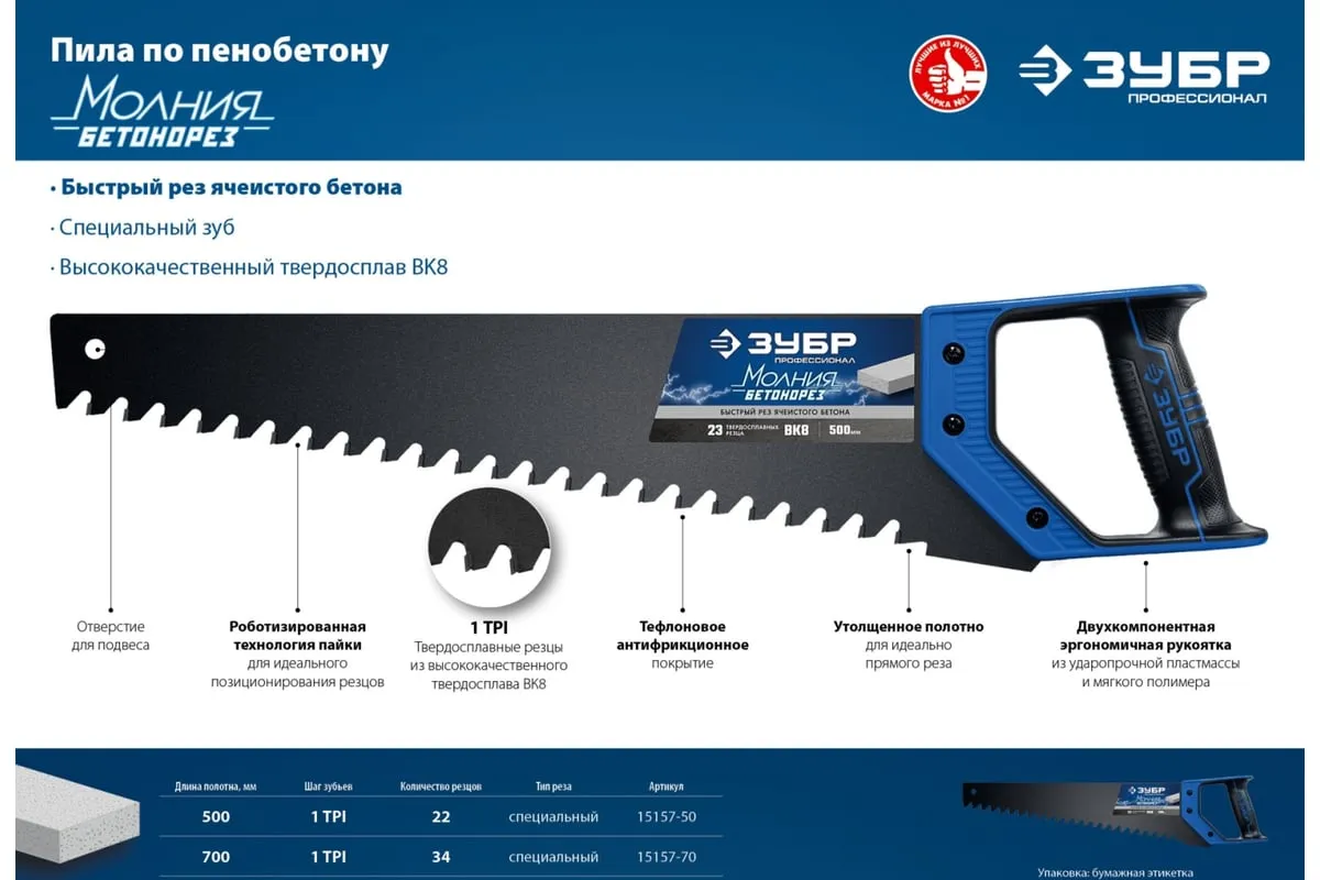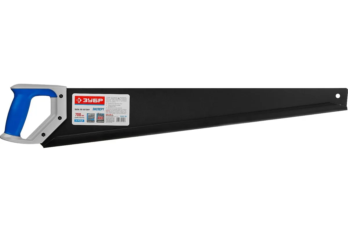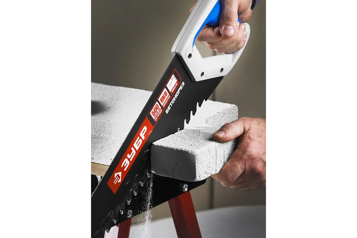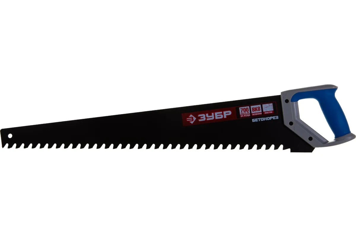 Пила по пенобетону Бетонорез Зубр ЭКСПЕРТ 15157-70 отличается прочным полотном и крупными зубьями. На каждом зубе имеется вставка из твердосплава ВК8, установка произведена по специальному методу пайки. Это гарантирует высокую скорость пиления. Пила используется для распиливания пеноблоков и ячеистого бетона. Двухкомпонентная рукоятка удобно лежит в ладони. Антифрикционное покрытие на лезвии увеличивает срок службы инструмента.