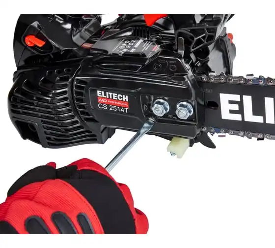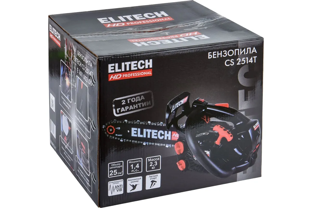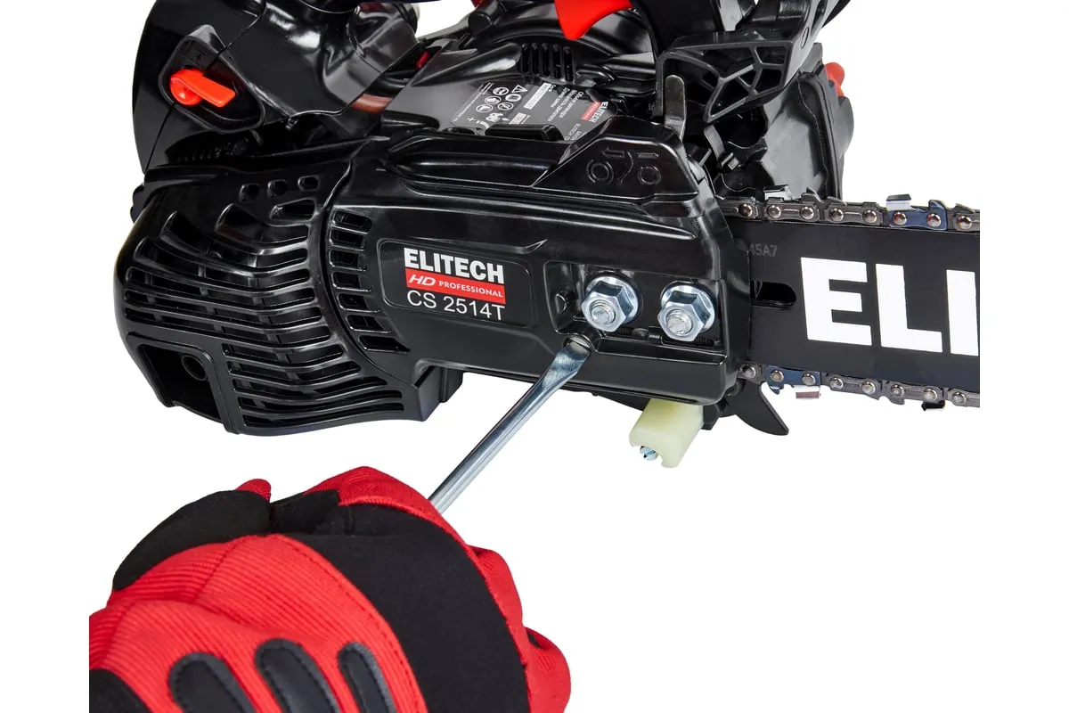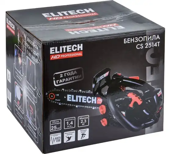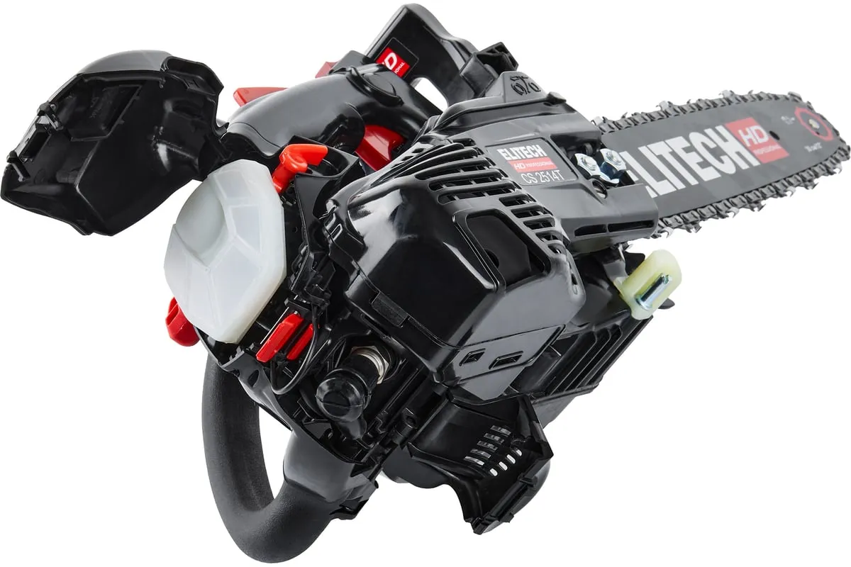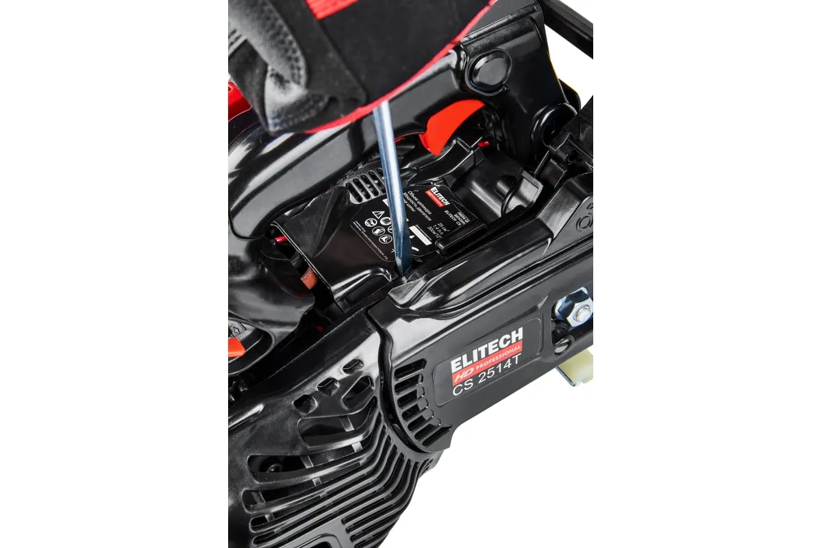 Модель CS 2514T – самая лёгкая в спектре профессиональных бензопил ELITECH. Её масса (без шины и цепи, в незаправленном состоянии) составляет 2,3кг. При этом двигатель с объёмом 25см3 развивает скорость до 12 000 об/мин и мощность 1,4 л.с. Модель имеет компактный дизайн. Чтобы добраться до свечи зажигания, необходимо открыть защитную крышку в задней части двигателя.