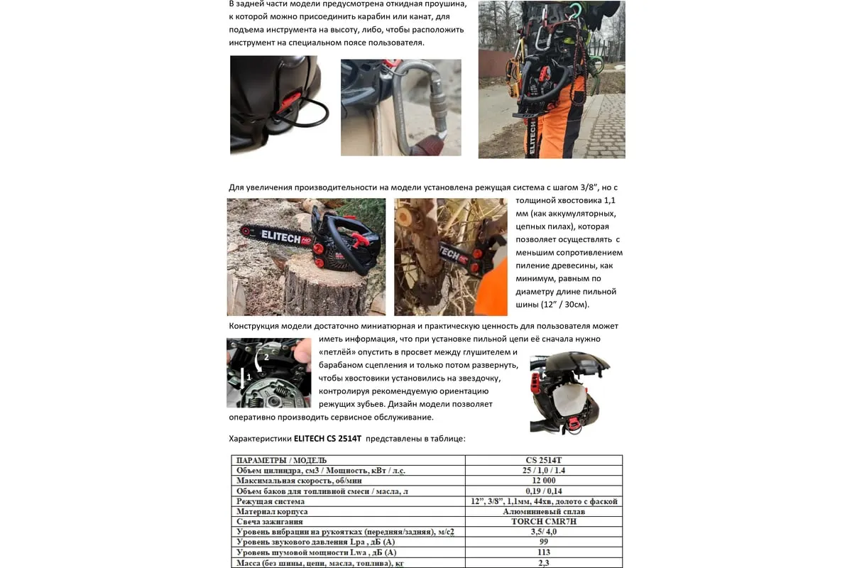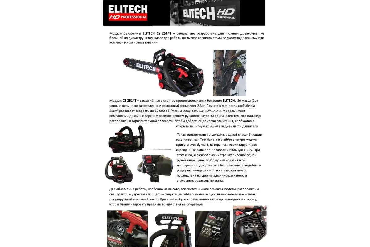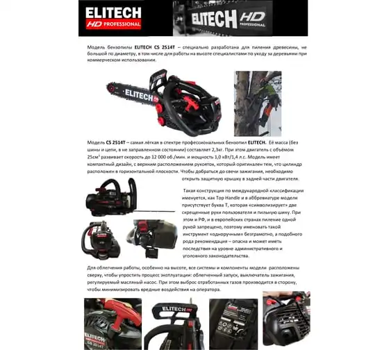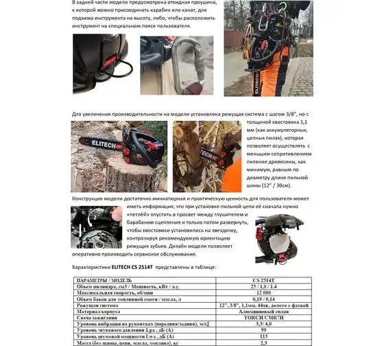 Модель бензопилы ELITECH CS 2514T разработана для пиления древесины, небольшой по диаметру, в том числе для работы на высоте специалистами по уходу за деревьями.