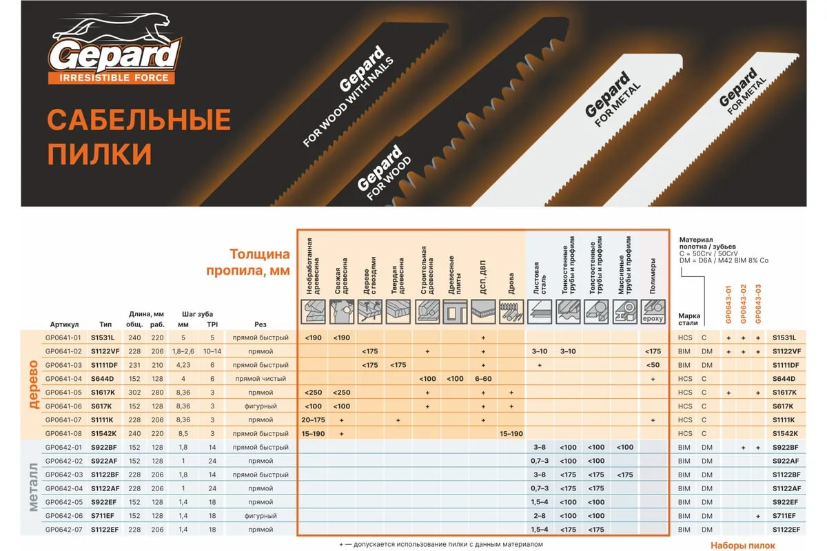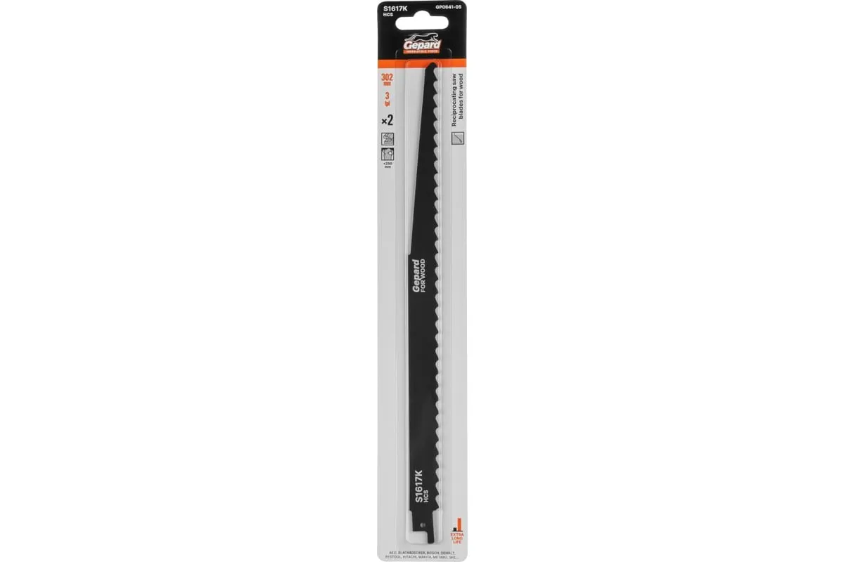 Полотно для сабельной пилы GEPARD по дереву S1617K 302 мм 2 штуки (GP0641-05) - сменный пильный элемент для сабельных пил, используется для быстрого, грубого, поперечного и продольного пиления строительной древесины, ДСП, фанеры, ухода за зелеными насаждениями: обрезки сучьев, веток, пиления веток на дрова.