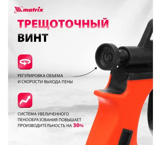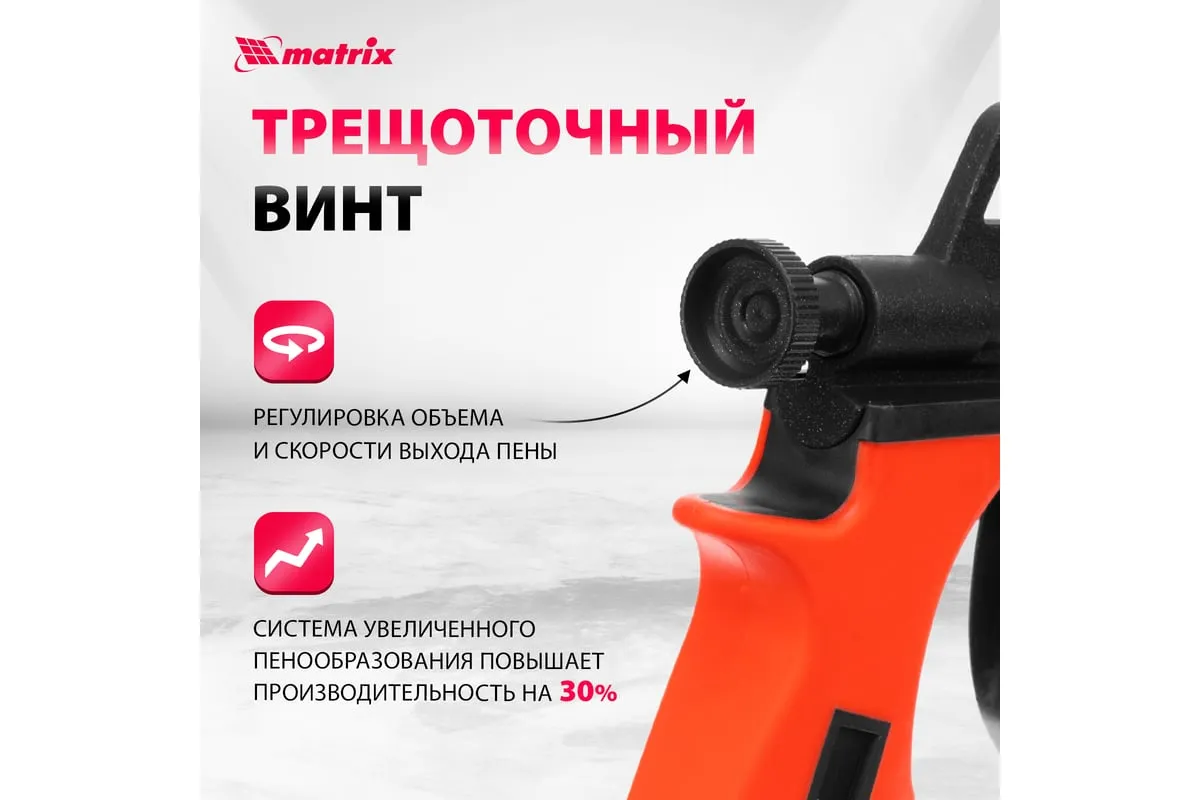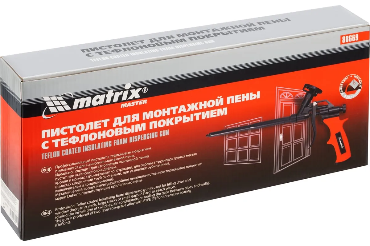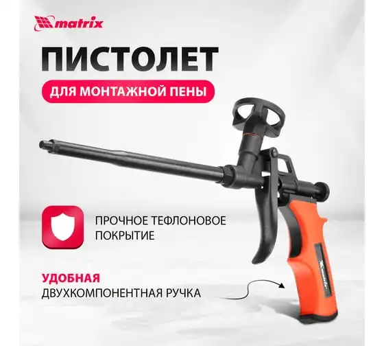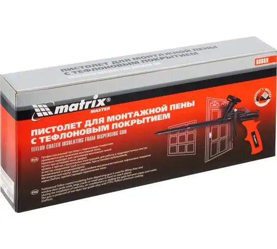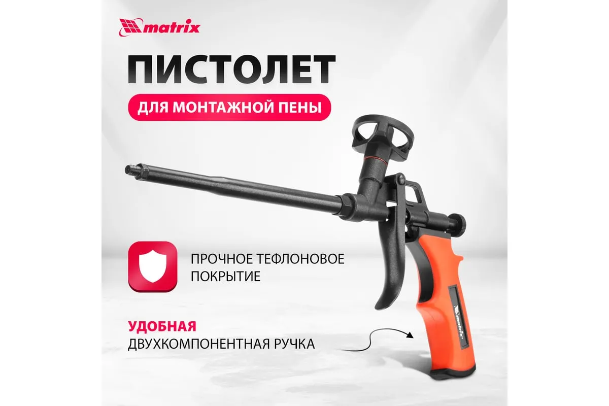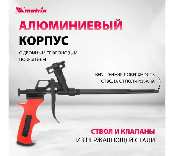 Пистолет для монтажной пены MATRIX 88669 используется при ремонтно-отделочных работах для заполнения пустот, оставшихся после монтажа оконных и дверных проемов. Он имеет длинный стержень, благодаря которому можно работать в труднодоступных местах. Корпус инструмента выполнен из металла и имеет двухслойное тефлоновое покрытие, препятствующее налипанию пены. Двухкомпонентная рукоятка удобно лежит в руке, обеспечивая надежный захват.