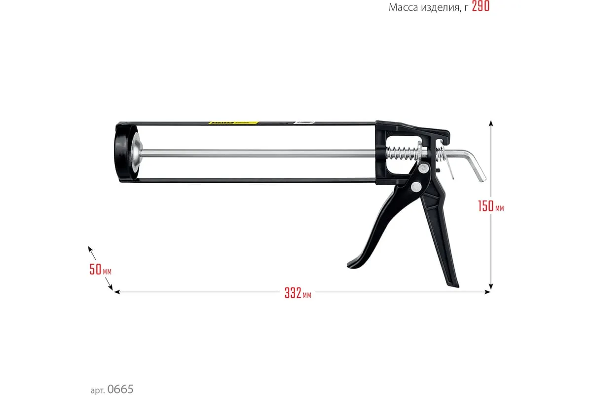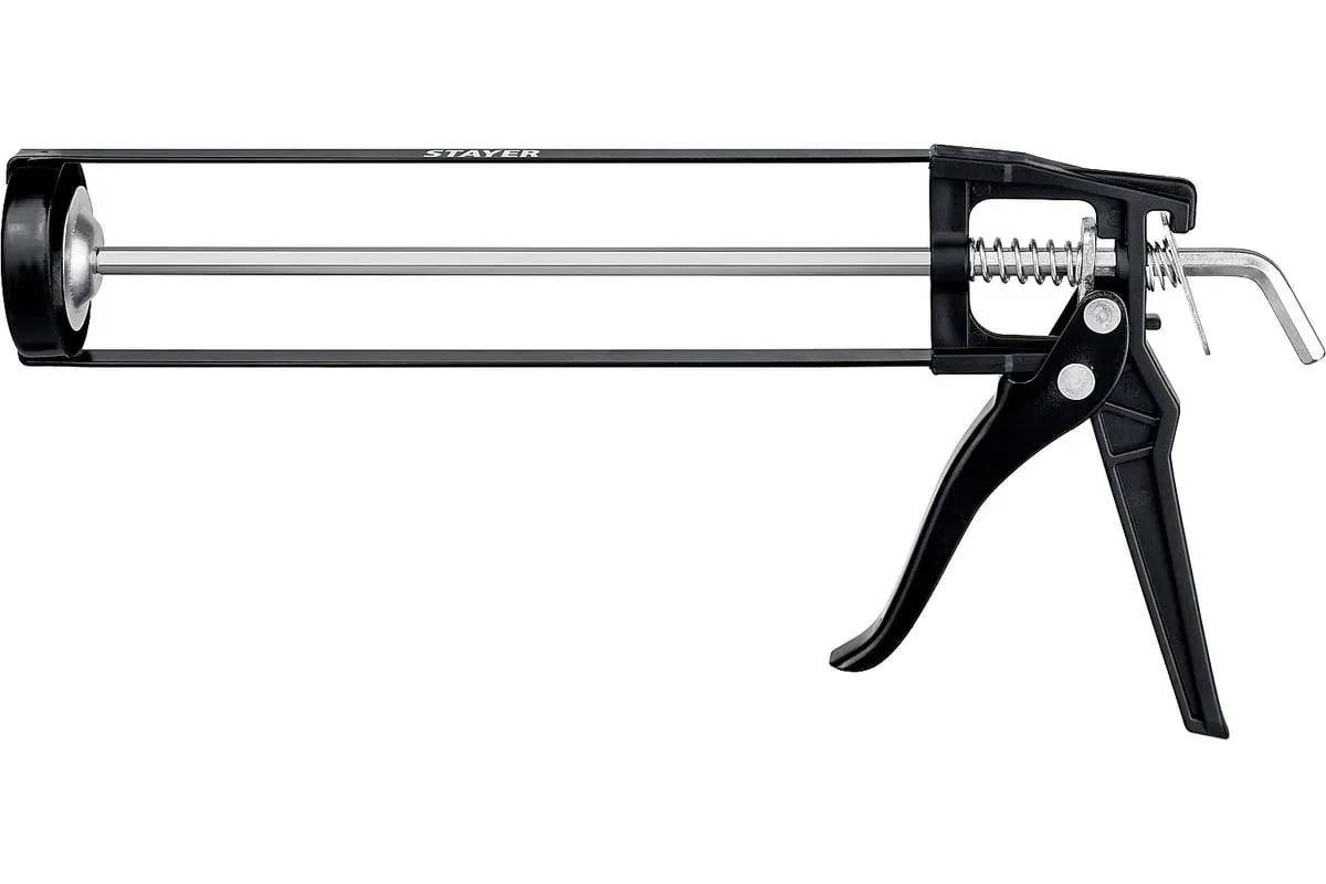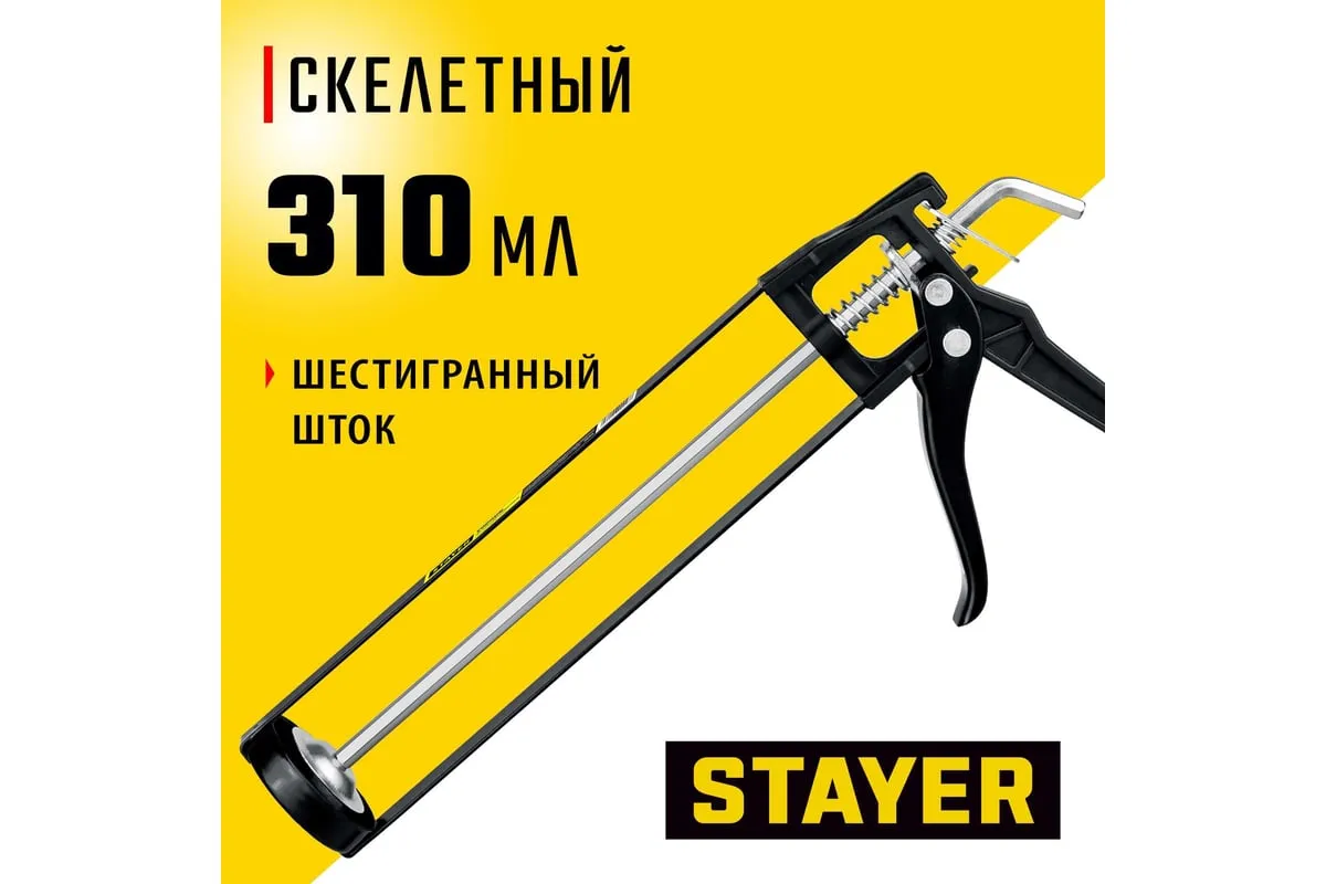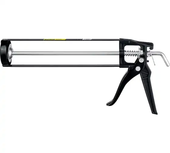 Пистолет STAYER Standard 0665 подходит для работы с картриджами объемом 310 мл, имеет скелетную конструкцию и ручку из ударопрочного пластика, которые способствуют равномерной подачи клея либо герметика. Данная спецификация обеспечивает прочность и надежность конструкции пистолета при использовании.