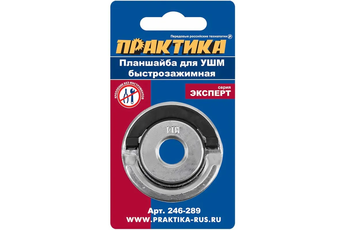 Планшайба ПРАКТИКА 246-289 предназначена для угловых шлифовальных машин. Применяется для установки дисков с посадкой 22.2 мм. Фиксация гайки производится рукой. Дополнительно предусмотрена фиксация при помощи штырькового ключа 30 мм. Резьба гайки – М14.