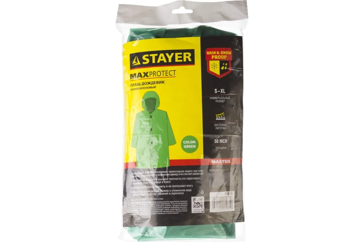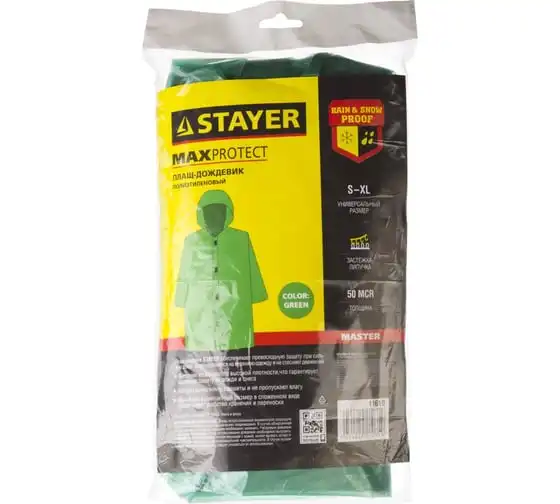 Плащ-дождевик STAYER MASTER 11610 на липучках защитит даже при сильном дожде. Имеет капюшон и длинные рукава. Изготовлен из полиэтилена высокой плотности. Все швы герметично проклеены, поэтому не пропускают влагу. Размер: универсальный.