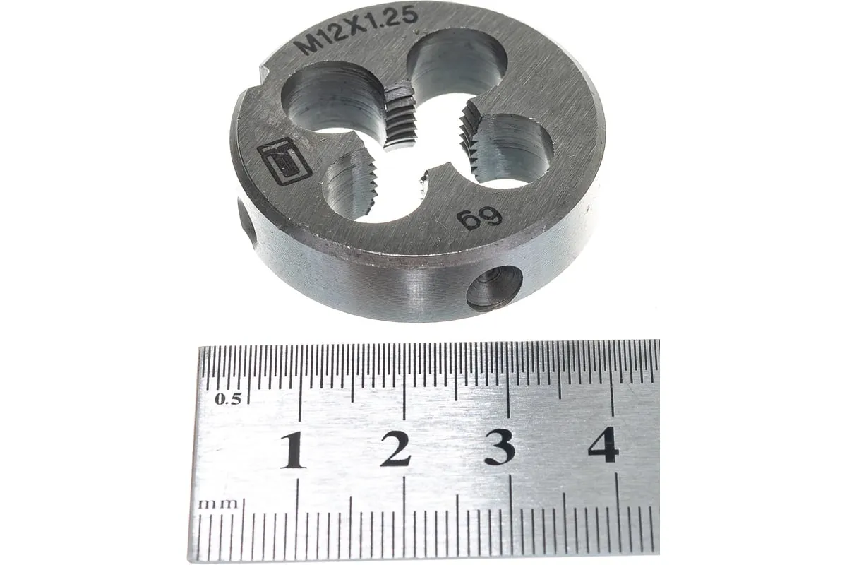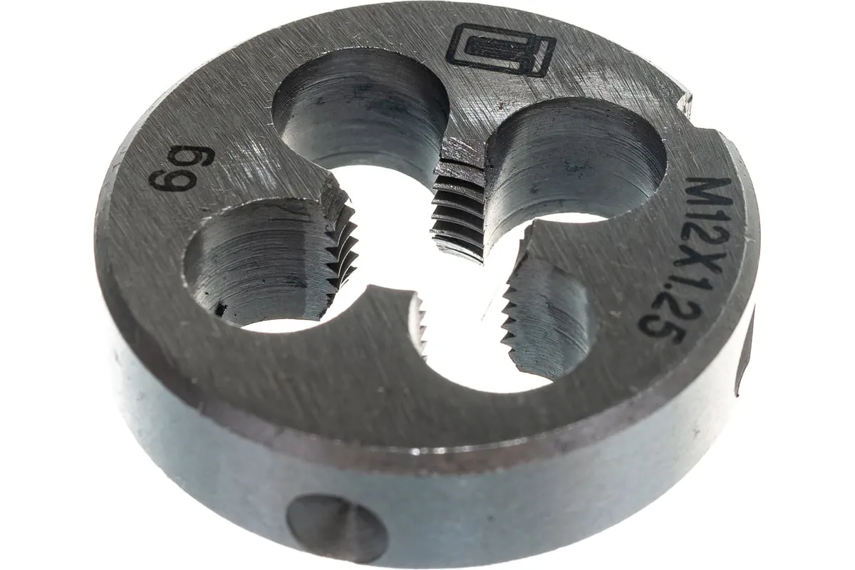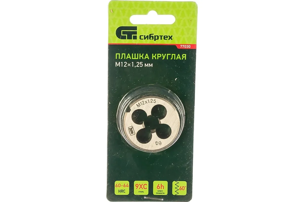 Плашка М12 х 1,25 мм СИБРТЕХ 77030 круглой формы используется для нанесения резьбы на деталь. Обладает высокими механическими свойствами, так как изготовлена из инструментальной стали. В плашке есть несколько отверстий с режущими кромками твердостью 60 HRc.