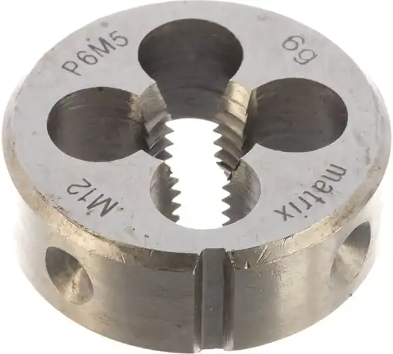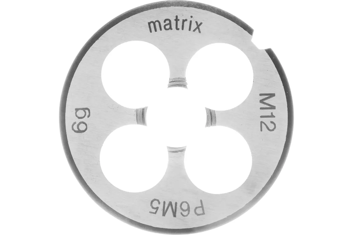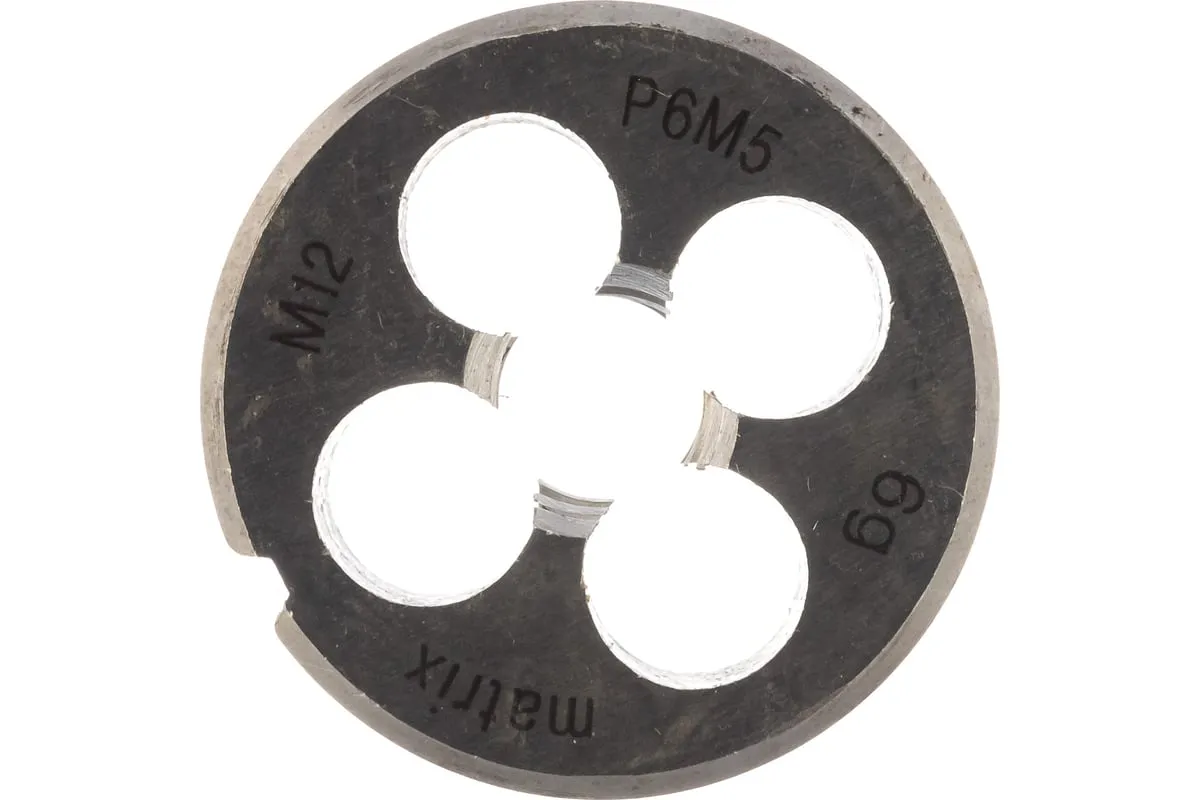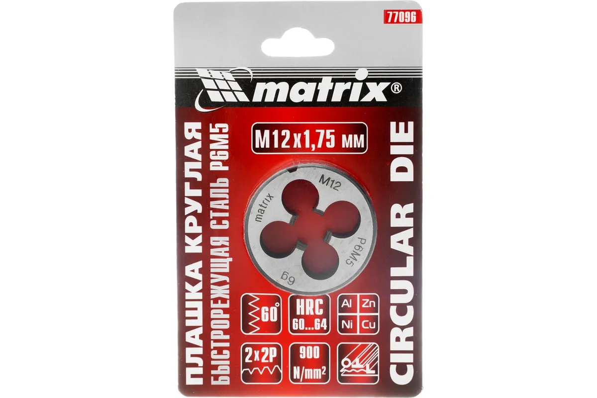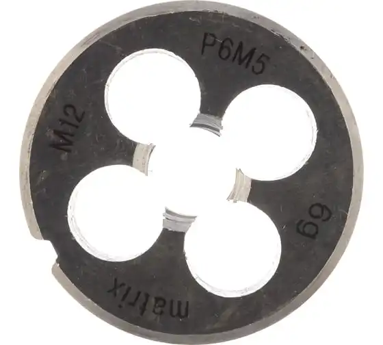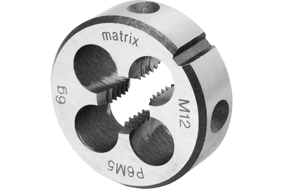 Плашка М12x1,75 мм, Р6М5 MATRIX 77096 имеет класс точности 6g. Удобный инструмент с двумя заходными конусами более эффективен так как имеет длительный срок службы.