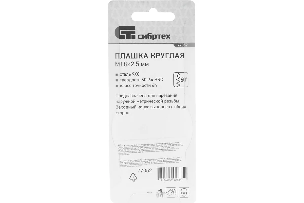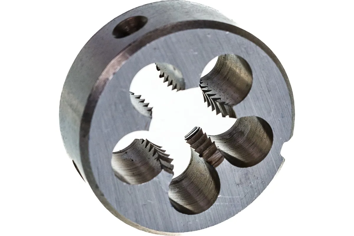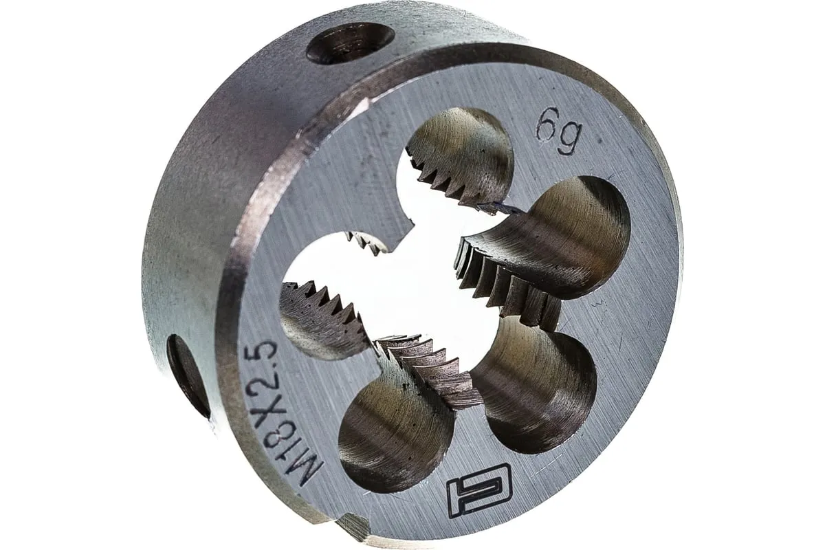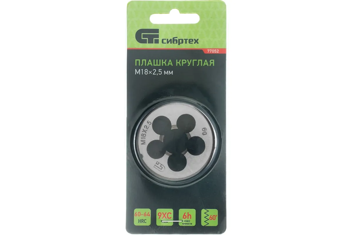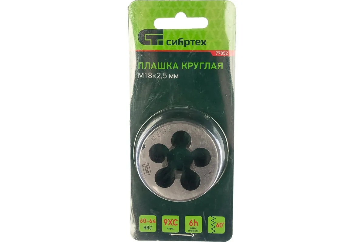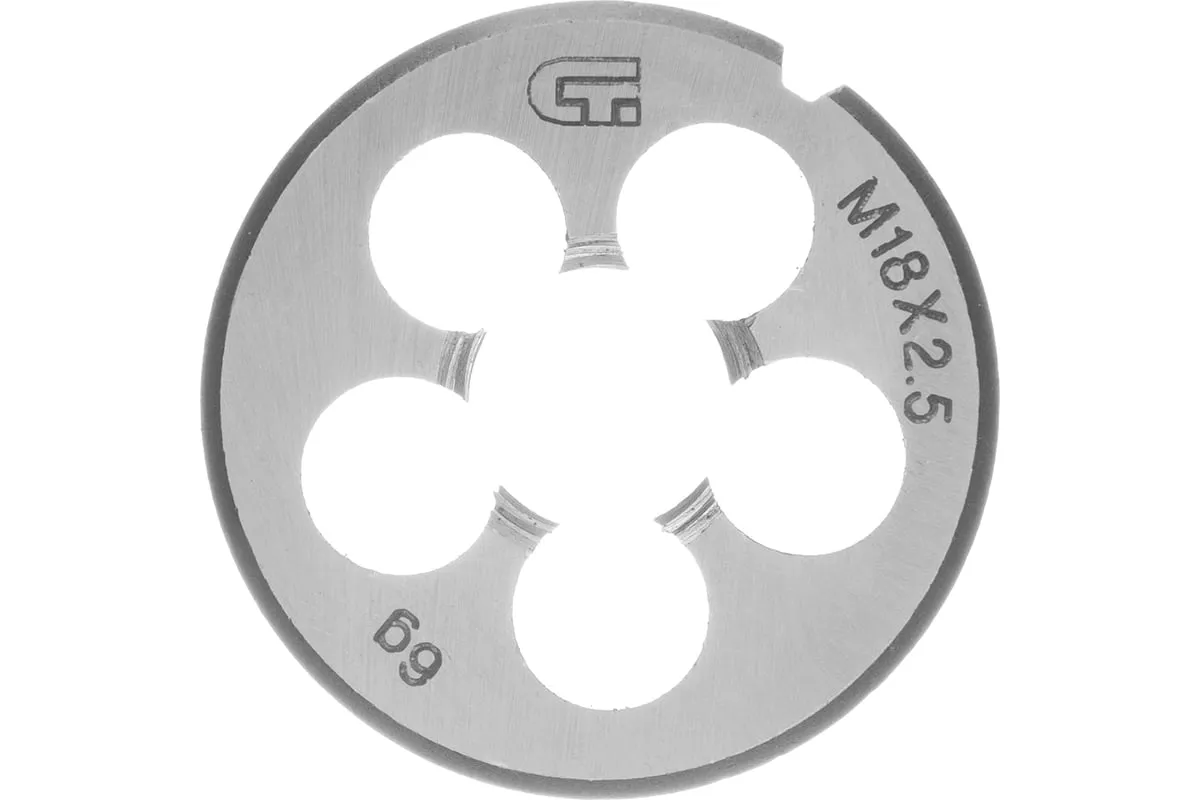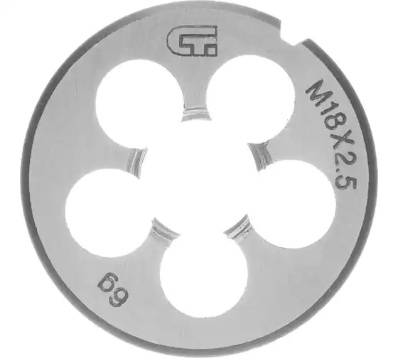 Плашка М18 х 2,5 мм СИБРТЕХ 77052 круглой формы используется для нанесения резьбы на заготовку. Обладает высокими механическими свойствами, так как изготовлена из инструментальной стали. В плашке есть несколько отверстий с режущими кромками твердостью 60 HRc.