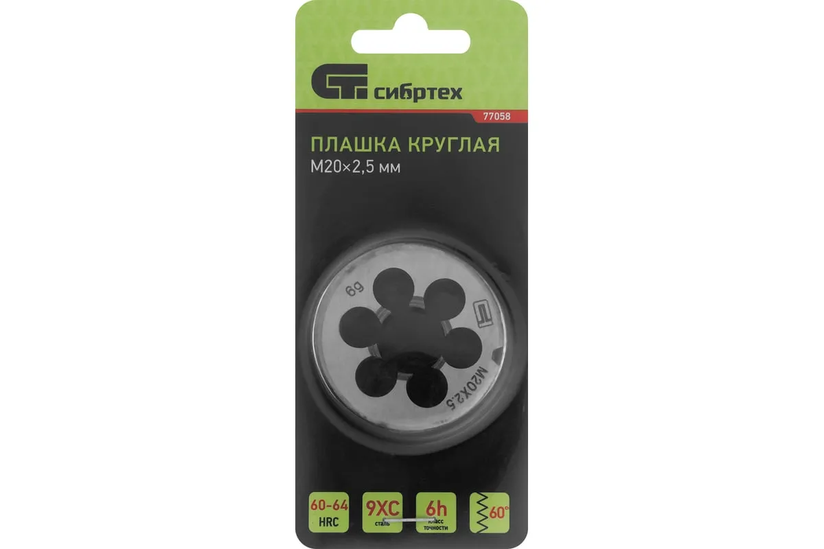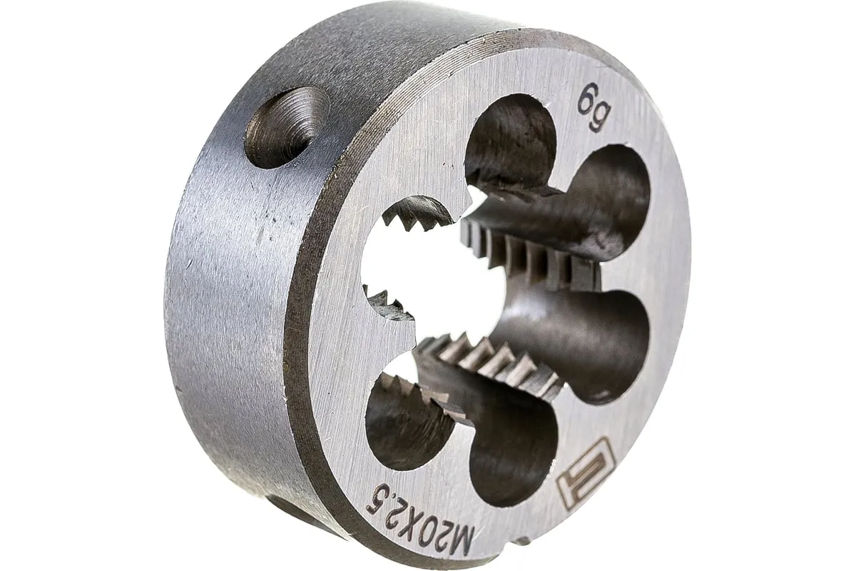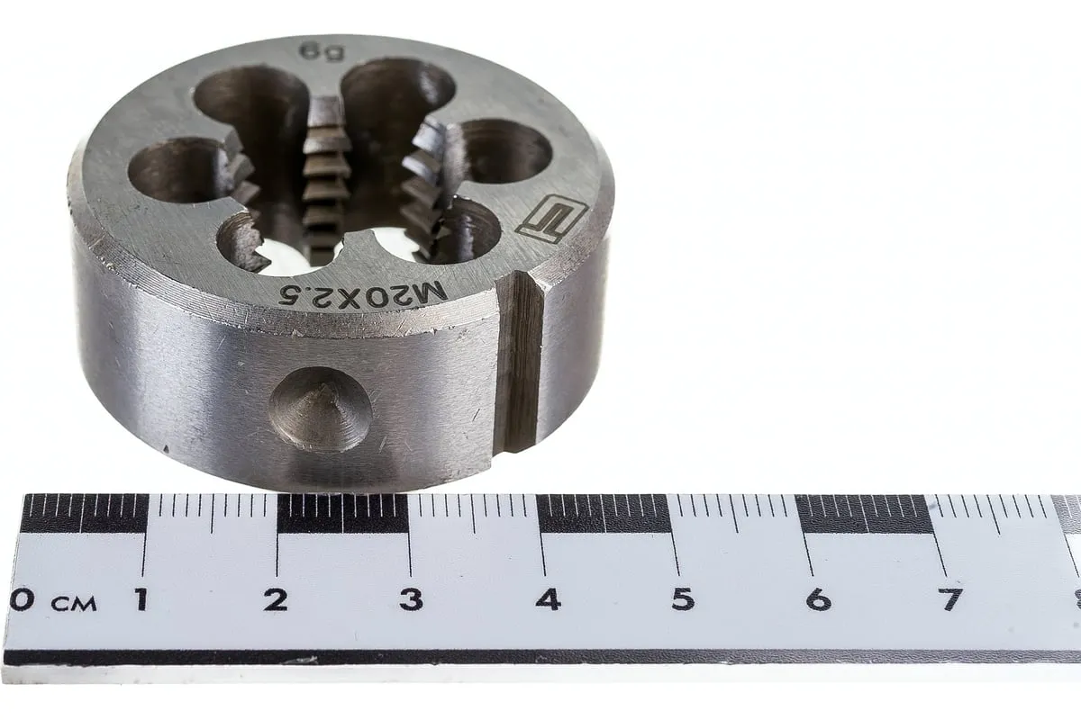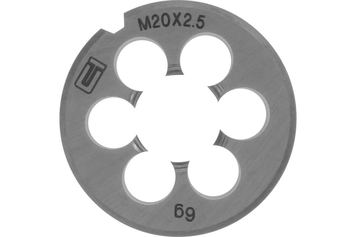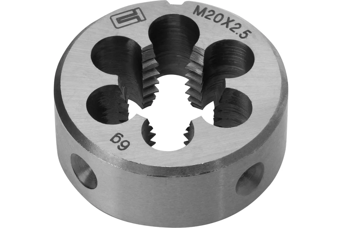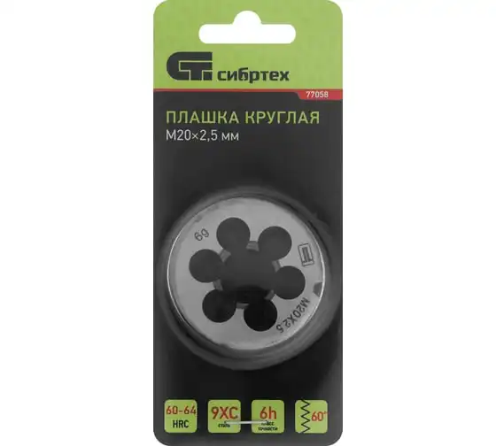 Плашка М20х2.5 мм СИБРТЕХ 77058 применяется в цехах или слесарных мастерских в качестве приспособления для нанесения внешней резьбы на металлические заготовки. Изделие обладает повышенным рабочим ресурсом и подходит для частого использования за счет прочности материала - инструментальной стали. Режущие кромки обладают твердостью 60 HRc, что соответствует ГОСТу.