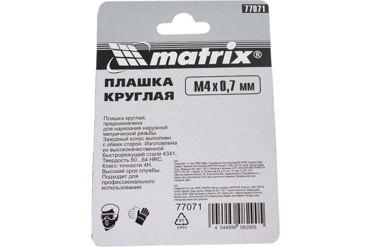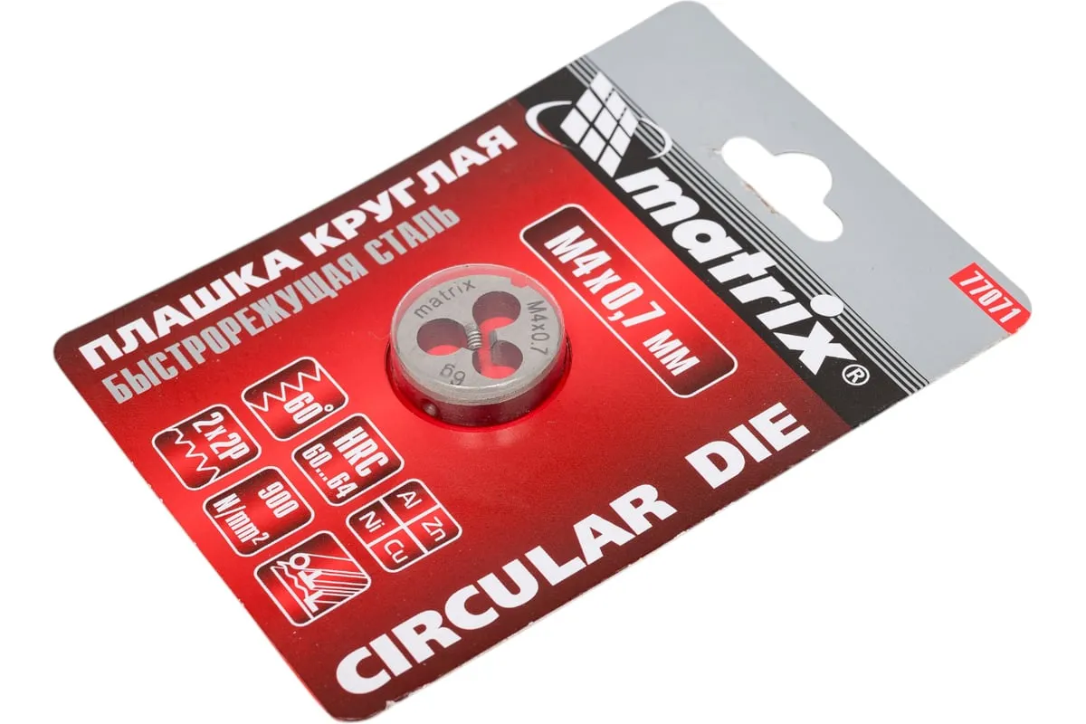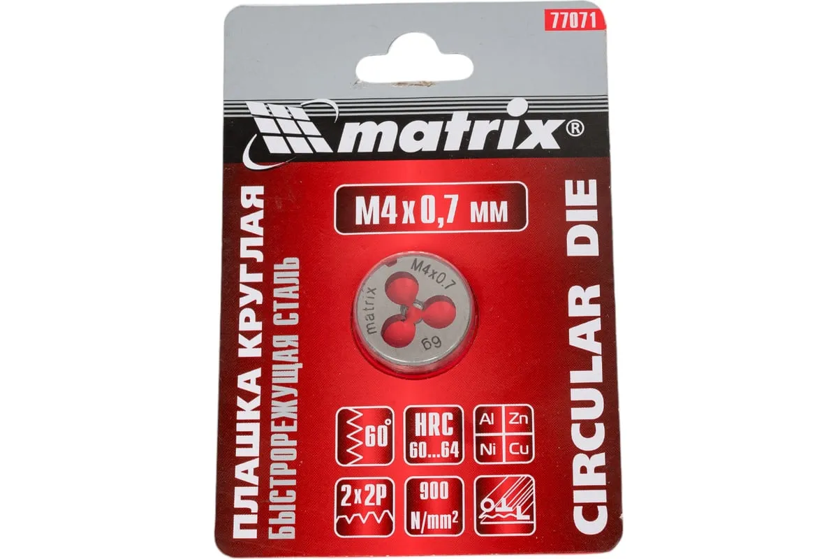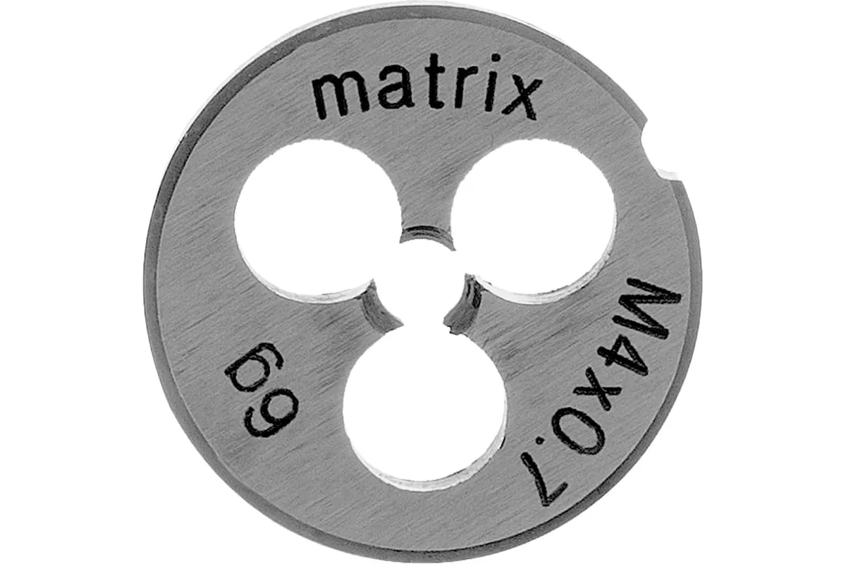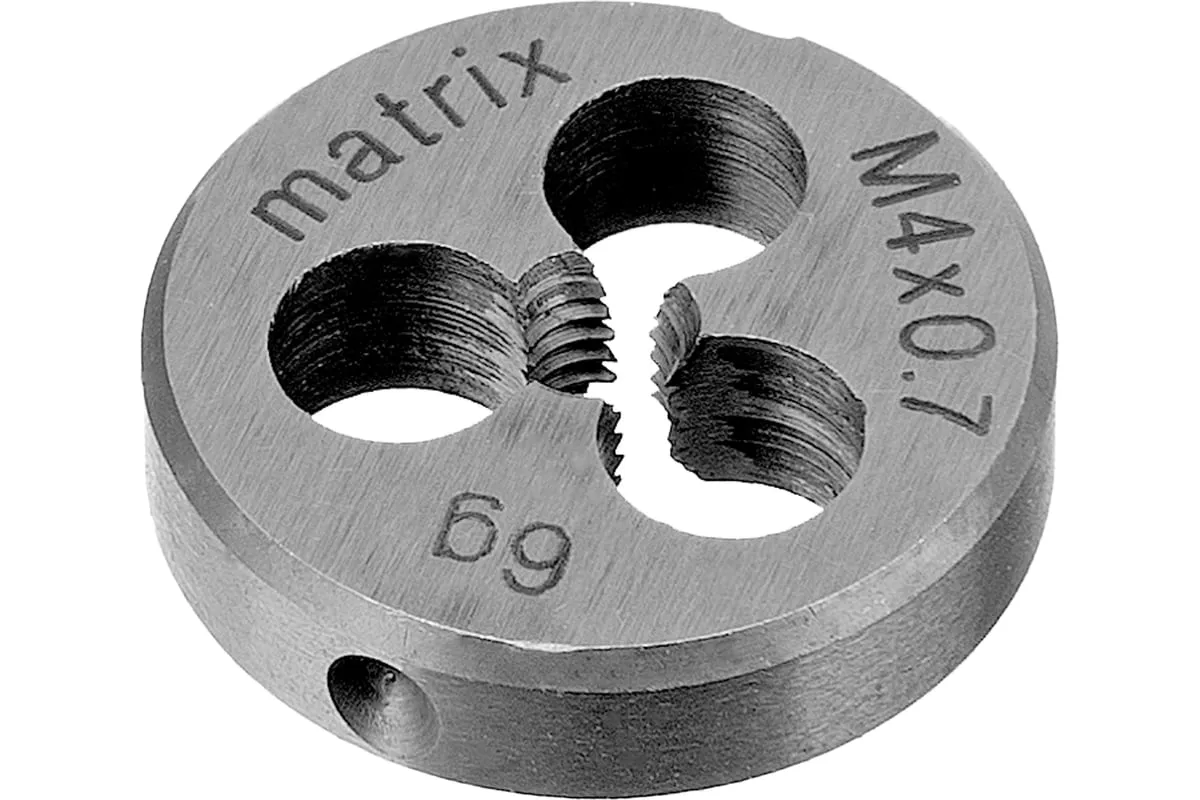 Плашка М4х0.7 мм MATRIX 77071 - это приспособление, которое служит для нарезания внешней резьбы. Рабочие кромки выполнены из быстрорежущей стали, марки Р6М5 и имеют твердость 60 HRc. Изделие прослужит долгое время, подходит для частого и интенсивного использования.