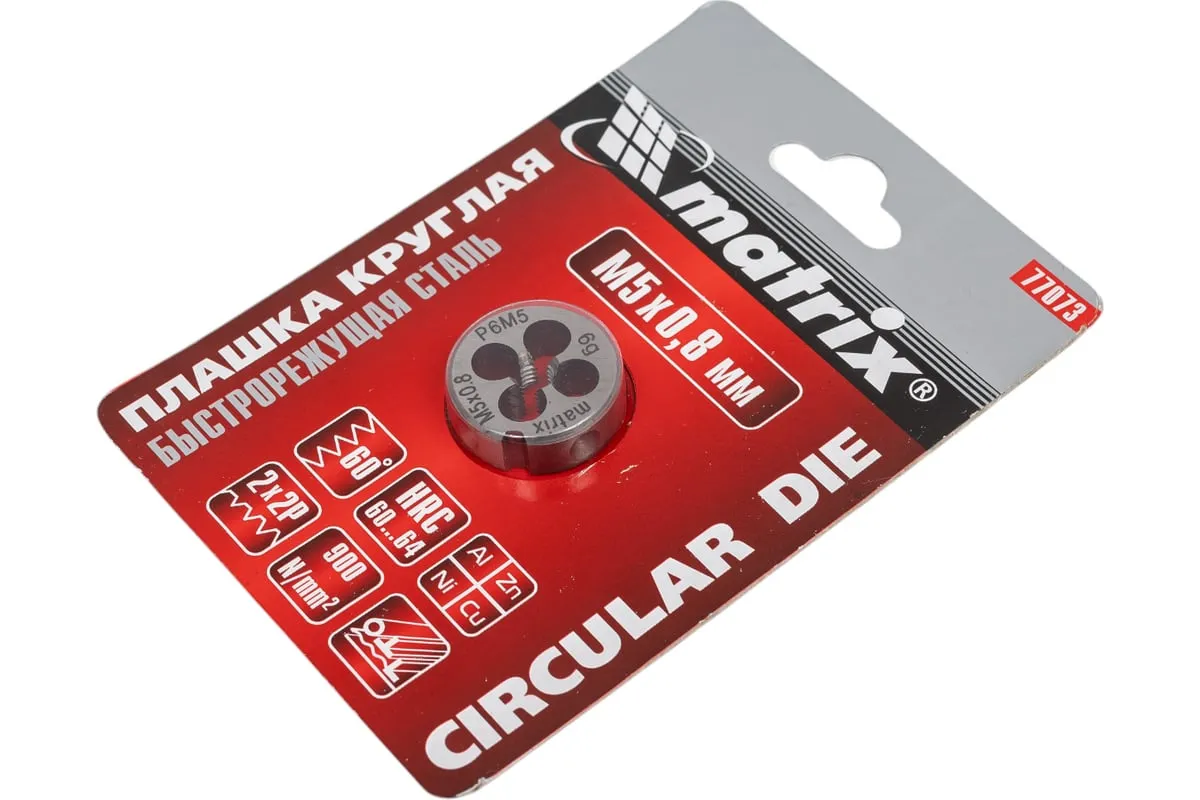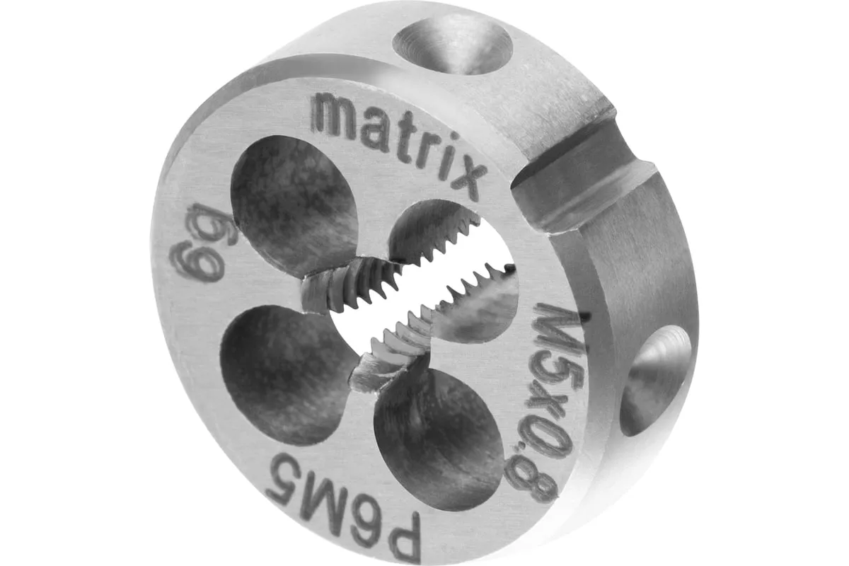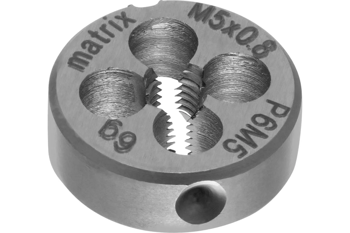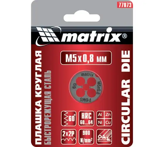 Плашка М5х0.8 мм MATRIX 77073 изготовлена из быстрорежущей стали и обладает высокой прочностью, устойчива к износу. Данный предмет служит для нанесения наружной резьбы на деталь.