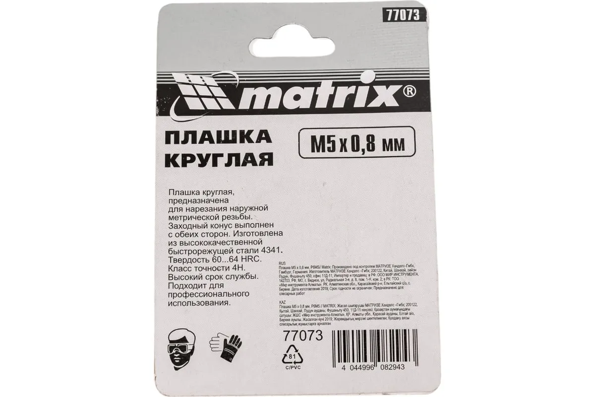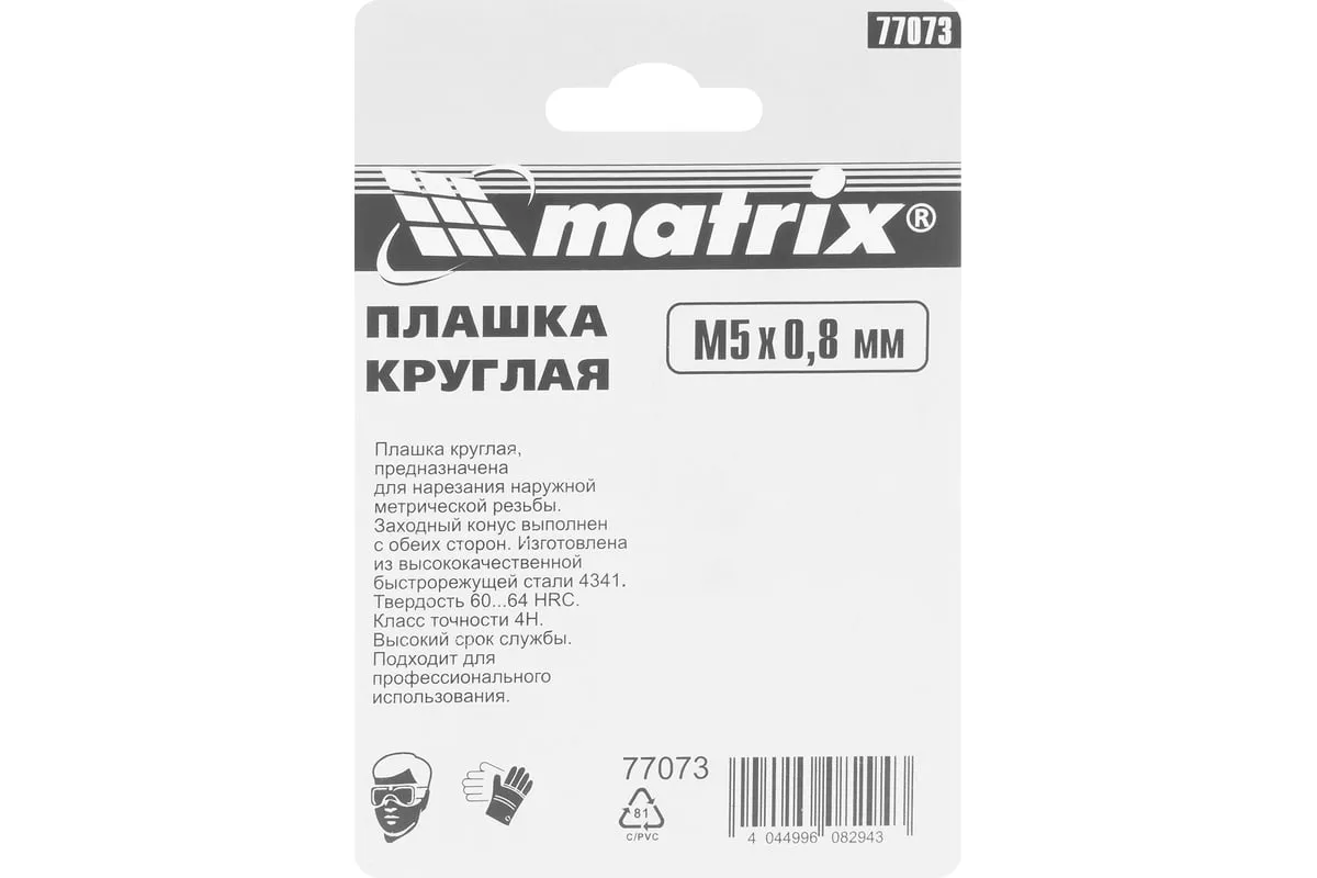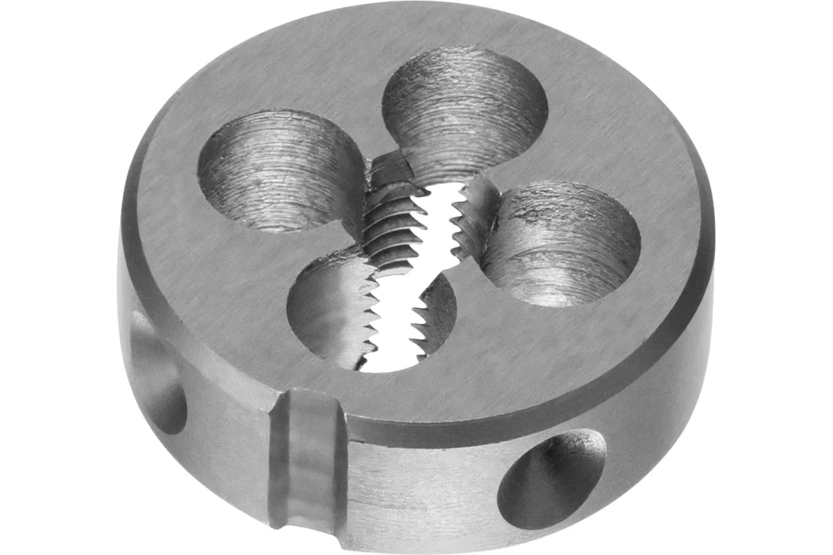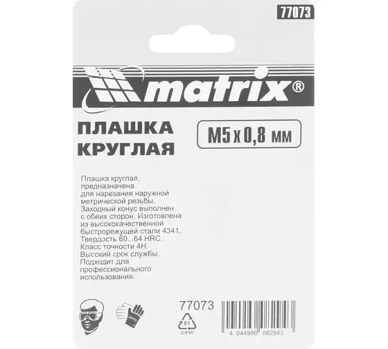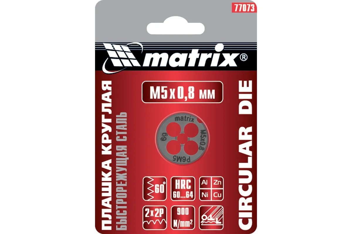Плашка М5х0.8 мм MATRIX 77073 изготовлена из быстрорежущей стали и обладает высокой прочностью, устойчива к износу. Данный предмет служит для нанесения наружной резьбы на деталь.