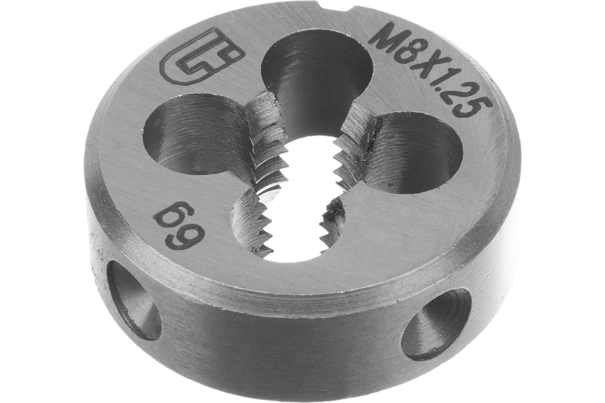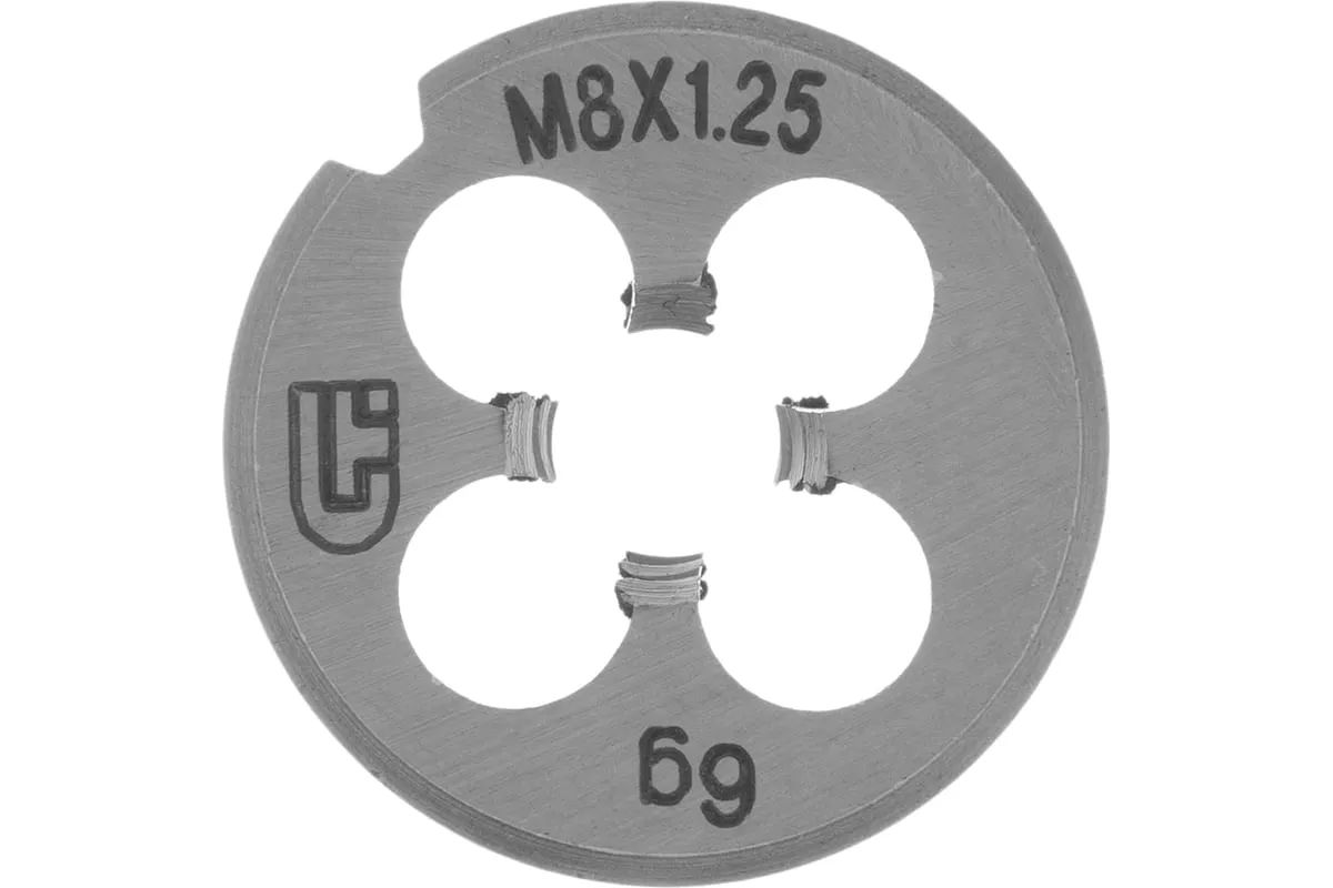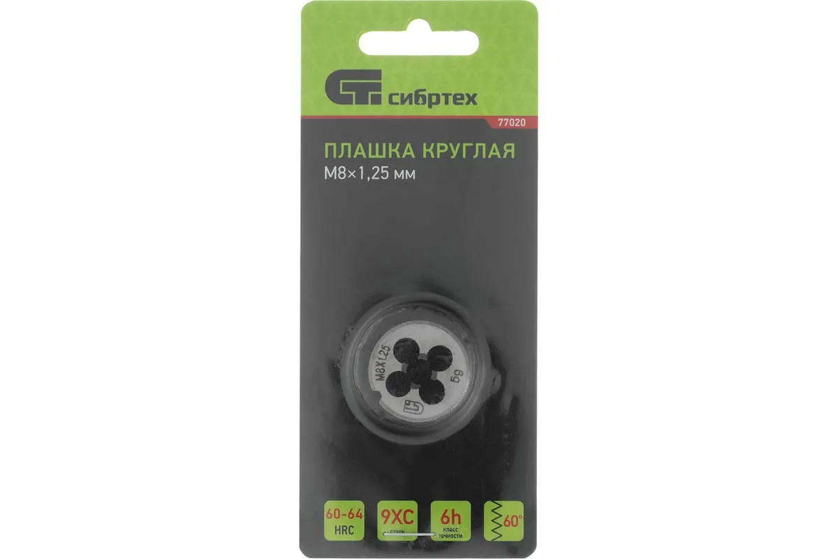 Плашка М8 х 1,25 мм СИБРТЕХ 77020 - металлорежущий инструмент для получения внешней резьбы на изделиях. Рабочие кромки имеют твердость 60 HRc, что соответствует нормам ГОСТа. Данная плашка подходит для нарезания резьбы 8 мм с шагом 1.25 мм.