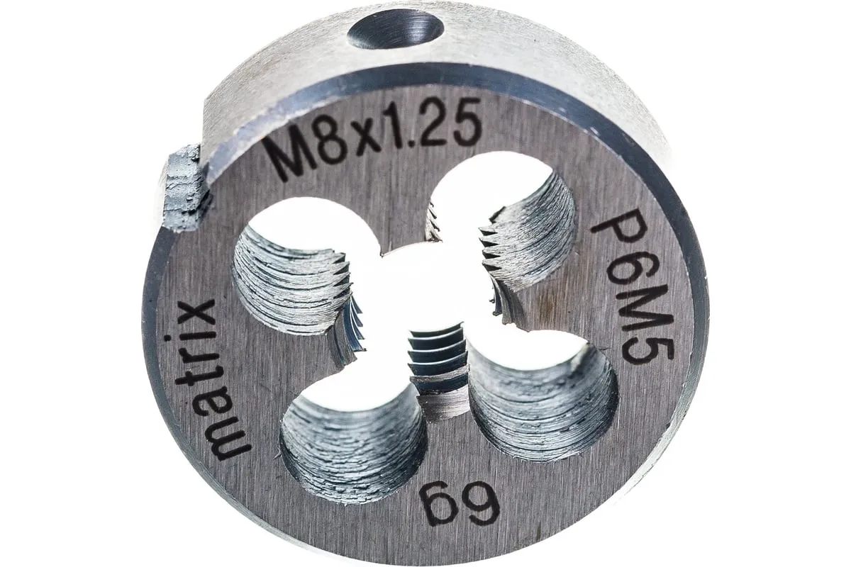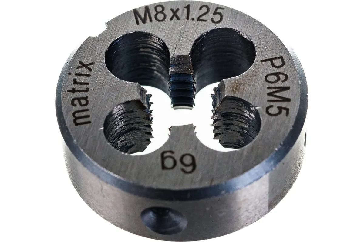 Плашка М8х1.25 мм MATRIX 77077 пригодится в мастерской или на производстве для нарезания внешней резьбы. Данное приспособление изготовлено из прочной быстрорежущей стали, поэтому обладает высокой износостойкостью.