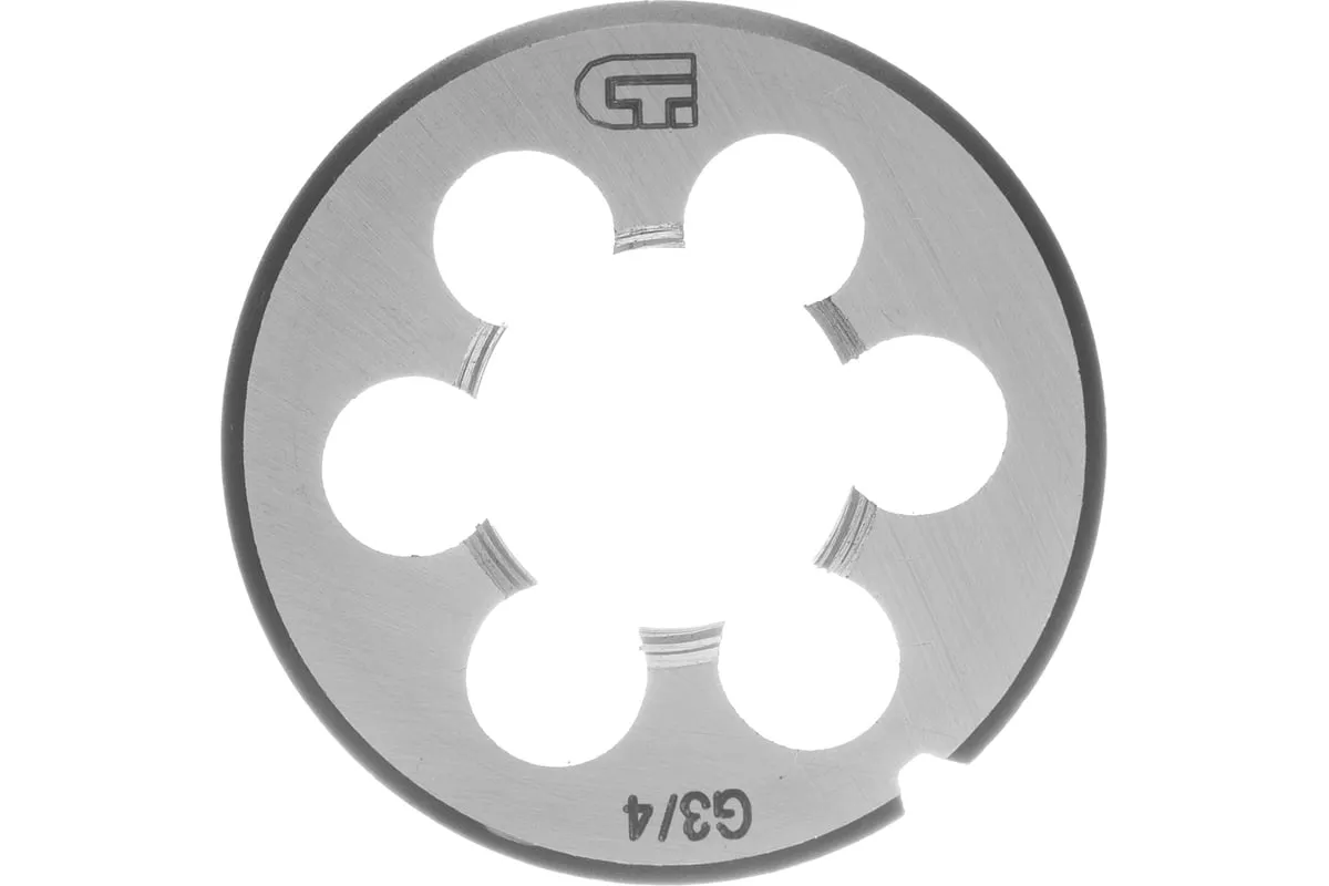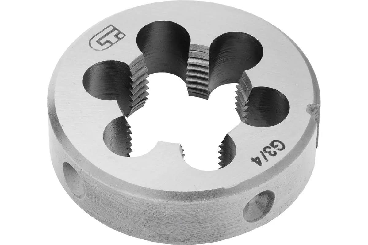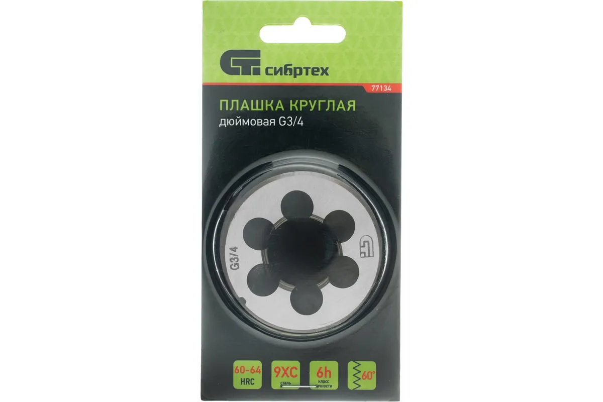 Плашка СИБРТЕХ 77134 обладает цельнометаллической конструкцией. Материал, из которого изготовлено данное приспособление, - сталь марки 9XC. Плашка служит для нарезания наружной трубной резьбы размером 3/4 дюйма.