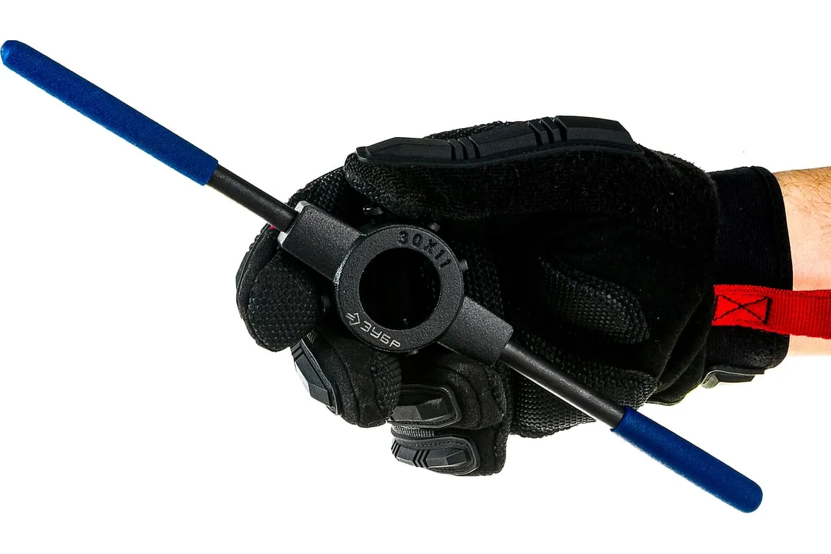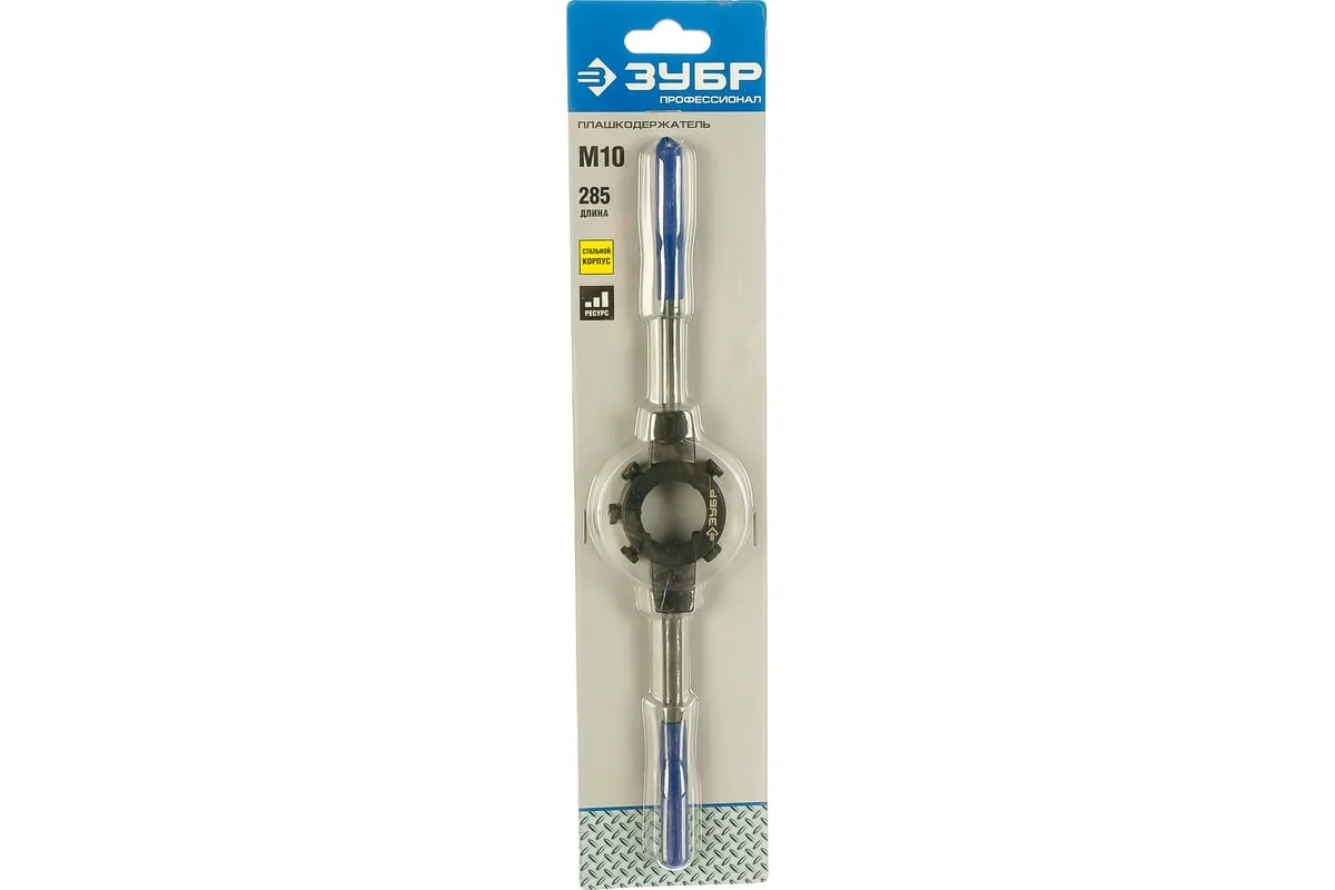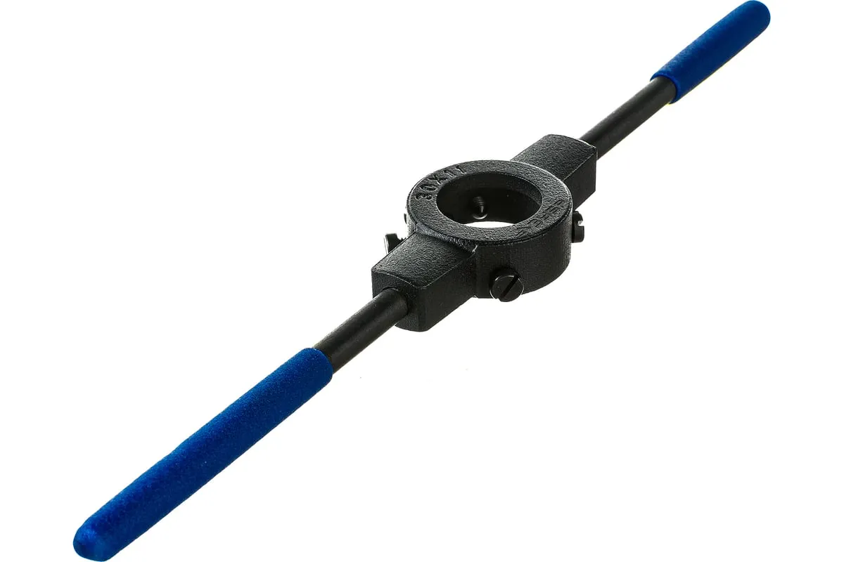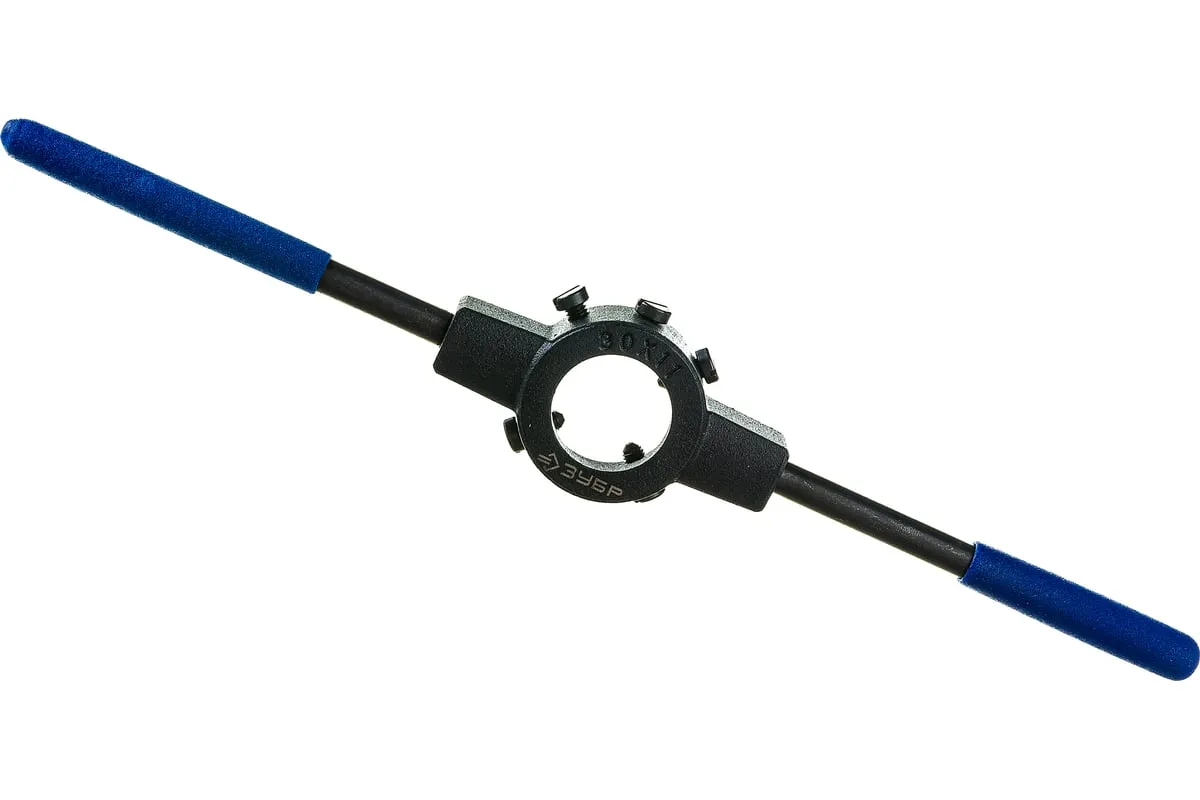 Плашкодержатель со стопорными винтами ЗУБР "ПРОФЕССИОНАЛ" 28150-30 выполнен из прочной стали с парооксидированием для защиты от коррозии. Резиновые накладки на рукоятках уменьшают скольжение. Модель подойдет для М10.